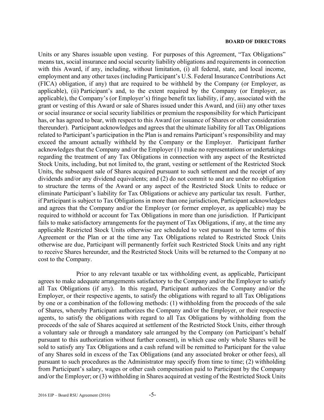 BOARD OF DIRECTORS 2016 EIP – Board RSU Agreement (2016) -5- Units or any Shares issuable upon vesting. For purposes of this Agreement, “Tax Obligations” means tax, social insurance and social security liability obligations and requirements in connection with this Award, if any, including, without limitation, (i) all federal, state, and local income, employment and any other taxes (including Participant’s U.S. Federal Insurance Contributions Act (FICA) obligation, if any) that are required to be withheld by the Company (or Employer, as applicable), (ii) Participant’s and, to the extent required by the Company (or Employer, as applicable), the Company’s (or Employer’s) fringe benefit tax liability, if any, associated with the grant or vesting of this Award or sale of Shares issued under this Award, and (iii) any other taxes or social insurance or social security liabilities or premium the responsibility for which Participant has, or has agreed to bear, with respect to this Award (or issuance of Shares or other consideration thereunder). Participant acknowledges and agrees that the ultimate liability for all Tax Obligations related to Participant’s participation in the Plan is and remains Participant’s responsibility and may exceed the amount actually withheld by the Company or the Employer. Participant further acknowledges that the Company and/or the Employer (1) make no representations or undertakings regarding the treatment of any Tax Obligations in connection with any aspect of the Restricted Stock Units, including, but not limited to, the grant, vesting or settlement of the Restricted Stock Units, the subsequent sale of Shares acquired pursuant to such settlement and the receipt of any dividends and/or any dividend equivalents; and (2) do not commit to and are under no obligation to structure the terms of the Award or any aspect of the Restricted Stock Units to reduce or eliminate Participant’s liability for Tax Obligations or achieve any particular tax result. Further, if Participant is subject to Tax Obligations in more than one jurisdiction, Participant acknowledges and agrees that the Company and/or the Employer (or former employer, as applicable) may be required to withhold or account for Tax Obligations in more than one jurisdiction. If Participant fails to make satisfactory arrangements for the payment of Tax Obligations, if any, at the time any applicable Restricted Stock Units otherwise are scheduled to vest pursuant to the terms of this Agreement or the Plan or at the time any Tax Obligations related to Restricted Stock Units otherwise are due, Participant will permanently forfeit such Restricted Stock Units and any right to receive Shares hereunder, and the Restricted Stock Units will be returned to the Company at no cost to the Company. Prior to any relevant taxable or tax withholding event, as applicable, Participant agrees to make adequate arrangements satisfactory to the Company and/or the Employer to satisfy all Tax Obligations (if any). In this regard, Participant authorizes the Company and/or the Employer, or their respective agents, to satisfy the obligations with regard to all Tax Obligations by one or a combination of the following methods: (1) withholding from the proceeds of the sale of Shares, whereby Participant authorizes the Company and/or the Employer, or their respective agents, to satisfy the obligations with regard to all Tax Obligations by withholding from the proceeds of the sale of Shares acquired at settlement of the Restricted Stock Units, either through a voluntary sale or through a mandatory sale arranged by the Company (on Participant’s behalf pursuant to this authorization without further consent), in which case only whole Shares will be sold to satisfy any Tax Obligations and a cash refund will be remitted to Participant for the value of any Shares sold in excess of the Tax Obligations (and any associated broker or other fees), all pursuant to such procedures as the Administrator may specify from time to time; (2) withholding from Participant’s salary, wages or other cash compensation paid to Participant by the Company and/or the Employer; or (3) withholding in Shares acquired at vesting of the Restricted Stock Units