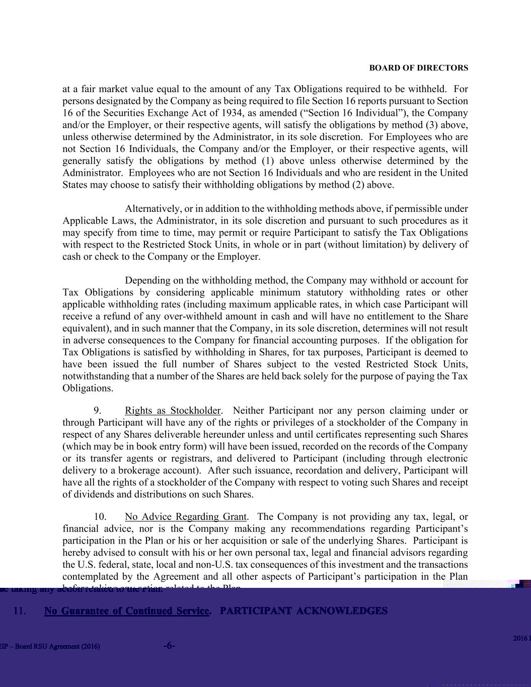 BOARD OF DIRECTORS 2016 EIP – Board RSU Agreement (2016) -6- at a fair market value equal to the amount of any Tax Obligations required to be withheld. For persons designated by the Company as being required to file Section 16 reports pursuant to Section 16 of the Securities Exchange Act of 1934, as amended (“Section 16 Individual”), the Company and/or the Employer, or their respective agents, will satisfy the obligations by method (3) above, unless otherwise determined by the Administrator, in its sole discretion. For Employees who are not Section 16 Individuals, the Company and/or the Employer, or their respective agents, will generally satisfy the obligations by method (1) above unless otherwise determined by the Administrator. Employees who are not Section 16 Individuals and who are resident in the United States may choose to satisfy their withholding obligations by method (2) above. Alternatively, or in addition to the withholding methods above, if permissible under Applicable Laws, the Administrator, in its sole discretion and pursuant to such procedures as it may specify from time to time, may permit or require Participant to satisfy the Tax Obligations with respect to the Restricted Stock Units, in whole or in part (without limitation) by delivery of cash or check to the Company or the Employer. Depending on the withholding method, the Company may withhold or account for Tax Obligations by considering applicable minimum statutory withholding rates or other applicable withholding rates (including maximum applicable rates, in which case Participant will receive a refund of any over-withheld amount in cash and will have no entitlement to the Share equivalent), and in such manner that the Company, in its sole discretion, determines will not result in adverse consequences to the Company for financial accounting purposes. If the obligation for Tax Obligations is satisfied by withholding in Shares, for tax purposes, Participant is deemed to have been issued the full number of Shares subject to the vested Restricted Stock Units, notwithstanding that a number of the Shares are held back solely for the purpose of paying the Tax Obligations. 9. Rights as Stockholder. Neither Participant nor any person claiming under or through Participant will have any of the rights or privileges of a stockholder of the Company in respect of any Shares deliverable hereunder unless and until certificates representing such Shares (which may be in book entry form) will have been issued, recorded on the records of the Company or its transfer agents or registrars, and delivered to Participant (including through electronic delivery to a brokerage account). After such issuance, recordation and delivery, Participant will have all the rights of a stockholder of the Company with respect to voting such Shares and receipt of dividends and distributions on such Shares. 10. No Advice Regarding Grant. The Company is not providing any tax, legal, or financial advice, nor is the Company making any recommendations regarding Participant’s participation in the Plan or his or her acquisition or sale of the underlying Shares. Participant is hereby advised to consult with his or her own personal tax, legal and financial advisors regarding the U.S. federal, state, local and non-U.S. tax consequences of this investment and the transactions contemplated by the Agreement and all other aspects of Participant’s participation in the Plan before taking any action related to the Plan. 11. No Guarantee of Continued Service. PARTICIPANT ACKNOWLEDGES