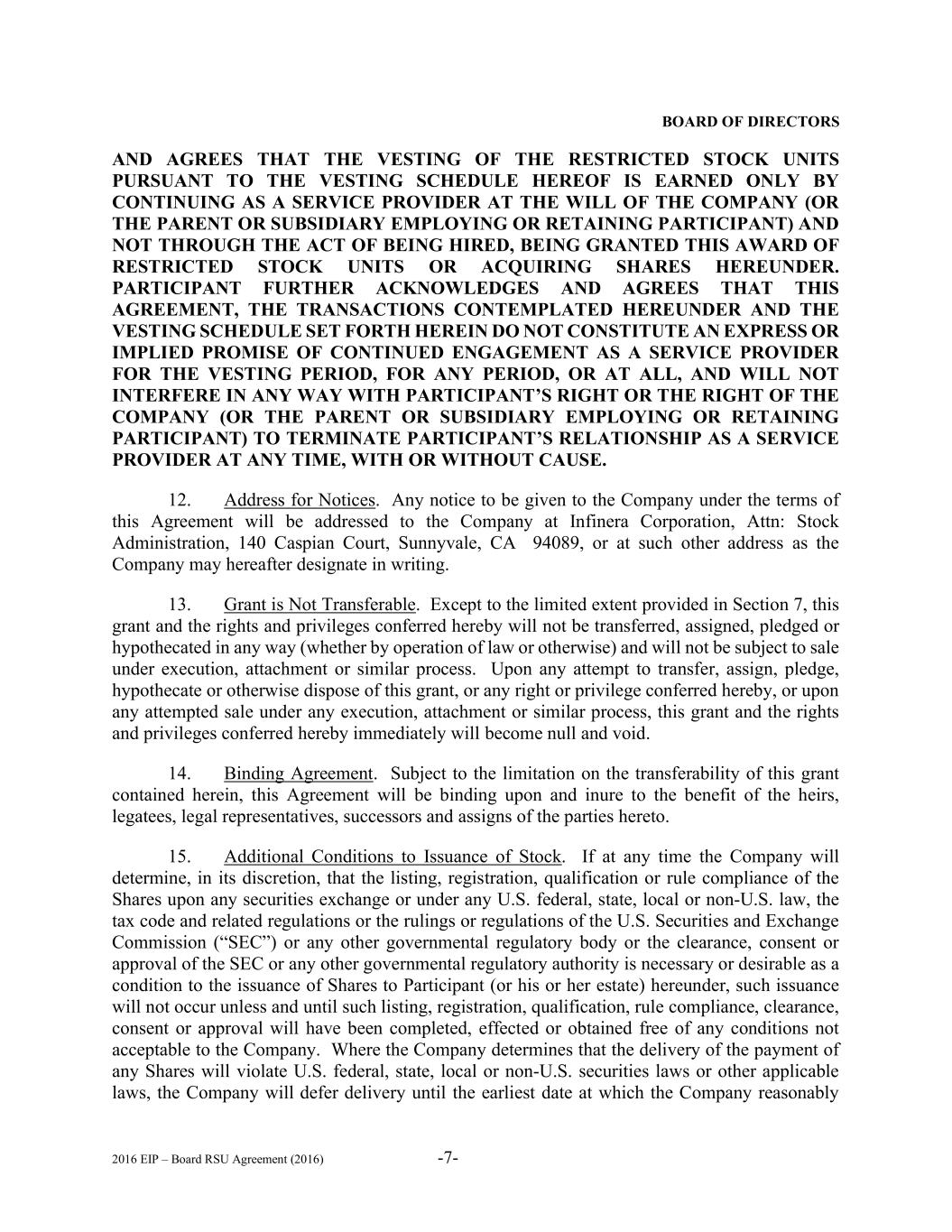 BOARD OF DIRECTORS 2016 EIP – Board RSU Agreement (2016) -7- AND AGREES THAT THE VESTING OF THE RESTRICTED STOCK UNITS PURSUANT TO THE VESTING SCHEDULE HEREOF IS EARNED ONLY BY CONTINUING AS A SERVICE PROVIDER AT THE WILL OF THE COMPANY (OR THE PARENT OR SUBSIDIARY EMPLOYING OR RETAINING PARTICIPANT) AND NOT THROUGH THE ACT OF BEING HIRED, BEING GRANTED THIS AWARD OF RESTRICTED STOCK UNITS OR ACQUIRING SHARES HEREUNDER. PARTICIPANT FURTHER ACKNOWLEDGES AND AGREES THAT THIS AGREEMENT, THE TRANSACTIONS CONTEMPLATED HEREUNDER AND THE VESTING SCHEDULE SET FORTH HEREIN DO NOT CONSTITUTE AN EXPRESS OR IMPLIED PROMISE OF CONTINUED ENGAGEMENT AS A SERVICE PROVIDER FOR THE VESTING PERIOD, FOR ANY PERIOD, OR AT ALL, AND WILL NOT INTERFERE IN ANY WAY WITH PARTICIPANT’S RIGHT OR THE RIGHT OF THE COMPANY (OR THE PARENT OR SUBSIDIARY EMPLOYING OR RETAINING PARTICIPANT) TO TERMINATE PARTICIPANT’S RELATIONSHIP AS A SERVICE PROVIDER AT ANY TIME, WITH OR WITHOUT CAUSE. 12. Address for Notices. Any notice to be given to the Company under the terms of this Agreement will be addressed to the Company at Infinera Corporation, Attn: Stock Administration, 140 Caspian Court, Sunnyvale, CA 94089, or at such other address as the Company may hereafter designate in writing. 13. Grant is Not Transferable. Except to the limited extent provided in Section 7, this grant and the rights and privileges conferred hereby will not be transferred, assigned, pledged or hypothecated in any way (whether by operation of law or otherwise) and will not be subject to sale under execution, attachment or similar process. Upon any attempt to transfer, assign, pledge, hypothecate or otherwise dispose of this grant, or any right or privilege conferred hereby, or upon any attempted sale under any execution, attachment or similar process, this grant and the rights and privileges conferred hereby immediately will become null and void. 14. Binding Agreement. Subject to the limitation on the transferability of this grant contained herein, this Agreement will be binding upon and inure to the benefit of the heirs, legatees, legal representatives, successors and assigns of the parties hereto. 15. Additional Conditions to Issuance of Stock. If at any time the Company will determine, in its discretion, that the listing, registration, qualification or rule compliance of the Shares upon any securities exchange or under any U.S. federal, state, local or non-U.S. law, the tax code and related regulations or the rulings or regulations of the U.S. Securities and Exchange Commission (“SEC”) or any other governmental regulatory body or the clearance, consent or approval of the SEC or any other governmental regulatory authority is necessary or desirable as a condition to the issuance of Shares to Participant (or his or her estate) hereunder, such issuance will not occur unless and until such listing, registration, qualification, rule compliance, clearance, consent or approval will have been completed, effected or obtained free of any conditions not acceptable to the Company. Where the Company determines that the delivery of the payment of any Shares will violate U.S. federal, state, local or non-U.S. securities laws or other applicable laws, the Company will defer delivery until the earliest date at which the Company reasonably