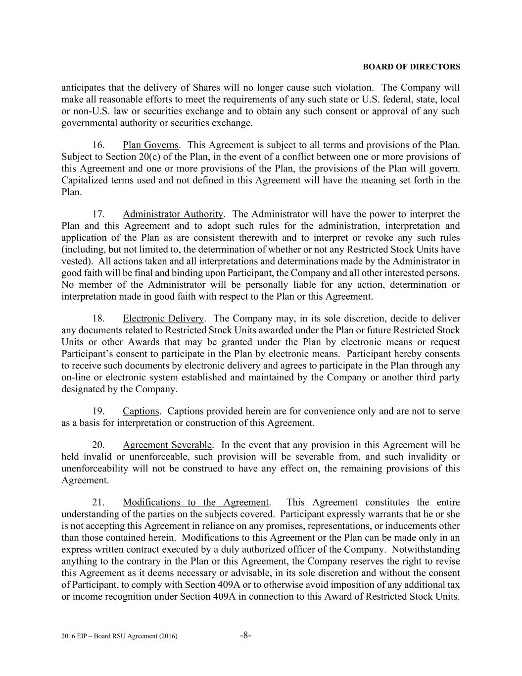 BOARD OF DIRECTORS 2016 EIP – Board RSU Agreement (2016) -8- anticipates that the delivery of Shares will no longer cause such violation. The Company will make all reasonable efforts to meet the requirements of any such state or U.S. federal, state, local or non-U.S. law or securities exchange and to obtain any such consent or approval of any such governmental authority or securities exchange. 16. Plan Governs. This Agreement is subject to all terms and provisions of the Plan. Subject to Section 20(c) of the Plan, in the event of a conflict between one or more provisions of this Agreement and one or more provisions of the Plan, the provisions of the Plan will govern. Capitalized terms used and not defined in this Agreement will have the meaning set forth in the Plan. 17. Administrator Authority. The Administrator will have the power to interpret the Plan and this Agreement and to adopt such rules for the administration, interpretation and application of the Plan as are consistent therewith and to interpret or revoke any such rules (including, but not limited to, the determination of whether or not any Restricted Stock Units have vested). All actions taken and all interpretations and determinations made by the Administrator in good faith will be final and binding upon Participant, the Company and all other interested persons. No member of the Administrator will be personally liable for any action, determination or interpretation made in good faith with respect to the Plan or this Agreement. 18. Electronic Delivery. The Company may, in its sole discretion, decide to deliver any documents related to Restricted Stock Units awarded under the Plan or future Restricted Stock Units or other Awards that may be granted under the Plan by electronic means or request Participant’s consent to participate in the Plan by electronic means. Participant hereby consents to receive such documents by electronic delivery and agrees to participate in the Plan through any on-line or electronic system established and maintained by the Company or another third party designated by the Company. 19. Captions. Captions provided herein are for convenience only and are not to serve as a basis for interpretation or construction of this Agreement. 20. Agreement Severable. In the event that any provision in this Agreement will be held invalid or unenforceable, such provision will be severable from, and such invalidity or unenforceability will not be construed to have any effect on, the remaining provisions of this Agreement. 21. Modifications to the Agreement. This Agreement constitutes the entire understanding of the parties on the subjects covered. Participant expressly warrants that he or she is not accepting this Agreement in reliance on any promises, representations, or inducements other than those contained herein. Modifications to this Agreement or the Plan can be made only in an express written contract executed by a duly authorized officer of the Company. Notwithstanding anything to the contrary in the Plan or this Agreement, the Company reserves the right to revise this Agreement as it deems necessary or advisable, in its sole discretion and without the consent of Participant, to comply with Section 409A or to otherwise avoid imposition of any additional tax or income recognition under Section 409A in connection to this Award of Restricted Stock Units.