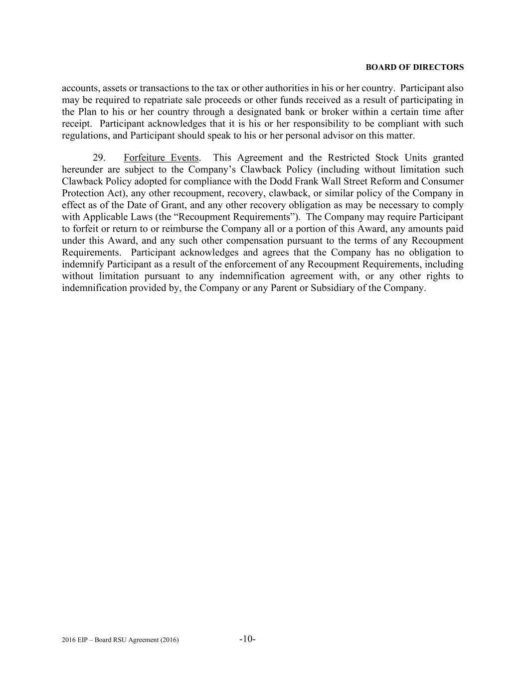 BOARD OF DIRECTORS 2016 EIP – Board RSU Agreement (2016) -10- accounts, assets or transactions to the tax or other authorities in his or her country. Participant also may be required to repatriate sale proceeds or other funds received as a result of participating in the Plan to his or her country through a designated bank or broker within a certain time after receipt. Participant acknowledges that it is his or her responsibility to be compliant with such regulations, and Participant should speak to his or her personal advisor on this matter. 29. Forfeiture Events. This Agreement and the Restricted Stock Units granted hereunder are subject to the Company’s Clawback Policy (including without limitation such Clawback Policy adopted for compliance with the Dodd Frank Wall Street Reform and Consumer Protection Act), any other recoupment, recovery, clawback, or similar policy of the Company in effect as of the Date of Grant, and any other recovery obligation as may be necessary to comply with Applicable Laws (the “Recoupment Requirements”). The Company may require Participant to forfeit or return to or reimburse the Company all or a portion of this Award, any amounts paid under this Award, and any such other compensation pursuant to the terms of any Recoupment Requirements. Participant acknowledges and agrees that the Company has no obligation to indemnify Participant as a result of the enforcement of any Recoupment Requirements, including without limitation pursuant to any indemnification agreement with, or any other rights to indemnification provided by, the Company or any Parent or Subsidiary of the Company.
