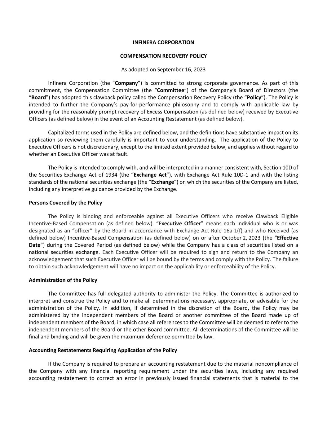 INFINERA CORPORATION COMPENSATION RECOVERY POLICY As adopted on September 16, 2023 Infinera Corporation (the “Company”) is committed to strong corporate governance. As part of this commitment, the Compensation Committee (the “Committee”) of the Company’s Board of Directors (the “Board”) has adopted this clawback policy called the Compensation Recovery Policy (the “Policy”). The Policy is intended to further the Company’s pay-for-performance philosophy and to comply with applicable law by providing for the reasonably prompt recovery of Excess Compensation (as defined below) received by Executive Officers (as defined below) in the event of an Accounting Restatement (as defined below). Capitalized terms used in the Policy are defined below, and the definitions have substantive impact on its application so reviewing them carefully is important to your understanding. The application of the Policy to Executive Officers is not discretionary, except to the limited extent provided below, and applies without regard to whether an Executive Officer was at fault. The Policy is intended to comply with, and will be interpreted in a manner consistent with, Section 10D of the Securities Exchange Act of 1934 (the “Exchange Act”), with Exchange Act Rule 10D-1 and with the listing standards of the national securities exchange (the “Exchange”) on which the securities of the Company are listed, including any interpretive guidance provided by the Exchange. Persons Covered by the Policy The Policy is binding and enforceable against all Executive Officers who receive Clawback Eligible Incentive-Based Compensation (as defined below). “Executive Officer” means each individual who is or was designated as an “officer” by the Board in accordance with Exchange Act Rule 16a-1(f) and who Received (as defined below) Incentive-Based Compensation (as defined below) on or after October 2, 2023 (the “Effective Date”) during the Covered Period (as defined below) while the Company has a class of securities listed on a national securities exchange. Each Executive Officer will be required to sign and return to the Company an acknowledgement that such Executive Officer will be bound by the terms and comply with the Policy. The failure to obtain such acknowledgement will have no impact on the applicability or enforceability of the Policy. Administration of the Policy The Committee has full delegated authority to administer the Policy. The Committee is authorized to interpret and construe the Policy and to make all determinations necessary, appropriate, or advisable for the administration of the Policy. In addition, if determined in the discretion of the Board, the Policy may be administered by the independent members of the Board or another committee of the Board made up of independent members of the Board, in which case all references to the Committee will be deemed to refer to the independent members of the Board or the other Board committee. All determinations of the Committee will be final and binding and will be given the maximum deference permitted by law. Accounting Restatements Requiring Application of the Policy If the Company is required to prepare an accounting restatement due to the material noncompliance of the Company with any financial reporting requirement under the securities laws, including any required accounting restatement to correct an error in previously issued financial statements that is material to the