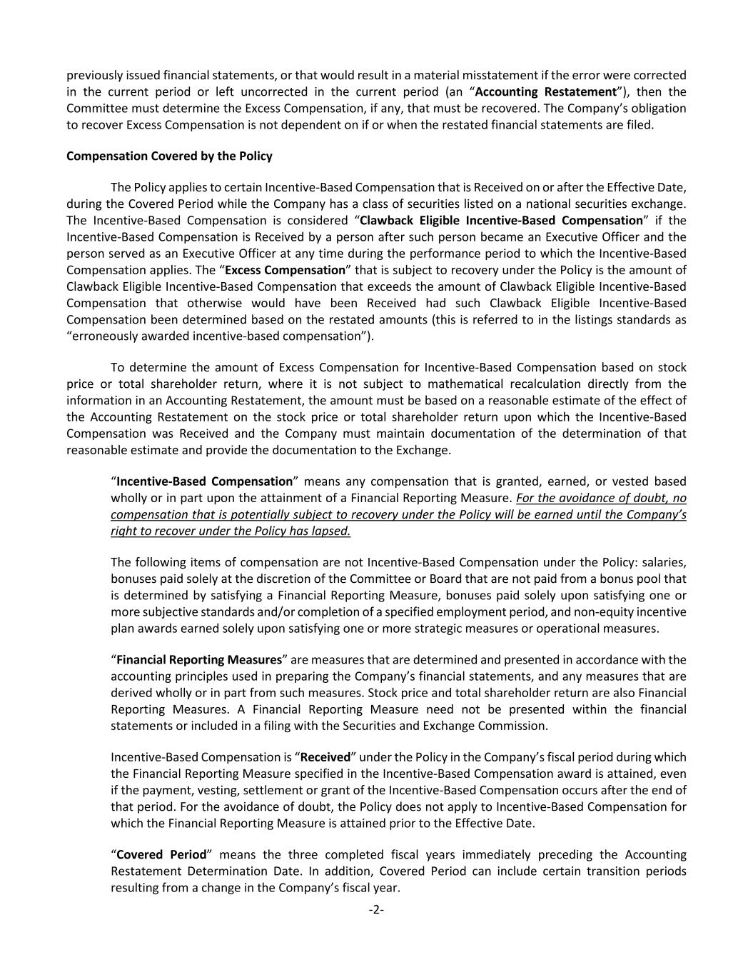 -2- previously issued financial statements, or that would result in a material misstatement if the error were corrected in the current period or left uncorrected in the current period (an “Accounting Restatement”), then the Committee must determine the Excess Compensation, if any, that must be recovered. The Company’s obligation to recover Excess Compensation is not dependent on if or when the restated financial statements are filed. Compensation Covered by the Policy The Policy applies to certain Incentive-Based Compensation that is Received on or after the Effective Date, during the Covered Period while the Company has a class of securities listed on a national securities exchange. The Incentive-Based Compensation is considered “Clawback Eligible Incentive-Based Compensation” if the Incentive-Based Compensation is Received by a person after such person became an Executive Officer and the person served as an Executive Officer at any time during the performance period to which the Incentive-Based Compensation applies. The “Excess Compensation” that is subject to recovery under the Policy is the amount of Clawback Eligible Incentive-Based Compensation that exceeds the amount of Clawback Eligible Incentive-Based Compensation that otherwise would have been Received had such Clawback Eligible Incentive-Based Compensation been determined based on the restated amounts (this is referred to in the listings standards as “erroneously awarded incentive-based compensation”). To determine the amount of Excess Compensation for Incentive-Based Compensation based on stock price or total shareholder return, where it is not subject to mathematical recalculation directly from the information in an Accounting Restatement, the amount must be based on a reasonable estimate of the effect of the Accounting Restatement on the stock price or total shareholder return upon which the Incentive-Based Compensation was Received and the Company must maintain documentation of the determination of that reasonable estimate and provide the documentation to the Exchange. “Incentive-Based Compensation” means any compensation that is granted, earned, or vested based wholly or in part upon the attainment of a Financial Reporting Measure. For the avoidance of doubt, no compensation that is potentially subject to recovery under the Policy will be earned until the Company’s right to recover under the Policy has lapsed. The following items of compensation are not Incentive-Based Compensation under the Policy: salaries, bonuses paid solely at the discretion of the Committee or Board that are not paid from a bonus pool that is determined by satisfying a Financial Reporting Measure, bonuses paid solely upon satisfying one or more subjective standards and/or completion of a specified employment period, and non-equity incentive plan awards earned solely upon satisfying one or more strategic measures or operational measures. “Financial Reporting Measures” are measures that are determined and presented in accordance with the accounting principles used in preparing the Company’s financial statements, and any measures that are derived wholly or in part from such measures. Stock price and total shareholder return are also Financial Reporting Measures. A Financial Reporting Measure need not be presented within the financial statements or included in a filing with the Securities and Exchange Commission. Incentive-Based Compensation is “Received” under the Policy in the Company’s fiscal period during which the Financial Reporting Measure specified in the Incentive-Based Compensation award is attained, even if the payment, vesting, settlement or grant of the Incentive-Based Compensation occurs after the end of that period. For the avoidance of doubt, the Policy does not apply to Incentive-Based Compensation for which the Financial Reporting Measure is attained prior to the Effective Date. “Covered Period” means the three completed fiscal years immediately preceding the Accounting Restatement Determination Date. In addition, Covered Period can include certain transition periods resulting from a change in the Company’s fiscal year.