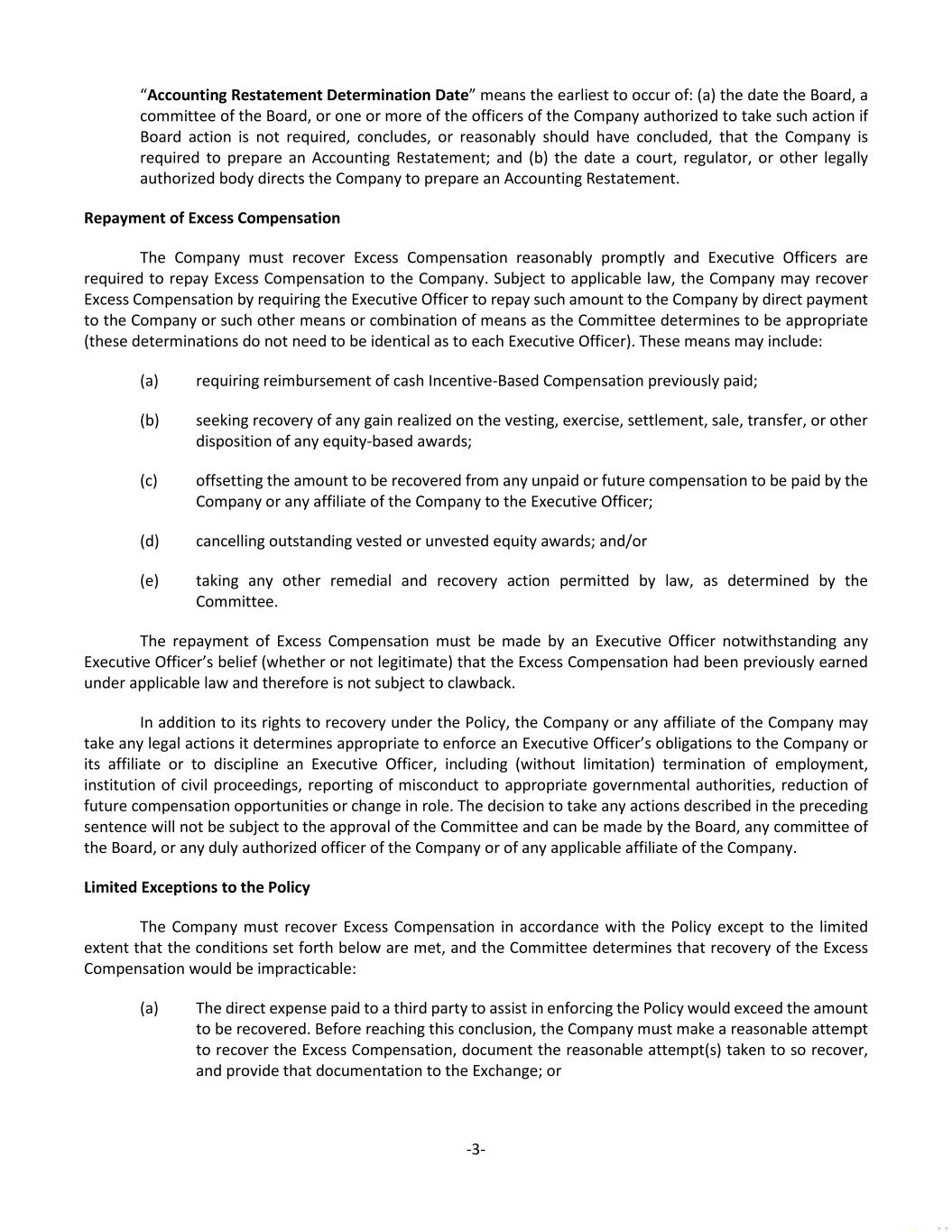 -3- “Accounting Restatement Determination Date” means the earliest to occur of: (a) the date the Board, a committee of the Board, or one or more of the officers of the Company authorized to take such action if Board action is not required, concludes, or reasonably should have concluded, that the Company is required to prepare an Accounting Restatement; and (b) the date a court, regulator, or other legally authorized body directs the Company to prepare an Accounting Restatement. Repayment of Excess Compensation The Company must recover Excess Compensation reasonably promptly and Executive Officers are required to repay Excess Compensation to the Company. Subject to applicable law, the Company may recover Excess Compensation by requiring the Executive Officer to repay such amount to the Company by direct payment to the Company or such other means or combination of means as the Committee determines to be appropriate (these determinations do not need to be identical as to each Executive Officer). These means may include: (a) requiring reimbursement of cash Incentive-Based Compensation previously paid; (b) seeking recovery of any gain realized on the vesting, exercise, settlement, sale, transfer, or other disposition of any equity-based awards; (c) offsetting the amount to be recovered from any unpaid or future compensation to be paid by the Company or any affiliate of the Company to the Executive Officer; (d) cancelling outstanding vested or unvested equity awards; and/or (e) taking any other remedial and recovery action permitted by law, as determined by the Committee. The repayment of Excess Compensation must be made by an Executive Officer notwithstanding any Executive Officer’s belief (whether or not legitimate) that the Excess Compensation had been previously earned under applicable law and therefore is not subject to clawback. In addition to its rights to recovery under the Policy, the Company or any affiliate of the Company may take any legal actions it determines appropriate to enforce an Executive Officer’s obligations to the Company or its affiliate or to discipline an Executive Officer, including (without limitation) termination of employment, institution of civil proceedings, reporting of misconduct to appropriate governmental authorities, reduction of future compensation opportunities or change in role. The decision to take any actions described in the preceding sentence will not be subject to the approval of the Committee and can be made by the Board, any committee of the Board, or any duly authorized officer of the Company or of any applicable affiliate of the Company. Limited Exceptions to the Policy The Company must recover Excess Compensation in accordance with the Policy except to the limited extent that the conditions set forth below are met, and the Committee determines that recovery of the Excess Compensation would be impracticable: (a) The direct expense paid to a third party to assist in enforcing the Policy would exceed the amount to be recovered. Before reaching this conclusion, the Company must make a reasonable attempt to recover the Excess Compensation, document the reasonable attempt(s) taken to so recover, and provide that documentation to the Exchange; or