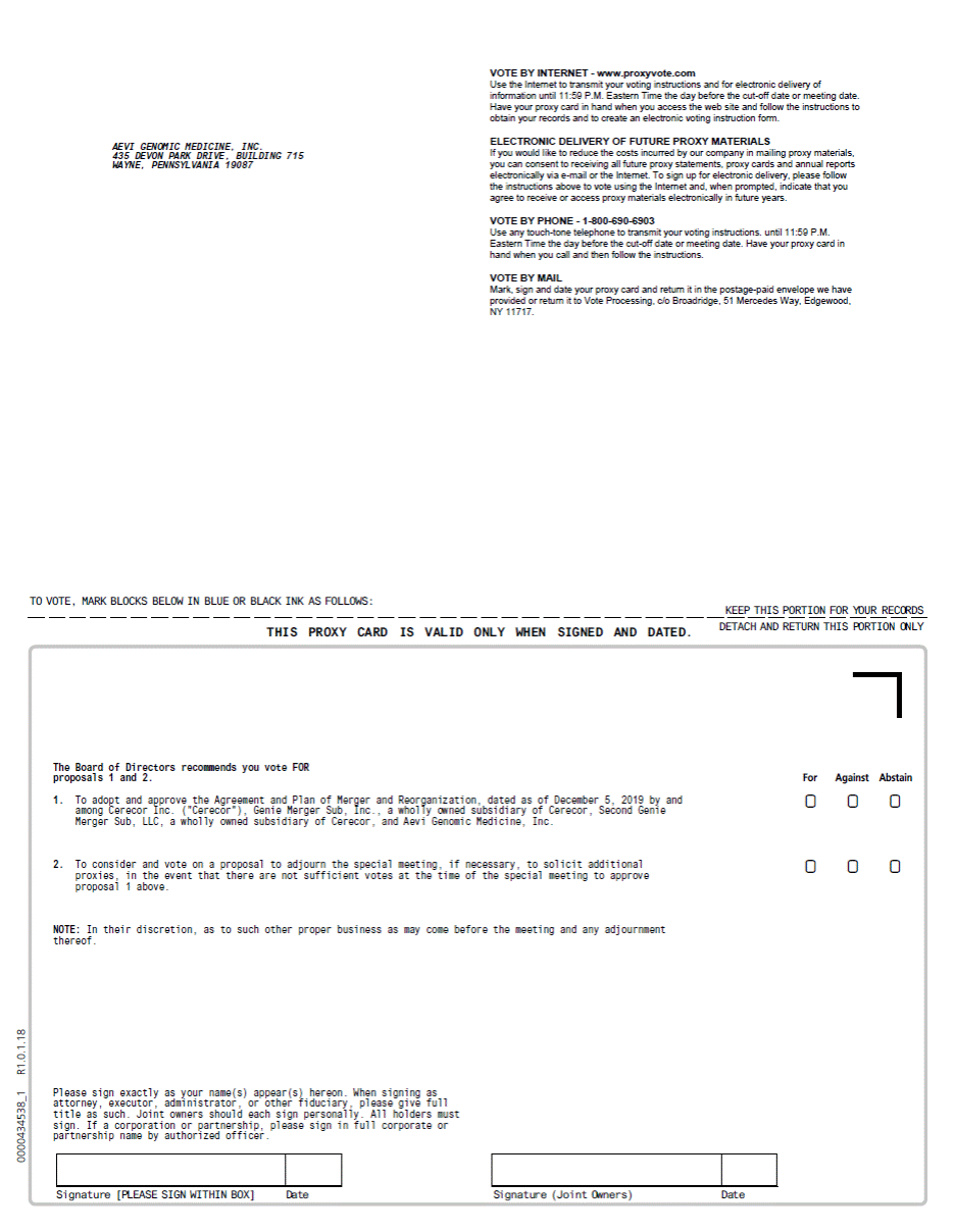 VOTE BY INTERNET - www.proxyvote.com Use the Internet to transmit your voting instructions and for electronic delivery of information until 11:59 P.M. Eastern Time the day before the cut-off date or meeting date. Have your proxy card in hand when you access the web site and follow the instructions to obtain your records and to create an electronic voting instruction form. ELECTRONIC DELIVERY OF FUTURE PROXY MATERIALS If you would like to reduce the costs incurred by our company in mailing proxy materials, you can consent to receiving all future proxy statements, proxy cards and annual reports electronically via e-mail or the Internet. To sign up for electronic delivery, please follow the instructions above to vote using the Internet and, when prompted, indicate that you agree to receive or access proxy materials electronically in future years. AEVI GENOMIC MEDICINE, INC. 435 DEVON PARK DRIVE, BUILDING 715 WAYNE, PENNSYLVANIA 19087 VOTE BY PHONE - 1-800-690-6903 Use any touch-tone telephone to transmit your voting instructions. until 11:59 P.M. Eastern Time the day before the cut-off date or meeting date. Have your proxy card in hand when you call and then follow the instructions. VOTE BY MAIL Mark, sign and date your proxy card and return it in the postage-paid envelope we have provided or return it to Vote Processing, c/o Broadridge, 51 Mercedes Way, Edgewood, NY 11717. TO VOTE, MARK BLOCKS BELOW IN BLUE OR BLACK INK AS FOLLOWS: KEEP THIS PORTION FOR YOUR RECORDS DETACH AND RETURN THIS PORTION ONLY THIS PROXY CARD IS VALID ONLY WHEN SIGNED AND DATED. The Board of Directors recommends you vote FOR proposals 1 and 2. 1. To adopt and approve the Agreement and Plan of Merger and Reorganization, dated as of December 5, 2019 by and among Cerecor Inc. ("Cerecor"), Genie Merger Sub, Inc., a wholly owned subsidiary of Cerecor, Second Genie Merger Sub, LLC, a wholly owned subsidiary of Cerecor, and Aevi Genomic Medicine, Inc. For 0 Against 0 Abstain 0 0 0 0 2. To consider and vote on a proposal to adjourn the special meeting, if necessary, to solicit additional proxies, in the event that there are not sufficient votes at the time of the special meeting to approve proposal 1 above. NOTE: In their discretion, as to such other proper business as may come before the meeting and any adjournment thereof. Please sign exactly as your name(s) appear(s) hereon. When signing as attorney, executor, administrator, or other fiduciary, please give full title as such. Joint owners should each sign personally. All holders must sign. If a corporation or partnership, please sign in full corporate or partnership name by authorized officer. Signature [PLEASE SIGN WITHIN BOX] Date Signature (Joint Owners) Date 0000434538_1 R1.0.1.18