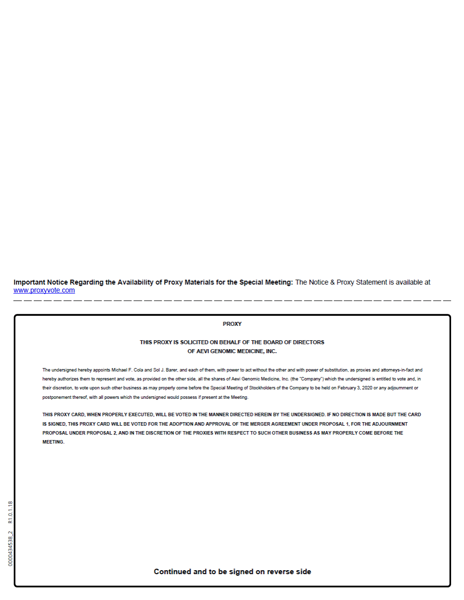 Important Notice Regarding the Availability of Proxy Materials for the Special Meeting: The Notice & Proxy Statement is available at www.proxyvote.com PROXY THIS PROXY IS SOLICITED ON BEHALF OF THE BOARD OF DIRECTORS OF AEVI GENOMIC MEDICINE, INC. The undersigned hereby appoints Michael F. Cola and Sol J. Barer, and each of them, with power to act without the other and with power of substitution, as proxies and attorneys-in-fact and hereby authorizes them to represent and vote, as provided on the other side, all the shares of Aevi Genomic Medicine, Inc. (the "Company") which the undersigned is entitled to vote and, in their discretion, to vote upon such other business as may properly come before the Special Meeting of Stockholders of the Company to be held on February 3, 2020 or any adjournment or postponement thereof, with all powers which the undersigned would possess if present at the Meeting. THIS PROXY CARD, WHEN PROPERLY EXECUTED, WILL BE VOTED IN THE MANNER DIRECTED HEREIN BY THE UNDERSIGNED. IF NO DIRECTION IS MADE BUT THE CARD IS SIGNED, THIS PROXY CARD WILL BE VOTED FOR THE ADOPTION AND APPROVAL OF THE MERGER AGREEMENT UNDER PROPOSAL 1, FOR THE ADJOURNMENT PROPOSAL UNDER PROPOSAL 2, AND IN THE DISCRETION OF THE PROXIES WITH RESPECT TO SUCH OTHER BUSINESS AS MAY PROPERLY COME BEFORE THE MEETING. Continued and to be signed on reverse side 0000434538_2 R1.0.1.18