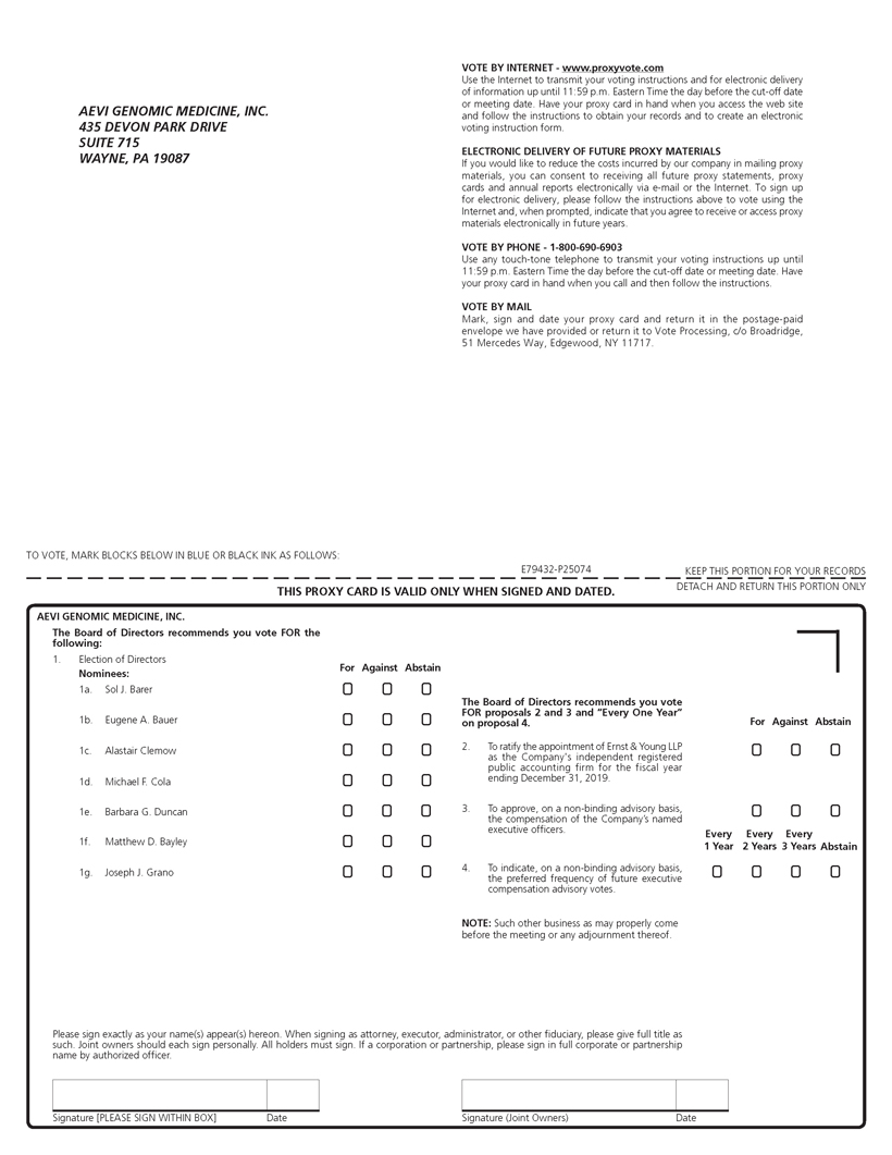 AEVI GENOMIC MEDICINE, INC. 435 DEVON PARK DRIVE SUITE 715 WAYNE, PA 19087 VOTE BY INTERNET - www.proxyvote.com Use the Internet to transmit your voting instructions and for electronic delivery of information up until 11:59 p.m. Eastern Time the day before the cut-off date or meeting date. Have your proxy card in hand when you access the web site and follow the instructions to obtain your records and to create an electronic voting instruction form. ELECTRONIC DELIVERY OF FUTURE PROXY MATERIALS If you would like to reduce the costs incurred by our company in mailing proxy materials, you can consent to receiving all future proxy statements, proxy cards and annual reports electronically via e-mail or the Internet. To sign up for electronic delivery, please follow the instructions above to vote using the Internet and, when prompted, indicate that you agree to receive or access proxy materials electronically in future years. VOTE BY PHONE - 1-800-690-6903 Use any touch-tone telephone to transmit your voting instructions up until 11:59 p.m. Eastern Time the day before the cut-off date or meeting date. Have your proxy card in hand when you call and then follow the instructions. VOTE BY MAIL Mark, sign and date your proxy card and return it in the postage-paid envelope we have provided or return it to Vote Processing, c/o Broadridge, 51 Mercedes Way, Edgewood, NY 11717. TO VOTE, MARK BLOCKS BELOW IN BLUE OR BLACK INK AS FOLLOWS: E79432-P25074 KEEP THIS PORTION FOR YOUR RECORDS DETACH AND RETURN THIS PORTION ONLY THIS PROXY CARD IS VALID ONLY WHEN SIGNED AND DATED. AEVI GENOMIC MEDICINE, INC. The Board of Directors recommends you vote FOR the following: 1. Election of Directors For Against Abstain Nominees: 1a. Sol J. Barer ¨ ¨ ¨ 1b. Eugene A. Bauer ¨ ¨ ¨ 1c. Alastair Clemow ¨ ¨ ¨ 1d. Michael F. Cola ¨ ¨ ¨ 1e. Barbara G. Duncan ¨ ¨ ¨ 1f. Matthew D. Bayley ¨ ¨ ¨ 1g. Joseph J. Grano ¨ ¨ ¨ The Board of Directors recommends you vote FOR proposals 2 and 3 and “Every One Year” on proposal 4. For Against Abstain 2. To ratify the appointment of Ernst & Young LLP as the Company's independent registered public accounting firm for the fiscal year ending December 31, 2019. ¨ ¨ ¨ 3. To approve, on a non-binding advisory basis, the compensation of the Company’s named executive officers. ¨ ¨ ¨ Every Every Every 1 Year 2 Years 3 Years Abstain 4. To indicate, on a non-binding advisory basis, the preferred frequency of future executive compensation advisory votes. ¨ ¨ ¨ ¨ NOTE: Such other business as may properly come before the meeting or any adjournment thereof. Please sign exactly as your name(s) appear(s) hereon. When signing as attorney, executor, administrator, or other fiduciary, please give full title as such. Joint owners should each sign personally. All holders must sign. If a corporation or partnership, please sign in full corporate or partnership name by authorized officer. Signature [PLEASE SIGN WITHIN BOX] Date Signature (Joint Owners) Date