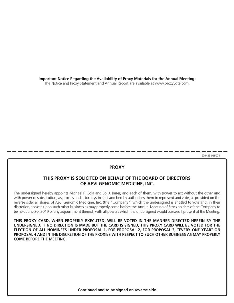 Important Notice Regarding the Availability of Proxy Materials for the Annual Meeting: The Notice and Proxy Statement and Annual Report are available at www.proxyvote.com. E79433-P25074 PROXY THIS PROXY IS SOLICITED ON BEHALF OF THE BOARD OF DIRECTORS OF AEVI GENOMIC MEDICINE, INC. The undersigned hereby appoints Michael F. Cola and Sol J. Barer, and each of them, with power to act without the other and with power of substitution, as proxies and attorneys-in-fact and hereby authorizes them to represent and vote, as provided on the reverse side, all shares of Aevi Genomic Medicine, Inc. (the "Company") which the undersigned is entitled to vote and, in their discretion, to vote upon such other business as may properly come before the Annual Meeting of Stockholders of the Company to be held June 20, 2019 or any adjournment thereof, with all powers which the undersigned would possess if present at the Meeting. THIS PROXY CARD, WHEN PROPERLY EXECUTED, WILL BE VOTED IN THE MANNER DIRECTED HEREIN BY THE UNDERSIGNED. IF NO DIRECTION IS MADE BUT THE CARD IS SIGNED, THIS PROXY CARD WILL BE VOTED FOR THE ELECTION OF ALL NOMINEES UNDER PROPOSAL 1, FOR PROPOSAL 2, FOR PROPOSAL 3, “EVERY ONE YEAR” ON PROPOSAL 4 AND IN THE DISCRETION OF THE PROXIES WITH RESPECT TO SUCH OTHER BUSINESS AS MAY PROPERLY COME BEFORE THE MEETING. Continued and to be signed on reverse side