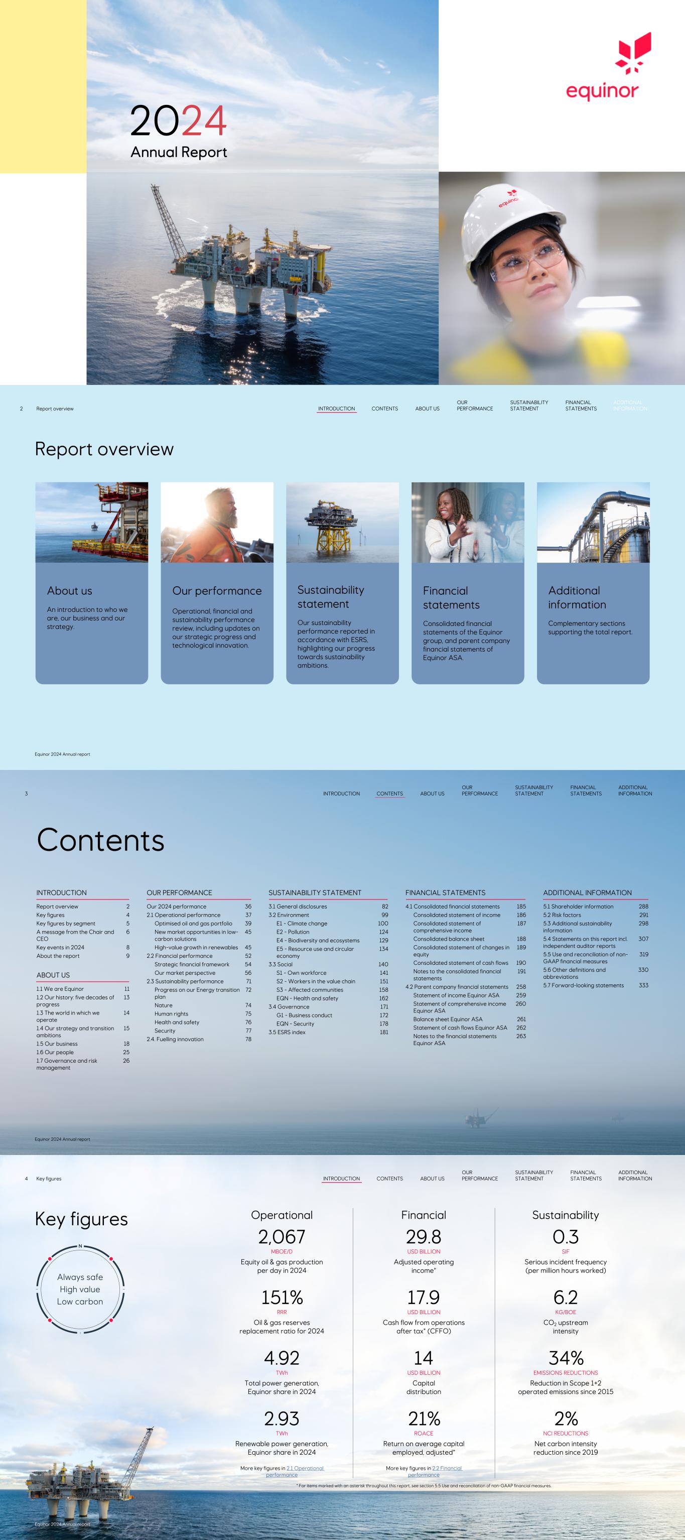 Equinor 2023 Integrated annual report 2024 Annual Report Report overview 2 INTRODUCTION CONTENTS ABOUT US OUR PERFORMANCE SUSTAINABILITY STATEMENT FINANCIAL STATEMENTS ADDITIONAL INFORMATION Equinor 2024 Annual report About us An introduction to who we are, our business and our strategy. Our performance Operational, financial and sustainability performance review, including updates on our strategic progress and technological innovation. Sustainability statement Our sustainability performance reported in accordance with ESRS, highlighting our progress towards sustainability ambitions. Financial statements Consolidated financial statements of the Equinor group, and parent company financial statements of Equinor ASA. Additional information Complementary sections supporting the total report. Report overview INTRODUCTION Report overview 2 Key figures 4 Key figures by segment 5 A message from the Chair and CEO 6 Key events in 2024 8 About the report 9 ABOUT US 1.1 We are Equinor 11 1.2 Our history: five decades of progress 13 1.3 The world in which we operate 14 1.4 Our strategy and transition ambitions 15 1.5 Our business 18 1.6 Our people 25 1.7 Governance and risk management 26 OUR PERFORMANCE Our 2024 performance 36 2.1 Operational performance 37 Optimised oil and gas portfolio 39 New market opportunities in low- carbon solutions 45 High-value growth in renewables 45 2.2 Financial performance 52 Strategic financial framework 54 Our market perspective 56 2.3 Sustainability performance 71 Progress on our Energy transition plan 72 Nature 74 Human rights 75 Health and safety 76 Security 77 2.4. Fuelling innovation 78 SUSTAINABILITY STATEMENT 3.1 General disclosures 82 3.2 Environment 99 E1 - Climate change 100 E2 - Pollution 124 E4 - Biodiversity and ecosystems 129 E5 - Resource use and circular economy 134 3.3 Social 140 S1 - Own workforce 141 S2 - Workers in the value chain 151 S3 - Affected communities 158 EQN - Health and safety 162 3.4 Governance 171 G1 - Business conduct 172 EQN - Security 178 3.5 ESRS index 181 FINANCIAL STATEMENTS 4.1 Consolidated financial statements 185 Consolidated statement of income 186 Consolidated statement of comprehensive income 187 Consolidated balance sheet 188 Consolidated statement of changes in equity 189 Consolidated statement of cash flows 190 Notes to the consolidated financial statements 191 4.2 Parent company financial statements 258 Statement of income Equinor ASA 259 Statement of comprehensive income Equinor ASA 260 Balance sheet Equinor ASA 261 Statement of cash flows Equinor ASA 262 Notes to the financial statements Equinor ASA 263 ADDITIONAL INFORMATION 5.1 Shareholder information 288 5.2 Risk factors 291 5.3 Additional sustainability information 298 5.4 Statements on this report incl. independent auditor reports 307 5.5 Use and reconciliation of non- GAAP financial measures 319 5.6 Other definitions and abbreviations 330 5.7 Forward-looking statements 333 3 INTRODUCTION CONTENTS ABOUT US OUR PERFORMANCE SUSTAINABILITY STATEMENT FINANCIAL STATEMENTS ADDITIONAL INFORMATION Equinor 2024 Annual report Contents Key figures 4 INTRODUCTION CONTENTS ABOUT US OUR PERFORMANCE SUSTAINABILITY STATEMENT FINANCIAL STATEMENTS ADDITIONAL INFORMATION Equinor 2024 Annual report Operational Financial Sustainability 2,067 29.8 0.3 MBOE/D USD BILLION SIF Equity oil & gas production per day in 2024 Adjusted operating income* Serious incident frequency (per million hours worked) 151% 17.9 6.2 RRR USD BILLION KG/BOE Oil & gas reserves replacement ratio for 2024 Cash flow from operations after tax* (CFFO) CO2 upstream intensity 4.92 14 34% TWh USD BILLION EMISSIONS REDUCTIONS Total power generation, Equinor share in 2024 Capital distribution Reduction in Scope 1+2 operated emissions since 2015 2.93 21% 2% TWh ROACE NCI REDUCTIONS Renewable power generation, Equinor share in 2024 Return on average capital employed, adjusted* Net carbon intensity reduction since 2019 More key figures in 2.1 Operational performance More key figures in 2.2 Financial performance * For items marked with an asterisk throughout this report, see section 5.5 Use and reconciliation of non-GAAP financial measures. Key figures