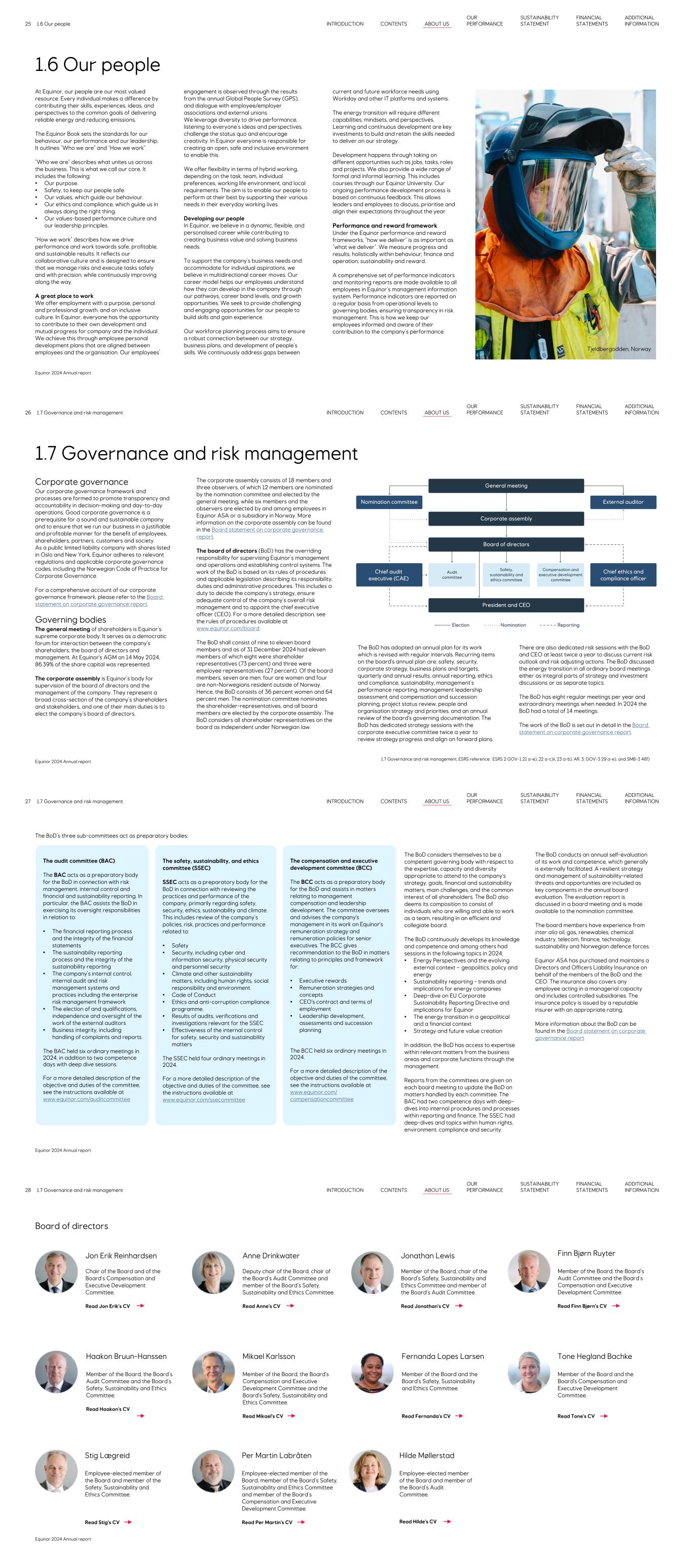 1.6 Our people At Equinor, our people are our most valued resource. Every individual makes a difference by contributing their skills, experiences, ideas, and perspectives to the common goals of delivering reliable energy and reducing emissions. The Equinor Book sets the standards for our behaviour, our performance and our leadership. It outlines “Who we are” and “How we work”. “Who we are” describes what unites us across the business. This is what we call our core. It includes the following: • Our purpose. • Safety, to keep our people safe. • Our values, which guide our behaviour. • Our ethics and compliance, which guide us in always doing the right thing. • Our values-based performance culture and our leadership principles. “How we work” describes how we drive performance and work towards safe, profitable, and sustainable results. It reflects our collaborative culture and is designed to ensure that we manage risks and execute tasks safely and with precision, while continuously improving along the way. A great place to work We offer employment with a purpose, personal and professional growth, and an inclusive culture. In Equinor, everyone has the opportunity to contribute to their own development and mutual progress for company and the individual. We achieve this through employee personal development plans that are aligned between employees and the organisation. Our employees’ engagement is observed through the results from the annual Global People Survey (GPS), and dialogue with employee/employer associations and external unions. We leverage diversity to drive performance, listening to everyone’s ideas and perspectives, challenge the status quo and encourage creativity. In Equinor everyone is responsible for creating an open, safe and inclusive environment to enable this. We offer flexibility in terms of hybrid working, depending on the task, team, individual preferences, working life environment, and local requirements. The aim is to enable our people to perform at their best by supporting their various needs in their everyday working lives. Developing our people In Equinor, we believe in a dynamic, flexible, and personalised career while contributing to creating business value and solving business needs. To support the company’s business needs and accommodate for individual aspirations, we believe in multidirectional career moves. Our career model helps our employees understand how they can develop in the company through our pathways, career band levels, and growth opportunities. We seek to provide challenging and engaging opportunities for our people to build skills and gain experience. Our workforce planning process aims to ensure a robust connection between our strategy, business plans, and development of people’s skills. We continuously address gaps between current and future workforce needs using Workday and other IT platforms and systems. The energy transition will require different capabilities, mindsets, and perspectives. Learning and continuous development are key investments to build and retain the skills needed to deliver on our strategy. Development happens through taking on different opportunities such as jobs, tasks, roles and projects. We also provide a wide range of formal and informal learning. This includes courses through our Equinor University. Our ongoing performance development process is based on continuous feedback. This allows leaders and employees to discuss, prioritise and align their expectations throughout the year. Performance and reward framework Under the Equinor performance and reward frameworks, “how we deliver” is as important as “what we deliver”. We measure progress and results, holistically within behaviour; finance and operation; sustainability and reward. A comprehensive set of performance indicators and monitoring reports are made available to all employees in Equinor’s management information system. Performance indicators are reported on a regular basis from operational levels to governing bodies, ensuring transparency in risk. management. This is how we keep our employees informed and aware of their contribution to the company’s performance. 25 INTRODUCTION CONTENTS ABOUT US OUR PERFORMANCE SUSTAINABILITY STATEMENT FINANCIAL STATEMENTS ADDITIONAL INFORMATION Equinor 2024 Annual report 1.6 Our people Tjeldbergodden, Norway 1.7 Governance and risk management Corporate governance Our corporate governance framework and processes are formed to promote transparency and accountability in decision-making and day-to-day operations. Good corporate governance is a prerequisite for a sound and sustainable company and to ensure that we run our business in a justifiable and profitable manner for the benefit of employees, shareholders, partners, customers and society. As a public limited liability company with shares listed in Oslo and New York, Equinor adheres to relevant regulations and applicable corporate governance codes, including the Norwegian Code of Practice for Corporate Governance. For a comprehensive account of our corporate governance framework, please refer to the Board statement on corporate governance report. Governing bodies The general meeting of shareholders is Equinor’s supreme corporate body. It serves as a democratic forum for interaction between the company’s shareholders, the board of directors and management. At Equinor's AGM on 14 May 2024, 86.39% of the share capital was represented. The corporate assembly is Equinor’s body for supervision of the board of directors and the management of the company. They represent a broad cross-section of the company’s shareholders and stakeholders, and one of their main duties is to elect the company’s board of directors. The corporate assembly consists of 18 members and three observers, of which 12 members are nominated by the nomination committee and elected by the general meeting, while six members and the observers are elected by and amo