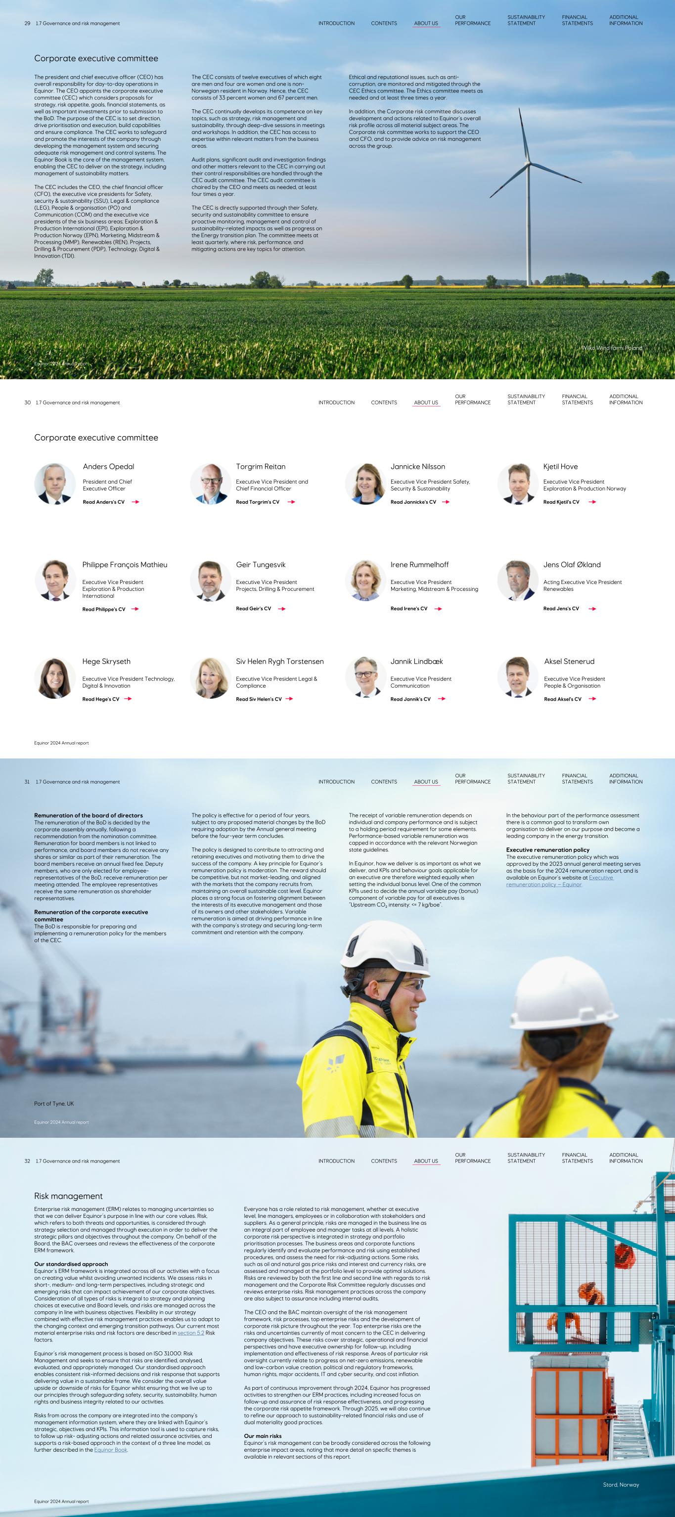 Corporate executive committee The president and chief executive officer (CEO) has overall responsibility for day-to-day operations in Equinor. The CEO appoints the corporate executive committee (CEC) which considers proposals for strategy, risk appetite, goals, financial statements, as well as important investments prior to submission to the BoD. The purpose of the CEC is to set direction, drive prioritisation and execution, build capabilities and ensure compliance. The CEC works to safeguard and promote the interests of the company through developing the management system and securing adequate risk management and control systems. The Equinor Book is the core of the management system, enabling the CEC to deliver on the strategy, including management of sustainability matters. The CEC includes the CEO, the chief financial officer (CFO), the executive vice presidents for Safety, security & sustainability (SSU), Legal & compliance (LEG), People & organisation (PO) and Communication (COM) and the executive vice presidents of the six business areas; Exploration & Production International (EPI), Exploration & Production Norway (EPN), Marketing, Midstream & Processing (MMP), Renewables (REN), Projects, Drilling & Procurement (PDP), Technology, Digital & Innovation (TDI). The CEC consists of twelve executives of which eight are men and four are women and one is non- Norwegian resident in Norway. Hence, the CEC consists of 33 percent women and 67 percent men. The CEC continually develops its competence on key topics, such as strategy, risk management and sustainability, through deep-dive sessions in meetings and workshops. In addition, the CEC has access to expertise within relevant matters from the business areas. Audit plans, significant audit and investigation findings and other matters relevant to the CEC in carrying out their control responsibilities are handled through the CEC audit committee. The CEC audit committee is chaired by the CEO and meets as needed, at least four times a year. The CEC is directly supported through their Safety, security and sustainability committee to ensure proactive monitoring, management and control of sustainability-related impacts as well as progress on the Energy transition plan. The committee meets at least quarterly, where risk, performance, and mitigating actions are key topics for attention. Ethical and reputational issues, such as anti- corruption, are monitored and mitigated through the CEC Ethics committee. The Ethics committee meets as needed and at least three times a year. In addition, the Corporate risk committee discusses development and actions related to Equinor’s overall risk profile across all material subject areas. The Corporate risk committee works to support the CEO and CFO, and to provide advice on risk management across the group. 29 INTRODUCTION CONTENTS ABOUT US OUR PERFORMANCE SUSTAINABILITY STATEMENT FINANCIAL STATEMENTS ADDITIONAL INFORMATION Equinor 2024 Annual report Wilko Wind farm, Poland 1.7 Governance and risk management Corporate executive committee 30 INTRODUCTION CONTENTS ABOUT US OUR PERFORMANCE SUSTAINABILITY STATEMENT FINANCIAL STATEMENTS ADDITIONAL INFORMATION Equinor 2024 Annual report Anders Opedal President and Chief Executive Officer Read Anders's CV Torgrim Reitan Executive Vice President and Chief Financial Officer Read Torgrim's CV Jannicke Nilsson Executive Vice President Safety, Security & Sustainability Read Jannicke's CV Kjetil Hove Executive Vice President Exploration & Production Norway Read Kjetil's CV Philippe François Mathieu Executive Vice President Exploration & Production International Read Philippe's CV Geir Tungesvik Executive Vice President Projects, Drilling & Procurement Read Geir's CV Irene Rummelhoff Executive Vice President Marketing, Midstream & Processing Read Irene's CV Jens Olaf Økland Acting Executive Vice President Renewables Read Jens's CV Hege Skryseth Executive Vice President Technology, Digital & Innovation Read Hege's CV Siv Helen Rygh Torstensen Executive Vice President Legal & Compliance Read Siv Helen's CV Jannik Lindbæk Executive Vice President Communication Read Jannik's CV Aksel Stenerud Executive Vice President People & Organisation Read Aksel's CV 1.7 Governance and risk management Remuneration of the board of directors The remuneration of the BoD is decided by the corporate assembly annually, following a recommendation from the nomination committee. Remuneration for board members is not linked to performance, and board members do not receive any shares or similar as part of their remuneration. The board members receive an annual fixed fee. Deputy members, who are only elected for employee- representatives of the BoD, receive remuneration per meeting attended. The employee representatives receive the same remuneration as shareholder representatives. Remuneration of the corporate executive committee The BoD is responsible for preparing and implementing a remuneration policy for the members of the CEC. The policy is effective for a period of four years, subject to any proposed material changes by the BoD requiring adoption by the Annual general meeting before the four-year term concludes. The policy is designed to contribute to attracting and retaining executives and motivating them to drive the success of the company. A key principle for Equinor’s remuneration policy is moderation. The reward should be competitive, but not market-leading, and aligned with the markets that the company recruits from, maintaining an overall sustainable cost level. Equinor places a strong focus on fostering alignment between the interests of its executive management and those of its owners and other stakeholders. Variable remuneration is aimed at driving performance in line with the company’s strategy and securing long-term commitment and retention with the company. The receipt of variable remuneration depends on individual and company performance and is subject to a holding period requ