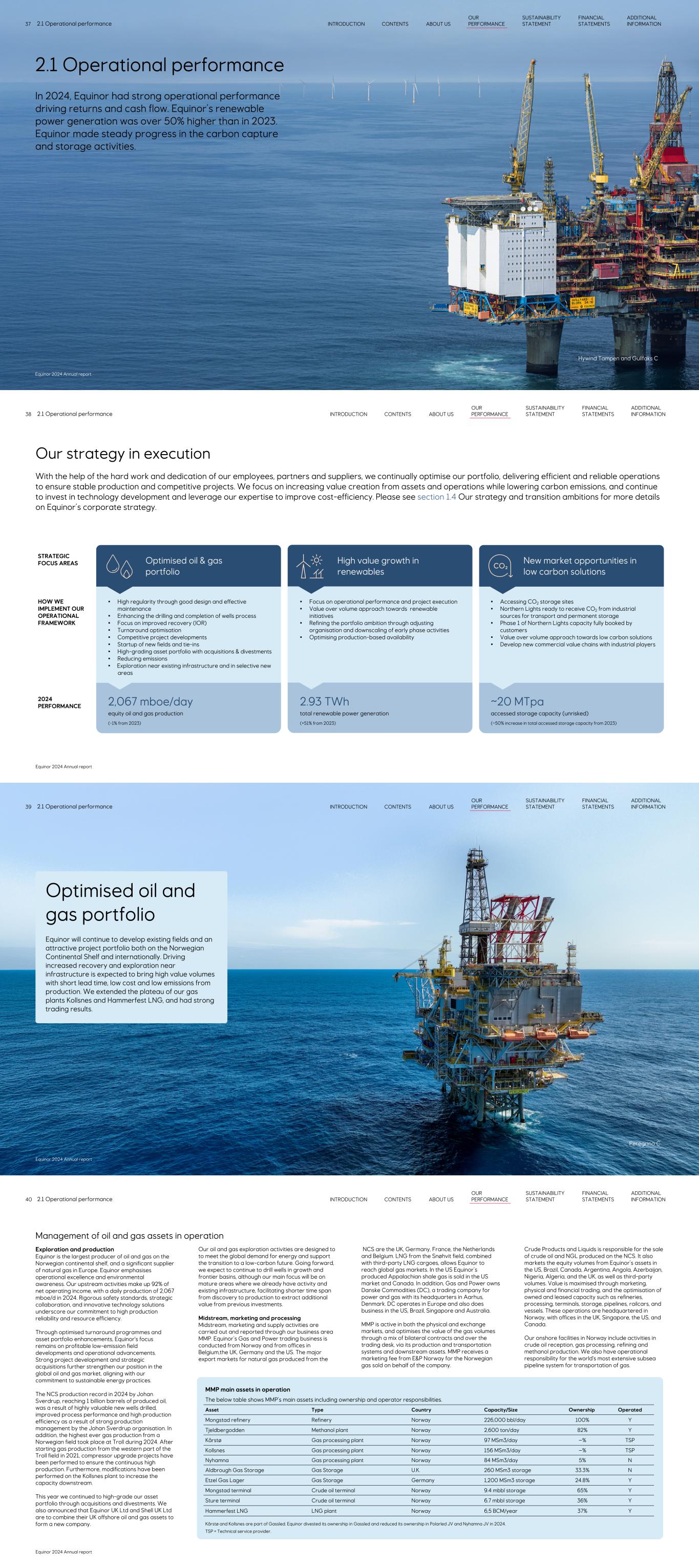 2.1 Operational performance In 2024, Equinor had strong operational performance driving returns and cash flow. Equinor’s renewable power generation was over 50% higher than in 2023. Equinor made steady progress in the carbon capture and storage activities. 37 INTRODUCTION CONTENTS ABOUT US OUR PERFORMANCE SUSTAINABILITY STATEMENT FINANCIAL STATEMENTS ADDITIONAL INFORMATION Equinor 2024 Annual report 2.1 Operational performance Hywind Tampen and Gullfaks C Our strategy in execution With the help of the hard work and dedication of our employees, partners and suppliers, we continually optimise our portfolio, delivering efficient and reliable operations to ensure stable production and competitive projects. We focus on increasing value creation from assets and operations while lowering carbon emissions, and continue to invest in technology development and leverage our expertise to improve cost-efficiency. Please see section 1.4 Our strategy and transition ambitions for more details on Equinor’s corporate strategy. 38 INTRODUCTION CONTENTS ABOUT US OUR PERFORMANCE SUSTAINABILITY STATEMENT FINANCIAL STATEMENTS ADDITIONAL INFORMATION Equinor 2024 Annual report 2.1 Operational performance STRATEGIC FOCUS AREAS Optimised oil & gas portfolio High value growth in renewables New market opportunities in low carbon solutions HOW WE IMPLEMENT OUR OPERATIONAL FRAMEWORK • High regularity through good design and effective maintenance • Enhancing the drilling and completion of wells process • Focus on improved recovery (IOR) • Turnaround optimisation • Competitive project developments • Startup of new fields and tie-ins • High-grading asset portfolio with acquisitions & divestments • Reducing emissions • Exploration near existing infrastructure and in selective new areas • Focus on operational performance and project execution • Value over volume approach towards renewable initiatives • ͏͏Refining the portfolio ambition through adjusting organisation and downscaling of early phase activities • ͏͏Optimising production-based availability • Accessing CO2 storage sites • Northern Lights ready to receive CO2 from industrial sources for transport and permanent storage • Phase 1 of Northern Lights capacity fully booked by customers • Value over volume approach towards low carbon solutions • Develop new commercial value chains with industrial players 2024 PERFORMANCE 2,067 mboe/day 2.93 TWh ~20 MTpa equity oil and gas production total renewable power generation accessed storage capacity (unrisked) (-1% from 2023) (+51% from 2023) (~50% increase in total accessed storage capacity from 2023) 39 INTRODUCTION CONTENTS ABOUT US OUR PERFORMANCE SUSTAINABILITY STATEMENT FINANCIAL STATEMENTS ADDITIONAL INFORMATION Equinor 2024 Annual report 2.1 Operational performance Optimised oil and gas portfolio Equinor will continue to develop existing fields and an attractive project portfolio both on the Norwegian Continental Shelf and internationally. Driving increased recovery and exploration near infrastructure is expected to bring high value volumes with short lead time, low cost and low emissions from production. We extended the plateau of our gas plants Kollsnes and Hammerfest LNG, and had strong trading results. Peregrino C Management of oil and gas assets in operation Exploration and production Equinor is the largest producer of oil and gas on the Norwegian continental shelf, and a significant supplier of natural gas in Europe. Equinor emphasises operational excellence and environmental awareness. Our upstream activities make up 92% of net operating income, with a daily production of 2,067 mboe/d in 2024. Rigorous safety standards, strategic collaboration, and innovative technology solutions underscore our commitment to high production reliability and resource efficiency. Through optimised turnaround programmes and asset portfolio enhancements, Equinor's focus remains on profitable low-emission field developments and operational advancements. Strong project development and strategic acquisitions further strengthen our position in the global oil and gas market, aligning with our commitment to sustainable energy practices. The NCS production record in 2024 by Johan Sverdrup, reaching 1 billion barrels of produced oil, was a result of highly valuable new wells drilled, improved process performance and high production efficiency as a result of strong production management by the Johan Sverdrup organisation. In addition, the highest ever gas production from a Norwegian field took place at Troll during 2024. After starting gas production from the western part of the Troll field in 2021, compressor upgrade projects have been performed to ensure the continuous high production. Furthermore, modifications have been performed on the Kollsnes plant to increase the capacity downstream. This year we continued to high-grade our asset portfolio through acquisitions and divestments. We also announced that Equinor UK Ltd and Shell UK Ltd are to combine their UK offshore oil and gas assets to form a new company. Our oil and gas exploration activities are designed to to meet the global demand for energy and support the transition to a low-carbon future. Going forward, we expect to continue to drill wells in growth and frontier basins, although our main focus will be on mature areas where we already have activity and existing infrastructure, facilitating shorter time span from discovery to production to extract additional value from previous investments. Midstream, marketing and processing Midstream, marketing and supply activities are carried out and reported through our business area MMP. Equinor’s Gas and Power trading business is conducted from Norway and from offices in Belgium,the UK, Germany and the US. The major export markets for natural gas produced from the NCS are the UK, Germany, France, the Netherlands and Belgium. LNG from the Snøhvit field, combined with third-party LNG cargoes, allo