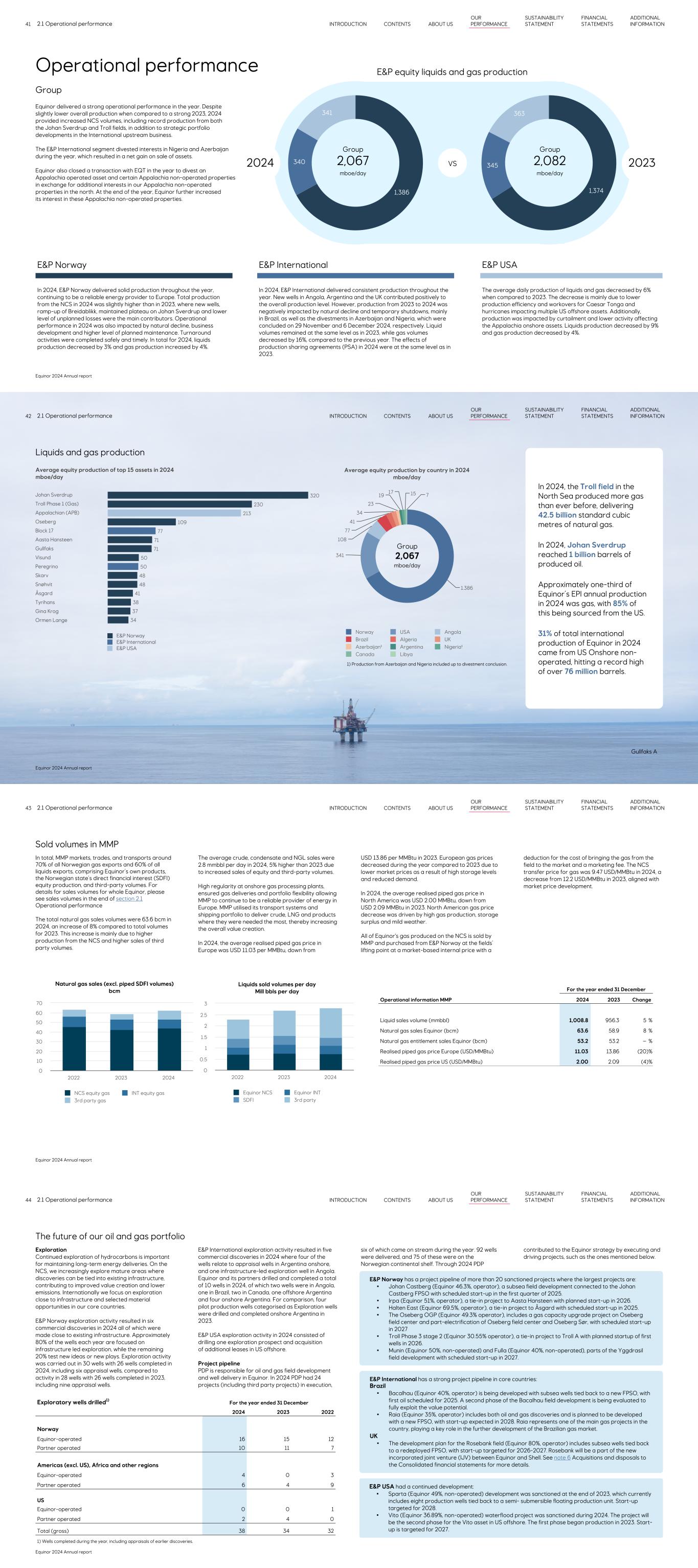 Operational performance Group Equinor delivered a strong operational performance in the year. Despite slightly lower overall production when compared to a strong 2023, 2024 provided increased NCS volumes, including record production from both the Johan Sverdrup and Troll fields, in addition to strategic portfolio developments in the International upstream business. The E&P International segment divested interests in Nigeria and Azerbaijan during the year, which resulted in a net gain on sale of assets. Equinor also closed a transaction with EQT in the year to divest an Appalachia operated asset and certain Appalachia non-operated properties in exchange for additional interests in our Appalachia non-operated properties in the north. At the end of the year, Equinor further increased its interest in these Appalachia non-operated properties. 41 INTRODUCTION CONTENTS ABOUT US OUR PERFORMANCE SUSTAINABILITY STATEMENT FINANCIAL STATEMENTS ADDITIONAL INFORMATION Equinor 2024 Annual report 1,374 345 363 E&P equity liquids and gas production 1,386 340 341 Group 2,082 mboe/day Group 2,067 mboe/day VS2024 2023 E&P Norway E&P International E&P USA In 2024, E&P Norway delivered solid production throughout the year, continuing to be a reliable energy provider to Europe. Total production from the NCS in 2024 was slightly higher than in 2023, where new wells, ramp-up of Breidablikk, maintained plateau on Johan Sverdrup and lower level of unplanned losses were the main contributors. Operational performance in 2024 was also impacted by natural decline, business development and higher level of planned maintenance. Turnaround activities were completed safely and timely. In total for 2024, liquids production decreased by 3% and gas production increased by 4%. In 2024, E&P International delivered consistent production throughout the year. New wells in Angola, Argentina and the UK contributed positively to the overall production level. However, production from 2023 to 2024 was negatively impacted by natural decline and temporary shutdowns, mainly in Brazil, as well as the divestments in Azerbaijan and Nigeria, which were concluded on 29 November and 6 December 2024, respectively. Liquid volumes remained at the same level as in 2023, while gas volumes decreased by 16%, compared to the previous year. The effects of production sharing agreements (PSA) in 2024 were at the same level as in 2023. The average daily production of liquids and gas decreased by 6% when compared to 2023. The decrease is mainly due to lower production efficiency and workovers for Caesar Tonga and hurricanes impacting multiple US offshore assets. Additionally, production was impacted by curtailment and lower activity affecting the Appalachia onshore assets. Liquids production decreased by 9% and gas production decreased by 4%. 2.1 Operational performance Liquids and gas production 42 INTRODUCTION CONTENTS ABOUT US OUR PERFORMANCE SUSTAINABILITY STATEMENT FINANCIAL STATEMENTS ADDITIONAL INFORMATION Equinor 2024 Annual report Average equity production by country in 2024 mboe/day 1.386 341 108 77 41 34 23 19 17 15 7 Norway USA Angola Brazil Algeria UK Azerbaijan¹ Argentina Nigeria¹ Canada Libya Johan Sverdrup Troll Phase 1 (Gas) Appalachian (APB) Oseberg Block 17 Aasta Hansteen Gullfaks Visund Peregrino Skarv Snøhvit Åsgard Tyrihans Gina Krog Ormen Lange E&P Norway E&P International E&P USA 2.1 Operational performance Average equity production of top 15 assets in 2024 mboe/day 1) Production from Azerbaijan and Nigeria included up to divestment conclusion. 320 230 213 109 77 71 71 50 50 48 48 41 38 37 34 In 2024, the Troll field in the North Sea produced more gas than ever before, delivering 42.5 billion standard cubic metres of natural gas. In 2024, Johan Sverdrup reached 1 billion barrels of produced oil. Approximately one-third of Equinor’s EPI annual production in 2024 was gas, with 85% of this being sourced from the US. 31% of total international production of Equinor in 2024 came from US Onshore non- operated, hitting a record high of over 76 million barrels. Group 2,067 mboe/day Gullfaks A Sold volumes in MMP In total, MMP markets, trades, and transports around 70% of all Norwegian gas exports and 60% of all liquids exports, comprising Equinor’s own products, the Norwegian state’s direct financial interest (SDFI) equity production, and third-party volumes. For details for sales volumes for whole Equinor, please see sales volumes in the end of section 2.1 Operational performance The total natural gas sales volumes were 63.6 bcm in 2024, an increase of 8% compared to total volumes for 2023. This increase is mainly due to higher production from the NCS and higher sales of third party volumes. The average crude, condensate and NGL sales were 2.8 mmbbl per day in 2024, 5% higher than 2023 due to increased sales of equity and third-party volumes. High regularity at onshore gas processing plants, ensured gas deliveries and portfolio flexibility allowing MMP to continue to be a reliable provider of energy in Europe. MMP utilised its transport systems and shipping portfolio to deliver crude, LNG and products where they were needed the most, thereby increasing the overall value creation. In 2024, the average realised piped gas price in Europe was USD 11.03 per MMBtu, down from USD 13.86 per MMBtu in 2023. European gas prices decreased during the year compared to 2023 due to lower market prices as a result of high storage levels and reduced demand. In 2024, the average realised piped gas price in North America was USD 2.00 MMBtu, down from USD 2.09 MMBtu in 2023. North American gas price decrease was driven by high gas production, storage surplus and mild weather. All of Equinor's gas produced on the NCS is sold by MMP and purchased from E&P Norway at the fields’ lifting point at a market-based internal price with a deduction for the cost of bringing the gas from the field to the market and a marketing fee. The NCS transfer price for gas