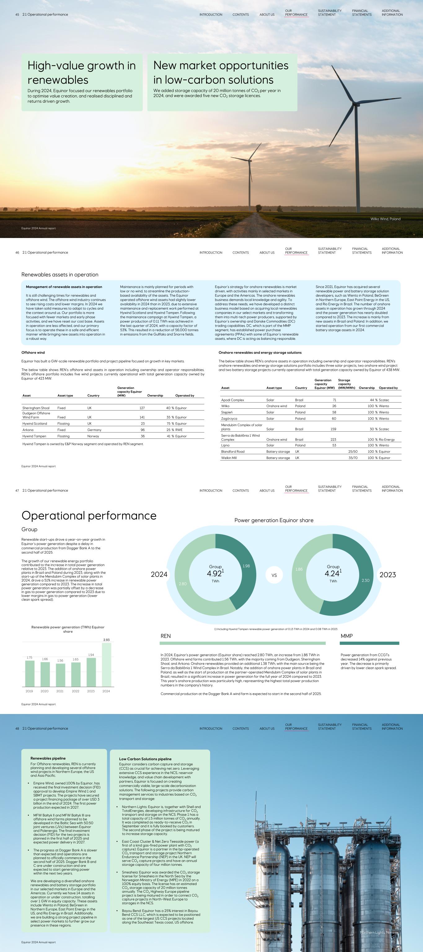 45 INTRODUCTION CONTENTS ABOUT US OUR PERFORMANCE SUSTAINABILITY STATEMENT FINANCIAL STATEMENTS ADDITIONAL INFORMATION Equinor 2024 Annual report 2.1 Operational performance New market opportunities in low-carbon solutions We added storage capacity of 20 million tonnes of CO2 per year in 2024, and were awarded five new CO2 storage licences. Wilko Wind, Poland High-value growth in renewables During 2024, Equinor focused our renewables portfolio to optimise value creation, and realised disciplined and returns driven growth. Renewables assets in operation Offshore wind Equinor has built a GW-scale renewable portfolio and project pipeline focused on growth in key markets. The below table shows REN’s offshore wind assets in operation including ownership and operator responsibilities. REN's offshore portfolio includes five wind projects currently operational with total generation capacity owned by Equinor of 423 MW. Onshore renewables and energy storage solutions The below table shows REN’s onshore assets in operation including ownership and operator responsibilities. REN's onshore renewables and energy storage solutions portfolio includes three solar projects, two onshore wind project and two battery storage projects currently operational with total generation capacity owned by Equinor of 438 MW. Asset Asset type Country Generation capacity Equinor (MW) Ownership Operated by Sheringham Shoal Fixed UK 127 40 % Equinor Dudgeon Offshore Wind Farm Fixed UK 141 35 % Equinor Hywind Scotland Floating UK 23 75 % Equinor Arkona Fixed Germany 96 25 % RWE Hywind Tampen Floating Norway 36 41 % Equinor Hywind Tampen is owned by E&P Norway segment and operated by REN segment. 46 INTRODUCTION CONTENTS ABOUT US OUR PERFORMANCE SUSTAINABILITY STATEMENT FINANCIAL STATEMENTS ADDITIONAL INFORMATION Equinor 2024 Annual report Asset Asset type Country Generation capacity Equinor (MW) Storage capacity (MW/MWh) Ownership Operated by Apodi Complex Solar Brazil 71 44 % Scatec Wilko Onshore wind Poland 26 100 % Wento Stępień Solar Poland 58 100 % Wento Zagórzyca Solar Poland 60 100 % Wento Mendubim Complex of solar plants Solar Brazil 159 30 % Scatec Serra da Babilônia 1 Wind Complex Onshore wind Brazil 223 100 % Rio Energy Lipno Solar Poland 53 100 % Wento Blandford Road Battery storage UK 25/50 100 % Equinor Welkin Mill Battery storage UK 35/70 100 % Equinor 2.1 Operational performance Management of renewable assets in operation It is still challenging times for renewables and offshore wind. The offshore wind industry continues to see rising costs and lower margins. In 2024 we have taken solid measures to adapt to cycles and the context around us. Our portfolio is more focused with fewer markets and early phase activities, and we have reset our cost base. Assets in operation are less affected, and our primary focus is to operate these in a safe and efficient manner while bringing new assets into operation in a robust way. Maintenance is mainly planned for periods with low or no wind, to streamline the production- based availability of the assets. The Equinor operated offshore wind assets had slightly lower availability in 2024 than in 2023, due to extensive maintenance and replacement work performed at Hywind Scotland and Hywind Tampen. Following the maintenance campaign at Hywind Tampen, a power production of 0.11 TWh was achieved in the last quarter of 2024, with a capacity factor of 53%. This resulted in a reduction of 56,000 tonnes in emissions from the Gullfaks and Snorre fields. Equinor’s strategy for onshore renewables is market driven, with activities mainly in selected markets in Europe and the Americas. The onshore renewables business demands local knowledge and agility. To address these needs, we have developed a distinct business model based on acquiring local renewables companies in our select markets and transforming them into multi-tech power producers, supported by Equinor’s ownership and Danske Commodities (DC) trading capabilities. DC, which is part of the MMP segment, has established power purchase agreements (PPAs) with some of Equinor’s renewable assets, where DC is acting as balancing responsible. Since 2021, Equinor has acquired several renewable power and battery storage solution developers, such as Wento in Poland, BeGreen in Northern Europe, East Point Energy in the US, and Rio Energy in Brazil. The number of onshore assets in operation has grown through 2024 and the power generation has nearly doubled compared to 2023. The increase is mainly from new assets in Brazil and Poland. In addition, we started operation from our first commercial battery storage assets in 2024. Operational performance Group Renewable start-ups drove a year-on-year growth in Equinor’s power generation despite a delay in commercial production from Dogger Bank A to the second half of 2025. The growth of our renewable energy portfolio contributed to the increase in total power generation relative to 2023. The addition of onshore power plants in Brazil and Poland during 2023, along with the start-up of the Mendubim Complex of solar plants in 2024, drove a 51% increase in renewable power generation compared to 2023. The increase in total power generation was partially offset by a decrease in gas to power generation compared to 2023 due to lower margins in gas to power generation (lower clean spark spread). 47 INTRODUCTION CONTENTS ABOUT US OUR PERFORMANCE SUSTAINABILITY STATEMENT FINANCIAL STATEMENTS ADDITIONAL INFORMATION Equinor 2024 Annual report 2.30 1.86 Power generation Equinor share 1.98 2.80 Group 4.241 TWh Group 4.921 TWh VS2024 2023 2.1 Operational performance REN MMP In 2024, Equinor's power generation (Equinor share) reached 2.80 TWh, an increase from 1.86 TWh in 2023. Offshore wind farms contributed 1.56 TWh, with the majority coming from Dudgeon, Sheringham Shoal, and Arkona. Onshore renewables provided an additional 1.38 TWh, with the main source being the Serra da Babilônia 1 Wind Complex 