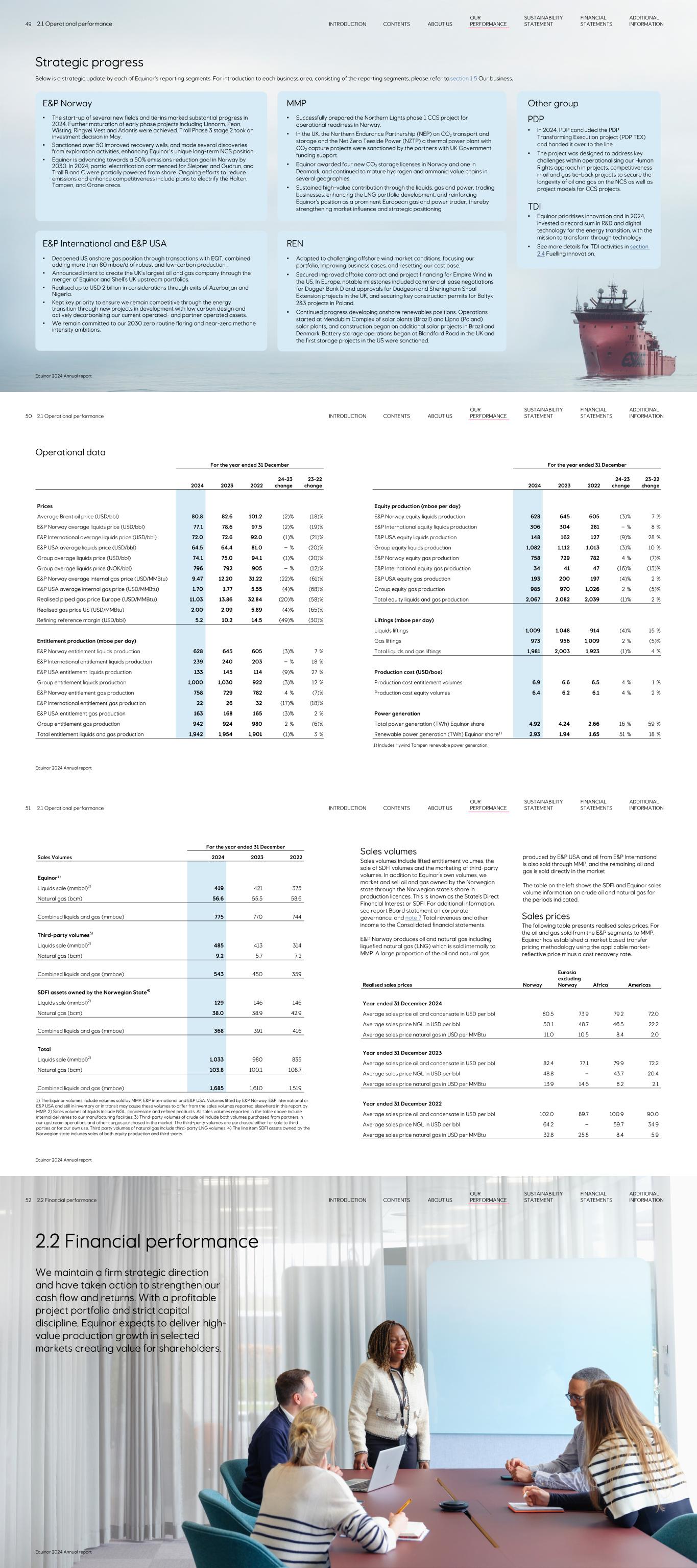 Strategic progress Below is a strategic update by each of Equinor's reporting segments. For introduction to each business area, consisting of the reporting segments, please refer to section 1.5 Our business. 49 INTRODUCTION CONTENTS ABOUT US OUR PERFORMANCE SUSTAINABILITY STATEMENT FINANCIAL STATEMENTS ADDITIONAL INFORMATION Equinor 2024 Annual report E&P Norway MMP Other group • The start-up of several new fields and tie-ins marked substantial progress in 2024. Further maturation of early phase projects including Linnorm, Peon, Wisting, Ringvei Vest and Atlantis were achieved. Troll Phase 3 stage 2 took an investment decision in May. • Sanctioned over 50 improved recovery wells, and made several discoveries from exploration activities, enhancing Equinor’s unique long-term NCS position. • Equinor is advancing towards a 50% emissions reduction goal in Norway by 2030. In 2024, partial electrification commenced for Sleipner and Gudrun, and Troll B and C were partially powered from shore. Ongoing efforts to reduce emissions and enhance competitiveness include plans to electrify the Halten, Tampen, and Grane areas. • Successfully prepared the Northern Lights phase 1 CCS project for operational readiness in Norway. • In the UK, the Northern Endurance Partnership (NEP) on CO2 transport and storage and the Net Zero Teeside Power (NZTP) a thermal power plant with CO2 capture projects were sanctioned by the partners with UK Government funding support. • Equinor awarded four new CO2 storage licenses in Norway and one in Denmark, and continued to mature hydrogen and ammonia value chains in several geographies. • Sustained high-value contribution through the liquids, gas and power, trading businesses, enhancing the LNG portfolio development, and reinforcing Equinor's position as a prominent European gas and power trader, thereby strengthening market influence and strategic positioning. PDP • In 2024, PDP concluded the PDP Transforming Execution project (PDP TEX) and handed it over to the line. • The project was designed to address key challenges within operationalising our Human Rights approach in projects, competitiveness in oil and gas tie-back projects to secure the longevity of oil and gas on the NCS as well as project models for CCS projects. TDI • Equinor prioritises innovation and in 2024, invested a record sum in R&D and digital technology for the energy transition, with the mission to transform through technology. • See more details for TDI activities in section 2.4 Fuelling innovation. E&P International and E&P USA REN • Deepened US onshore gas position through transactions with EQT, combined adding more than 80 mboe/d of robust and low-carbon production. • Announced intent to create the UK’s largest oil and gas company through the merger of Equinor and Shell’s UK upstream portfolios. • Realised up to USD 2 billion in considerations through exits of Azerbaijan and Nigeria. • Kept key priority to ensure we remain competitive through the energy transition through new projects in development with low carbon design and actively decarbonising our current operated- and partner operated assets. • We remain committed to our 2030 zero routine flaring and near-zero methane intensity ambitions. • Adapted to challenging offshore wind market conditions, focusing our portfolio, improving business cases, and resetting our cost base. • Secured improved offtake contract and project financing for Empire Wind in the US. In Europe, notable milestones included commercial lease negotiations for Dogger Bank D and approvals for Dudgeon and Sheringham Shoal Extension projects in the UK, and securing key construction permits for Baltyk 2&3 projects in Poland. • Continued progress developing onshore renewables positions. Operations started at Mendubim Complex of solar plants (Brazil) and Lipno (Poland) solar plants, and construction began on additional solar projects in Brazil and Denmark. Battery storage operations began at Blandford Road in the UK and the first storage projects in the US were sanctioned. 2.1 Operational performance Operational data 50 INTRODUCTION CONTENTS ABOUT US OUR PERFORMANCE SUSTAINABILITY STATEMENT FINANCIAL STATEMENTS ADDITIONAL INFORMATION Equinor 2024 Annual report For the year ended 31 December 24-23 change 23-22 change2024 2023 2022 Prices Average Brent oil price (USD/bbl) 80.8 82.6 101.2 (2) % (18) % E&P Norway average liquids price (USD/bbl) 77.1 78.6 97.5 (2) % (19) % E&P International average liquids price (USD/bbl) 72.0 72.6 92.0 (1) % (21) % E&P USA average liquids price (USD/bbl) 64.5 64.4 81.0 — % (20) % Group average liquids price (USD/bbl) 74.1 75.0 94.1 (1) % (20) % Group average liquids price (NOK/bbl) 796 792 905 — % (12) % E&P Norway average internal gas price (USD/MMBtu) 9.47 12.20 31.22 (22) % (61) % E&P USA average internal gas price (USD/MMBtu) 1.70 1.77 5.55 (4) % (68) % Realised piped gas price Europe (USD/MMBtu) 11.03 13.86 32.84 (20) % (58) % Realised gas price US (USD/MMBtu) 2.00 2.09 5.89 (4) % (65) % Refining reference margin (USD/bbl) 5.2 10.2 14.5 (49) % (30) % Entitlement production (mboe per day) E&P Norway entitlement liquids production 628 645 605 (3) % 7 % E&P International entitlement liquids production 239 240 203 — % 18 % E&P USA entitlement liquids production 133 145 114 (9) % 27 % Group entitlement liquids production 1,000 1,030 922 (3) % 12 % E&P Norway entitlement gas production 758 729 782 4 % (7) % E&P International entitlement gas production 22 26 32 (17) % (18) % E&P USA entitlement gas production 163 168 165 (3) % 2 % Group entitlement gas production 942 924 980 2 % (6) % Total entitlement liquids and gas production 1,942 1,954 1,901 (1) % 3 % For the year ended 31 December 24-23 change 23-22 change2024 2023 2022 Equity production (mboe per day) E&P Norway equity liquids production 628 645 605 (3) % 7 % E&P International equity liquids production 306 304 281 — % 8 % E&P USA equity liquids pro