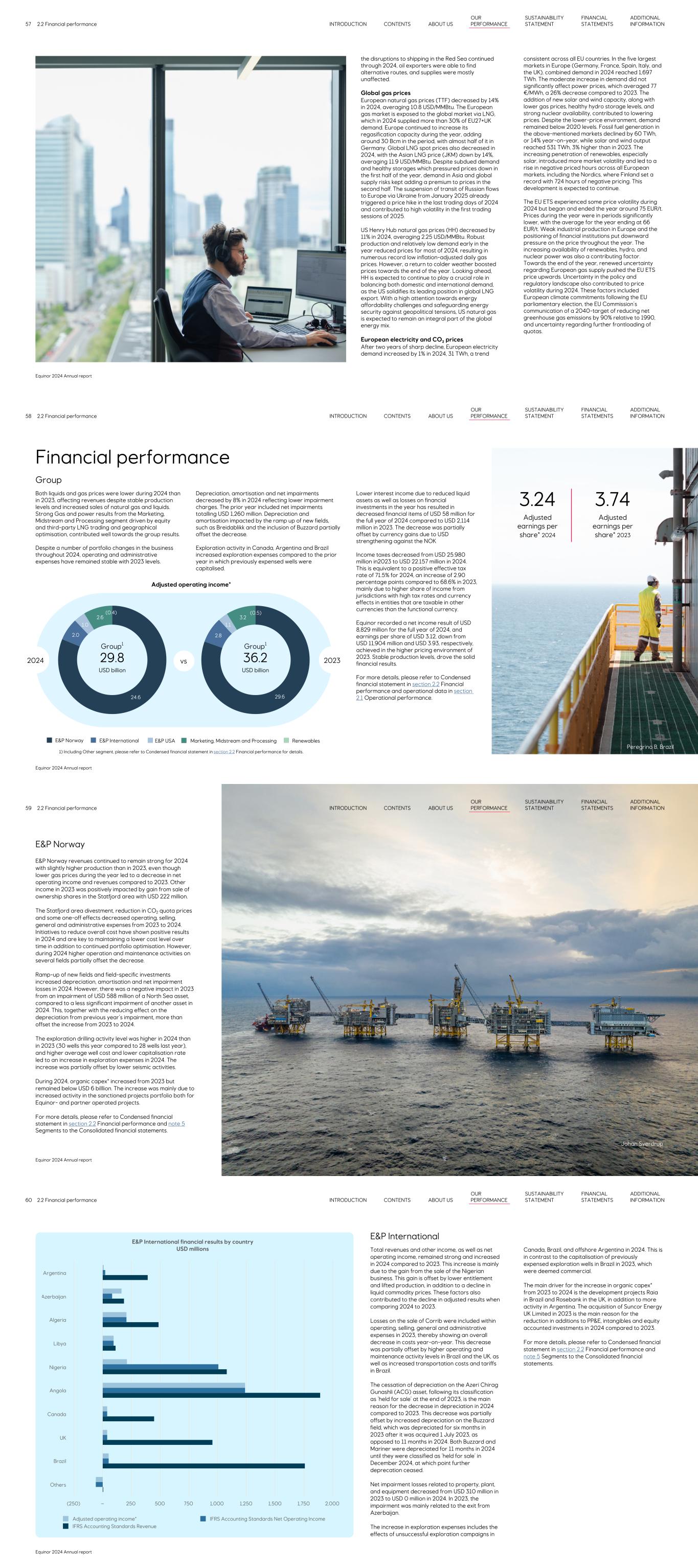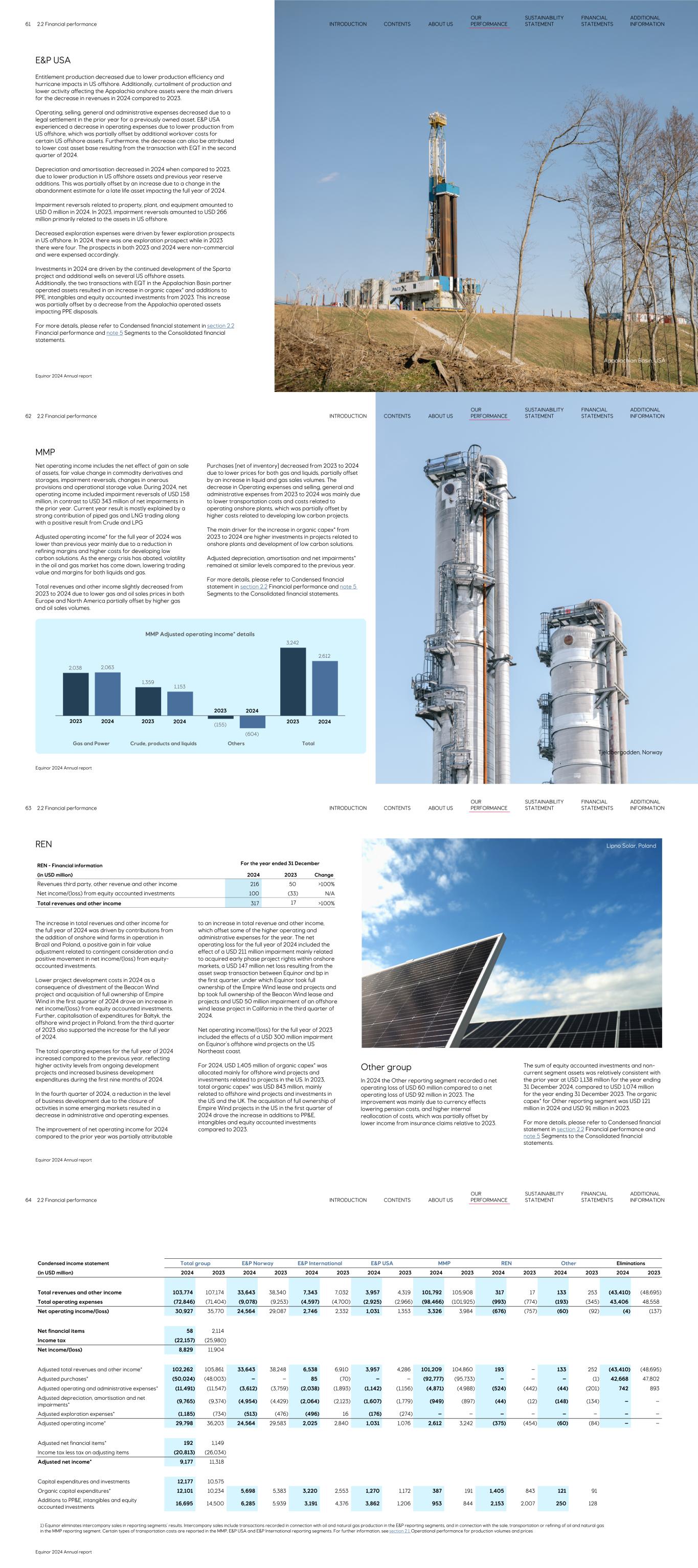 E&P USA Entitlement production decreased due to lower production efficiency and hurricane impacts in US offshore. Additionally, curtailment of production and lower activity affecting the Appalachia onshore assets were the main drivers for the decrease in revenues in 2024 compared to 2023. Operating, selling, general and administrative expenses decreased due to a legal settlement in the prior year for a previously owned asset. E&P USA experienced a decrease in operating expenses due to lower production from US offshore, which was partially offset by additional workover costs for certain US offshore assets. Furthermore, the decrease can also be attributed to lower cost asset base resulting from the transaction with EQT in the second quarter of 2024. Depreciation and amortisation decreased in 2024 when compared to 2023, due to lower production in US offshore assets and previous year reserve additions. This was partially offset by an increase due to a change in the abandonment estimate for a late life asset impacting the full year of 2024. Impairment reversals related to property, plant, and equipment amounted to USD 0 million in 2024. In 2023, impairment reversals amounted to USD 266 million primarily related to the assets in US offshore. Decreased exploration expenses were driven by fewer exploration prospects in US offshore. In 2024, there was one exploration prospect while in 2023 there were four. The prospects in both 2023 and 2024 were non-commercial and were expensed accordingly. Investments in 2024 are driven by the continued development of the Sparta project and additional wells on several US offshore assets. Additionally, the two transactions with EQT in the Appalachian Basin partner operated assets resulted in an increase in organic capex* and additions to PPE, intangibles and equity accounted investments from 2023. This increase was partially offset by a decrease from the Appalachia operated assets impacting PPE disposals. For more details, please refer to Condensed financial statement in section 2.2 Financial performance and note 5 Segments to the Consolidated financial statements. 61 INTRODUCTION CONTENTS ABOUT US OUR PERFORMANCE SUSTAINABILITY STATEMENT FINANCIAL STATEMENTS ADDITIONAL INFORMATION Equinor 2024 Annual report Appalachian Basin, USA 2.2 Financial performance MMP Net operating income includes the net effect of gain on sale of assets, fair value change in commodity derivatives and storages, impairment reversals, changes in onerous provisions and operational storage value. During 2024, net operating income included impairment reversals of USD 158 million, in contrast to USD 343 million of net impairments in the prior year. Current year result is mostly explained by a strong contribution of piped gas and LNG trading along with a positive result from Crude and LPG Adjusted operating income* for the full year of 2024 was lower than previous year mainly due to a reduction in refining margins and higher costs for developing low carbon solutions. As the energy crisis has abated, volatility in the oil and gas market has come down, lowering trading value and margins for both liquids and gas. Total revenues and other income slightly decreased from 2023 to 2024 due to lower gas and oil sales prices in both Europe and North America partially offset by higher gas and oil sales volumes. Purchases [net of inventory] decreased from 2023 to 2024 due to lower prices for both gas and liquids, partially offset by an increase in liquid and gas sales volumes. The decrease in Operating expenses and selling, general and administrative expenses from 2023 to 2024 was mainly due to lower transportation costs and costs related to operating onshore plants, which was partially offset by higher costs related to developing low carbon projects. The main driver for the increase in organic capex* from 2023 to 2024 are higher investments in projects related to onshore plants and development of low carbon solutions. Adjusted depreciation, amortisation and net impairments* remained at similar levels compared to the previous year. For more details, please refer to Condensed financial statement in section 2.2 Financial performance and note 5 Segments to the Consolidated financial statements. 62 INTRODUCTION CONTENTS ABOUT US OUR PERFORMANCE SUSTAINABILITY STATEMENT FINANCIAL STATEMENTS ADDITIONAL INFORMATION Equinor 2024 Annual report 2.2 Financial performance MMP Adjusted operating income* details 2,038 1,359 (155) 3,242 2,063 1,153 (604) 2,612 Gas and Power Crude, products and liquids Others Total 2023 2024 2023 2024 2023 2024 2023 2024 Tjeldbergodden, Norway REN The increase in total revenues and other income for the full year of 2024 was driven by contributions from the addition of onshore wind farms in operation in Brazil and Poland, a positive gain in fair value adjustment related to contingent consideration and a positive movement in net income/(loss) from equity- accounted investments. Lower project development costs in 2024 as a consequence of divestment of the Beacon Wind project and acquisition of full ownership of Empire Wind in the first quarter of 2024 drove an increase in net income/(loss) from equity accounted investments. Further, capitalisation of expenditures for Bałtyk, the offshore wind project in Poland, from the third quarter of 2023 also supported the increase for the full year of 2024. The total operating expenses for the full year of 2024 increased compared to the previous year, reflecting higher activity levels from ongoing development projects and increased business development expenditures during the first nine months of 2024. In the fourth quarter of 2024, a reduction in the level of business development due to the closure of activities in some emerging markets resulted in a decrease in administrative and operating expenses. The improvement of net operating income for 2024 compared to the prior year was partially attributable to an increase in total revenue and other income,