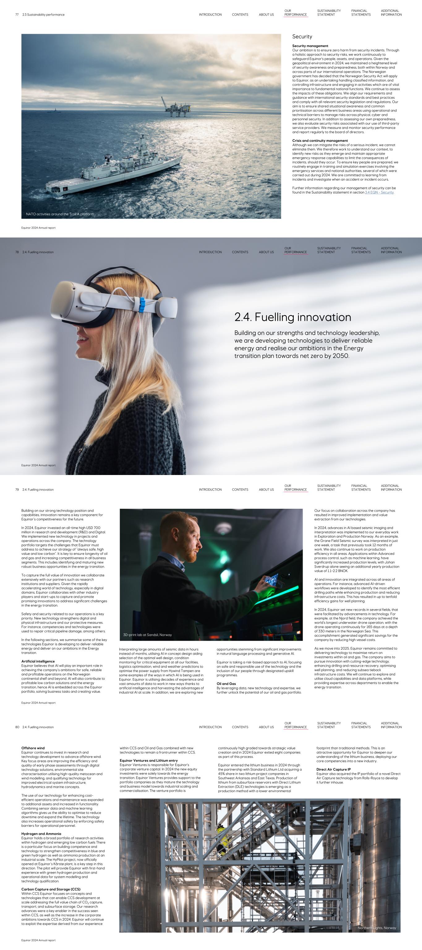 Security Security management Our ambition is to ensure zero harm from security incidents. Through a holistic approach to security risks, we work continuously to safeguard Equinor's people, assets, and operations. Given the geopolitical environment in 2024, we maintained a heightened level of security awareness and preparedness, both within Norway and across parts of our international operations. The Norwegian government has decided that the Norwegian Security Act will apply to Equinor, as an undertaking handling classified information, and controlling infrastructure and engaging in activities which are of vital importance to fundamental national functions. We continue to assess the impacts of these obligations. We align our requirements and guidance with international security standards and best practices and comply with all relevant security legislation and regulations. Our aim is to ensure shared situational awareness and common prioritisation across different business areas using operational and technical barriers to manage risks across physical, cyber and personnel security. In addition to assessing our own preparedness, we also evaluate security risks associated with our use of third-party service providers. We measure and monitor security performance and report regularly to the board of directors. Crisis and continuity management Although we can mitigate the risks of a serious incident, we cannot eliminate them. We therefore work to understand our context, to identify new risks as they emerge and maintain appropriate emergency response capabilities to limit the consequences of incidents, should they occur. To ensure key people are prepared, we routinely engage in training and simulation exercises involving the emergency services and national authorities, several of which were carried out during 2024. We are committed to learning from incidents and investigate when an accident or incident occurs, Further information regarding our management of security can be found in the Sustainability statement in section 3.4 EQN - Security. 77 INTRODUCTION CONTENTS ABOUT US OUR PERFORMANCE SUSTAINABILITY STATEMENT FINANCIAL STATEMENTS ADDITIONAL INFORMATION Equinor 2024 Annual report 2.3 Sustainability performance NATO activities around the Troll A platform 78 INTRODUCTION CONTENTS ABOUT US OUR PERFORMANCE SUSTAINABILITY STATEMENT FINANCIAL STATEMENTS ADDITIONAL INFORMATION Equinor 2024 Annual report 2.4. Fuelling innovation Building on our strengths and technology leadership, we are developing technologies to deliver reliable energy and realise our ambitions in the Energy transition plan towards net zero by 2050. 2.4. Fuelling innovation Building on our strong technology position and capabilities, innovation remains a key component for Equinor’s competitiveness for the future. In 2024, Equinor invested an all-time high USD 700 million in research and development (R&D) and Digital. We implemented new technology in projects and operations across the company. The technology portfolio targets the challenges that Equinor must address to achieve our strategy of “always safe, high value and low carbon”. It is key to ensure longevity of oil and gas and increasing competitiveness in all business segments. This includes identifying and maturing new robust business opportunities in the energy transition. To capture the full value of innovation we collaborate extensively with our partners such as research institutions and suppliers. Given the rapidly accelerating world of technology, especially in digital domains, Equinor collaborates with other industry players and start-ups to capture and promote promising innovations to address significant challenges in the energy transition. Safety and security related to our operations is a key priority. New technology strengthens digital and physical infrastructure and our protective measures. For instance, competencies and technologies were used to repair critical pipeline damage, among others. In the following sections, we summarise some of the key technologies Equinor is developing to deliver reliable energy and deliver on our ambitions in the Energy transition. Artificial intelligence Equinor believes that AI will play an important role in achieving the company’s ambitions for safe, reliable and profitable operations on the Norwegian continental shelf and beyond. AI will also contribute to profitable low carbon solutions and the energy transition, hence AI is embedded across the Equinor portfolio, solving business tasks and creating value. Interpreting large amounts of seismic data in hours instead of months, utilising AI in concept design aiding selection of the optimal well design, condition monitoring for critical equipment at all our facilities, logistics optimisation, wind and weather predictions to optimise the power supply from Hywind Tampen are some examples of the ways in which AI is being used in Equinor. Equinor is utilising decades of experience and vast amounts of data to work in new ways thanks to artificial intelligence and harvesting the advantages of industrial AI at scale. In addition, we are exploring new opportunities stemming from significant improvements in natural language processing and generative AI. Equinor is taking a risk-based approach to AI, focusing on safe and responsible use of the technology and the inclusion of our people through designated upskill programmes. Oil and Gas By leveraging data, new technology and expertise, we further unlock the potential of our oil and gas portfolio. Our focus on collaboration across the company has resulted in improved implementation and value extraction from our technologies. In 2024, advances in AI based seismic imaging and interpretation was implemented to our everyday work in Exploration and Production Norway. As an example, the Grane Field Seismic survey was interpreted in just one week, a task that previously took 12 months of work. We also continue to work on production efficiency i