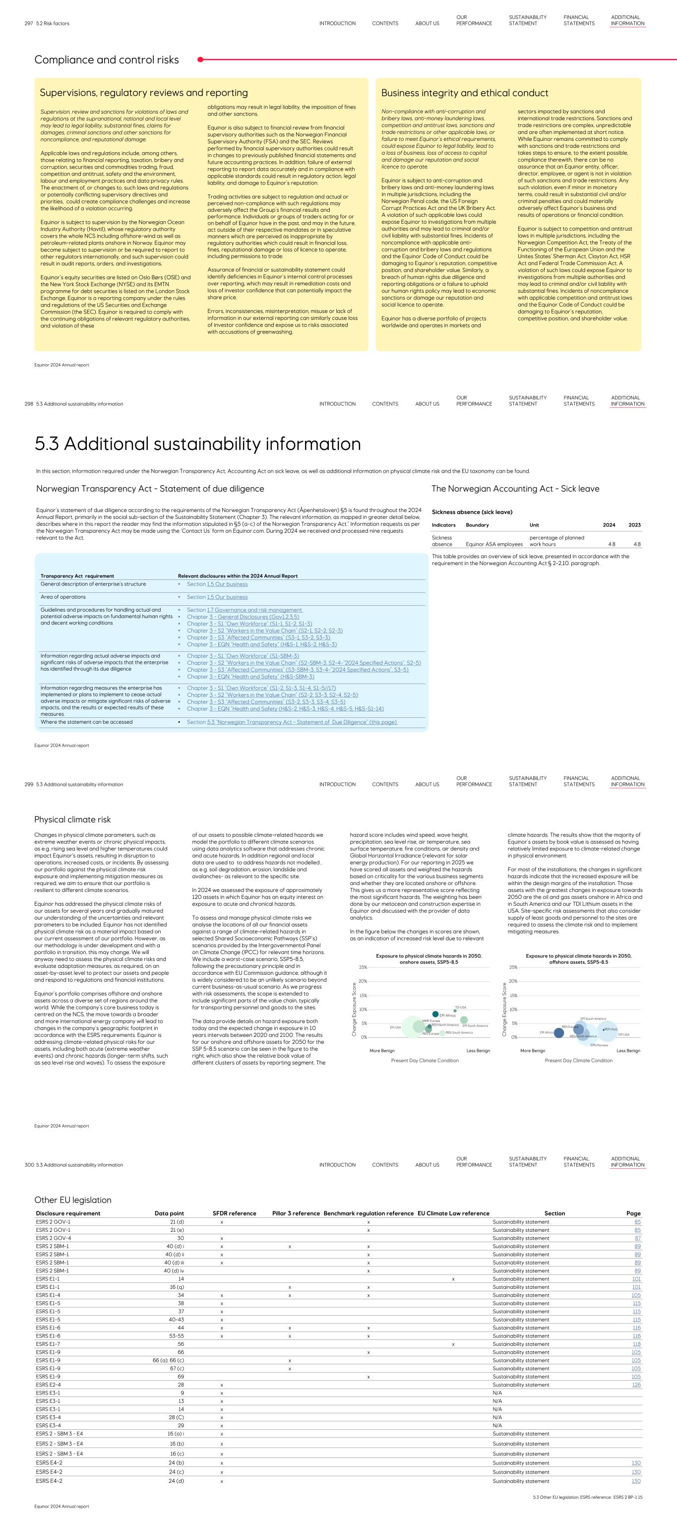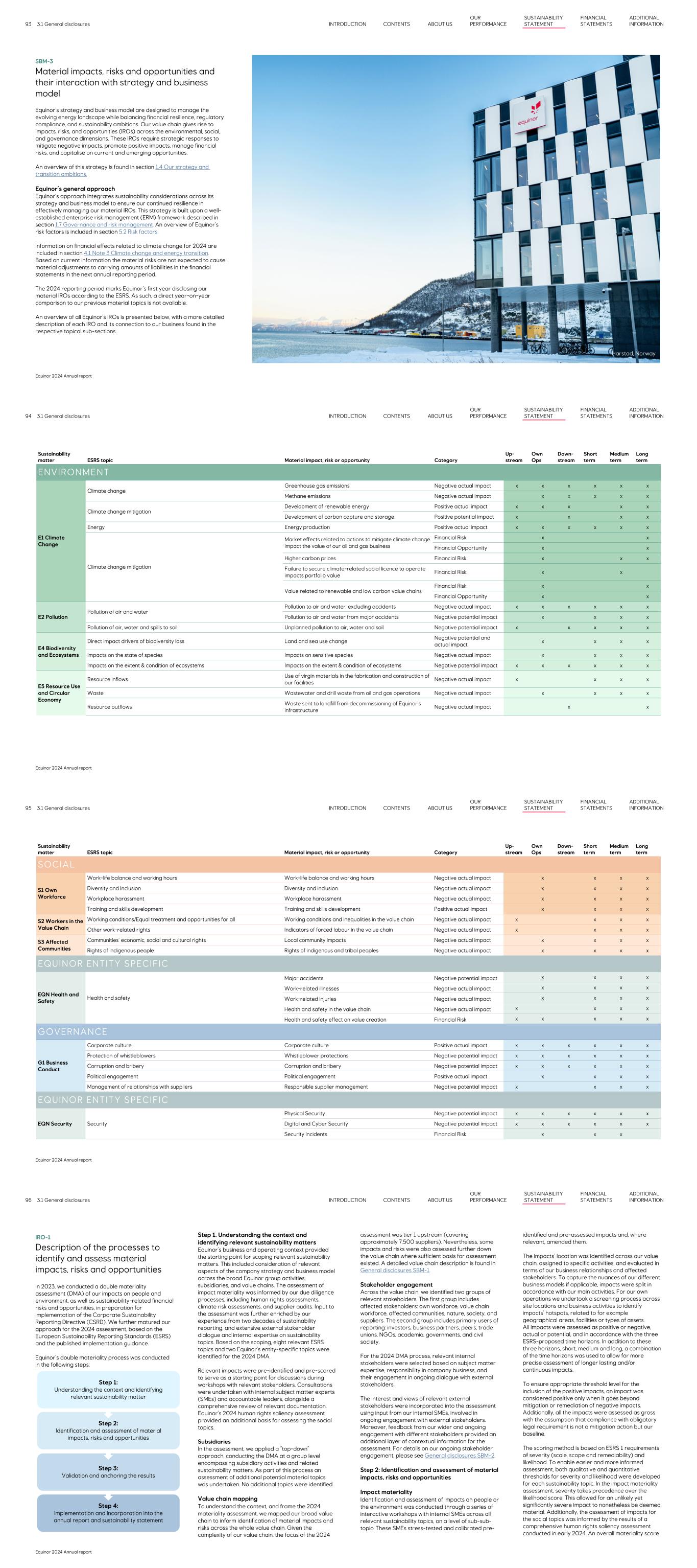 SBM-3 Material impacts, risks and opportunities and their interaction with strategy and business model Equinor’s strategy and business model are designed to manage the evolving energy landscape while balancing financial resilience, regulatory compliance, and sustainability ambitions. Our value chain gives rise to impacts, risks, and opportunities (IROs) across the environmental, social, and governance dimensions. These IROs require strategic responses to mitigate negative impacts, promote positive impacts, manage financial risks, and capitalise on current and emerging opportunities. An overview of this strategy is found in section 1.4 Our strategy and transition ambitions. Equinor’s general approach Equinor’s approach integrates sustainability considerations across its strategy and business model to ensure our continued resilience in effectively managing our material IROs. This strategy is built upon a well- established enterprise risk management (ERM) framework described in section 1.7 Governance and risk management. An overview of Equinor’s risk factors is included in section 5.2 Risk factors. Information on financial effects related to climate change for 2024 are included in section 4.1 Note 3 Climate change and energy transition. Based on current information the material risks are not expected to cause material adjustments to carrying amounts of liabilities in the financial statements in the next annual reporting period. The 2024 reporting period marks Equinor’s first year disclosing our material IROs according to the ESRS. As such, a direct year-on-year comparison to our previous material topics is not available. An overview of all Equinor’s IROs is presented below, with a more detailed description of each IRO and its connection to our business found in the respective topical sub-sections. 93 INTRODUCTION CONTENTS ABOUT US OUR PERFORMANCE SUSTAINABILITY STATEMENT FINANCIAL STATEMENTS ADDITIONAL INFORMATION Equinor 2024 Annual report Harstad, Norway 3.1 General disclosures 94 INTRODUCTION CONTENTS ABOUT US OUR PERFORMANCE SUSTAINABILITY STATEMENT FINANCIAL STATEMENTS ADDITIONAL INFORMATION Equinor 2024 Annual report Sustainability matter ESRS topic Material impact, risk or opportunity Category Up- stream Own Ops Down- stream Short term Medium term Long term ENVIRONMENT E1 Climate Change Climate change Greenhouse gas emissions Negative actual impact x x x x x x Methane emissions Negative actual impact x x x x x Climate change mitigation Development of renewable energy Positive actual impact x x x x x Development of carbon capture and storage Positive potential impact x x x x Energy Energy production Positive actual impact x x x x x x Climate change mitigation Market effects related to actions to mitigate climate change impact the value of our oil and gas business Financial Risk x x Financial Opportunity x x Higher carbon prices Financial Risk x x x Failure to secure climate-related social licence to operate impacts portfolio value Financial Risk x x Value related to renewable and low carbon value chains Financial Risk x x Financial Opportunity x x E2 Pollution Pollution of air and water Pollution to air and water, excluding accidents Negative actual impact x x x x x x Pollution to air and water from major accidents Negative potential impact x x x x Pollution of air, water and spills to soil Unplanned pollution to air, water and soil Negative potential impact x x x x x E4 Biodiversity and Ecosystems Direct impact drivers of biodiversity loss Land and sea use change Negative potential and actual impact x x x x Impacts on the state of species Impacts on sensitive species Negative actual impact x x x x Impacts on the extent & condition of ecosystems Impacts on the extent & condition of ecosystems Negative potential impact x x x x x x E5 Resource Use and Circular Economy Resource inflows Use of virgin materials in the fabrication and construction of our facilities Negative actual impact x x x x Waste Wastewater and drill waste from oil and gas operations Negative actual impact x x x x Resource outflows Waste sent to landfill from decommissioning of Equinor’s infrastructure Negative actual impact x x 3.1 General disclosures 95 INTRODUCTION CONTENTS ABOUT US OUR PERFORMANCE SUSTAINABILITY STATEMENT FINANCIAL STATEMENTS ADDITIONAL INFORMATION Equinor 2024 Annual report Sustainability matter ESRS topic Material impact, risk or opportunity Category Up- stream Own Ops Down- stream Short term Medium term Long term SOCIAL S1 Own Workforce Work-life balance and working hours Work-life balance and working hours Negative actual impact x x x x Diversity and Inclusion Diversity and inclusion Negative actual impact x x x x Workplace harassment Workplace harassment Negative actual impact x x x x Training and skills development Training and skills development Positive actual impact x x x x S2 Workers in the Value Chain Working conditions/Equal treatment and opportunities for all Working conditions and inequalities in the value chain Negative actual impact x x x x Other work-related rights Indicators of forced labour in the value chain Negative actual impact x x x x S3 Affected Communities Communities’ economic, social and cultural rights Local community impacts Negative actual impact x x x x Rights of indigenous people Rights of indigenous and tribal peoples Negative actual impact x x x x EQUINOR ENTITY SPECIFIC EQN Health and Safety Health and safety Major accidents Negative potential impact x x x x Work-related illnesses Negative actual impact x x x x Work-related injuries Negative actual impact x x x x Health and safety in the value chain Negative actual impact x x x x Health and safety effect on value creation Financial Risk x x x x x GOVERNANCE G1 Business Conduct Corporate culture Corporate culture Positive actual impact x x x x x x Protection of whistleblowers Whistleblower protections Negative potential impact x x x x x x Corruption and bribery Corruption and bribery Negative poten