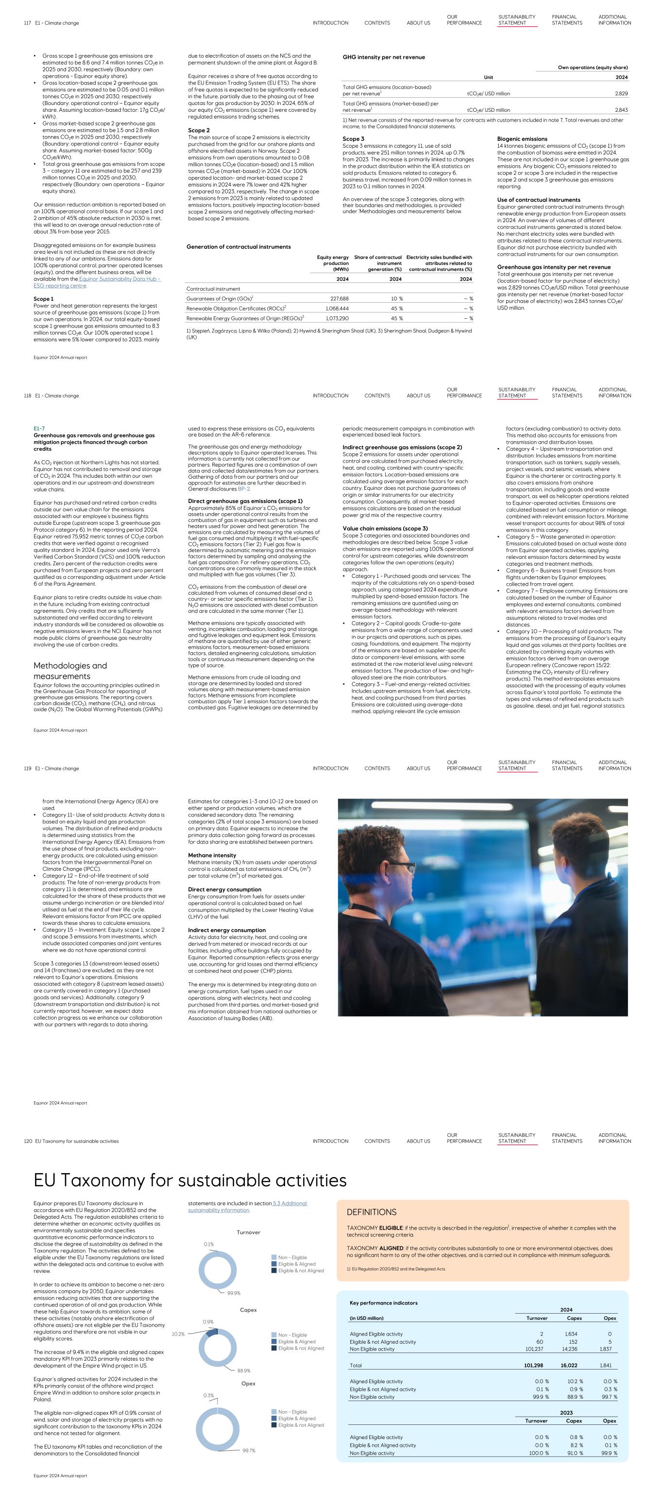 • Gross scope 1 greenhouse gas emissions are estimated to be 8.6 and 7.4 million tonnes CO2e in 2025 and 2030, respectively (Boundary: own operations - Equinor equity share). • Gross location-based scope 2 greenhouse gas emissions are estimated to be 0.05 and 0.1 million tonnes CO2e in 2025 and 2030, respectively (Boundary: operational control – Equinor equity share. Assuming location-based factor: 17g CO2e/ kWh). • Gross market-based scope 2 greenhouse gas emissions are estimated to be 1.5 and 2.8 million tonnes CO2e in 2025 and 2030, respectively (Boundary: operational control – Equinor equity share. Assuming market-based factor: 500g CO2e/kWh). • Total gross greenhouse gas emissions from scope 3 – category 11 are estimated to be 257 and 239 million tonnes CO2e in 2025 and 2030, respectively (Boundary: own operations – Equinor equity share). Our emission reduction ambition is reported based on an 100% operational control basis. If our scope 1 and 2 ambition of 45% absolute reduction in 2030 is met, this will lead to an average annual reduction rate of about 3% from base year 2015. Disaggregated emissions on for example business area level is not included as these are not directly linked to any of our ambitions. Emissions data for 100% operational control, partner operated licenses (equity), and the different business areas, will be available from the Equinor Sustainability Data Hub - ESG reporting centre. Scope 1 Power and heat generation represents the largest source of greenhouse gas emissions (scope 1) from our own operations. In 2024, our total equity-based scope 1 greenhouse gas emissions amounted to 8.3 million tonnes CO2e. Our 100% operated scope 1 emissions were 5% lower compared to 2023, mainly due to electrification of assets on the NCS and the permanent shutdown of the amine plant at Åsgard B. Equinor receives a share of free quotas according to the EU Emission Trading System (EU ETS). The share of free quotas is expected to be significantly reduced in the future, partially due to the phasing out of free quotas for gas production by 2030. In 2024, 65% of our equity CO2 emissions (scope 1) were covered by regulated emissions trading schemes. Scope 2 The main source of scope 2 emissions is electricity purchased from the grid for our onshore plants and offshore electrified assets in Norway. Scope 2 emissions from own operations amounted to 0.08 million tonnes CO2e (location-based) and 1.5 million tonnes CO2e (market-based) in 2024. Our 100% operated location- and market-based scope 2 emissions in 2024 were 7% lower and 42% higher compared to 2023, respectively. The change in scope 2 emissions from 2023 is mainly related to updated emissions factors, positively impacting location-based scope 2 emissions and negatively affecting marked- based scope 2 emissions. Scope 3 Scope 3 emissions in category 11, use of sold products, were 251 million tonnes in 2024, up 0.7% from 2023. The increase is primarily linked to changes in the product distribution within the IEA statistics on sold products. Emissions related to category 6, business travel, increased from 0.09 million tonnes in 2023 to 0.1 million tonnes in 2024. An overview of the scope 3 categories, along with their boundaries and methodologies, is provided under 'Methodologies and measurements' below. Biogenic emissions 14 ktonnes biogenic emissions of CO2 (scope 1) from the combustion of biomass were emitted in 2024. These are not included in our scope 1 greenhouse gas emissions. Any biogenic CO2 emissions related to scope 2 or scope 3 are included in the respective scope 2 and scope 3 greenhouse gas emissions reporting. Use of contractual instruments Equinor generated contractual instruments through renewable energy production from European assets in 2024. An overview of volumes of different contractual instruments generated is stated below. No merchant electricity sales were bundled with attributes related to these contractual instruments. Equinor did not purchase electricity bundled with contractual instruments for our own consumption. Greenhouse gas intensity per net revenue Total greenhouse gas intensity per net revenue (location-based factor for purchase of electricity) was 2,829 tonnes CO2e/USD million. Total greenhouse gas intensity per net revenue (market-based factor for purchase of electricity) was 2,843 tonnes CO2e/ USD million. 117 INTRODUCTION CONTENTS ABOUT US OUR PERFORMANCE SUSTAINABILITY STATEMENT FINANCIAL STATEMENTS ADDITIONAL INFORMATION Equinor 2024 Annual report Generation of contractual instruments Equity energy production (MWh) Share of contractual instrument generation (%) Electricity sales bundled with attributes related to contractual instruments (%) 2024 2024 2024 Contractual instrument Guarantees of Origin (GOs)1 227,688 10 % — % Renewable Obligation Certificates (ROCs)2 1,068,444 45 % — % Renewable Energy Guarantees of Origin (REGOs)3 1,073,290 45 % — % 1) Stępień, Zagórzyca, Lipno & Wilko (Poland), 2) Hywind & Sheringham Shoal (UK), 3) Sheringham Shoal, Dudgeon & Hywind (UK) GHG intensity per net revenue Own operations (equity share) Unit 2024 Total GHG emissions (location-based) per net revenue1 tCO2e/ USD million 2,829 Total GHG emissions (market-based) per net revenue1 tCO2e/ USD million 2,843 1) Net revenue consists of the reported revenue for contracts with customers included in note 7, Total revenues and other income, to the Consolidated financial statements. E1 - Climate change E1-7 Greenhouse gas removals and greenhouse gas mitigation projects financed through carbon credits As CO2 injection at Northern Lights has not started, Equinor has not contributed to removal and storage of CO2 in 2024. This includes both within our own operations and in our upstream and downstream value chains. Equinor has purchased and retired carbon credits outside our own value chain for the emissions associated with our employee’s business flights outside Europe (upstream scope 3, gre