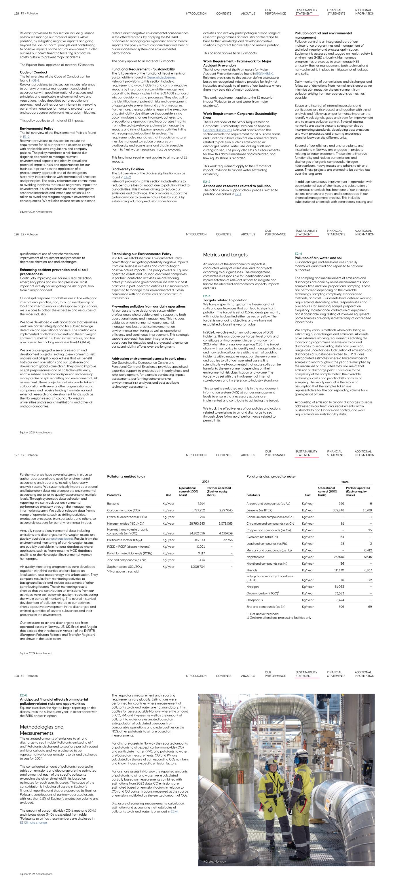Relevant provisions to this section include guidance on how we manage our material impacts within pollution, by mitigating negative impacts and going beyond the “do-no-harm” principle and contributing to positive impacts on the natural environment. It also outlines our commitment to fostering a proactive safety culture to prevent major accidents. The Equinor Book applies to all material E2 impacts. Code of Conduct The full overview of the Code of Conduct can be found in G1-1. Relevant provisions to this section include reference to our environmental management conducted in accordance with good international practices and principles and applicable environmental laws and regulations. It also describes our precautionary approach and outlines our commitment to improving our environmental performance to protect nature and support conservation and restoration initiatives. This policy applies to all material E2 impacts. Environmental Policy The full overview of the Environmental Policy is found in E1-2. Relevant provisions to this section include the requirement for all our operated assets to comply with applicable laws, regulations and company policies. The policy mandates a risk-based due diligence approach to manage relevant environmental aspects and identify actual and potential impacts, risks and opportunities for our business. It prescribes the application of a precautionary approach and of the mitigation hierarchy, in accordance with international practices and principles. The policy reiterates our commitment to avoiding incidents that could negatively impact the environment. If such incidents do occur, emergency response measures and immediate action will be taken to avoid and mitigate negative environmental consequences. We will also ensure action is taken to restore direct negative environmental consequences in the affected areas. By applying the ISO14001 principles to managing our significant environmental impacts, the policy aims at continued improvement of our management system and environmental performance. The policy applies to all material E2 impacts. Functional Requirement – Sustainability The full overview of the Functional Requirements on Sustainability is found in General disclosures. Relevant provisions to this section include a requirement to avoid incidents and control negative impacts by integrating sustainability management according to the principles in the ISO14001 standard into our decision-making processes. They also call for the identification of potential risks and development of appropriate prevention and control measures. Furthermore, these provisions require the execution of sustainability due diligence that considers risk, accommodates changes in context, adheres to a precautionary approach, and incorporates insights from affected stakeholders, aiming to manage the impacts and risks of Equinor group's activities in line with recognised mitigation hierarchies. The requirement also mandates that impacts on nature must be managed to reduce pressures on biodiversity and ecosystems and that irreversible harm to freshwater resources must be avoided. This functional requirement applies to all material E2 impacts. Biodiversity Position The full overview of the Biodiversity Position can be found in E4-2. Relevant provisions to this section include efforts to reduce nature loss or impact due to pollution linked to our activities. This involves aiming to reduce our emissions and discharge. The provisions support the global ambition to reverse nature loss by 2030, by establishing voluntary exclusion zones for our activities and actively participating in a wide range of research programmes and industry partnerships to build further knowledge and develop innovative solutions to protect biodiversity and reduce pollution. This position applies to all E2 impacts. Work Requirement – Framework for Major Accident Prevention The full overview of the Framework for Major Accident Prevention can be found in EQN-H&S-1. Relevant provisions to this section define a structure based on recognised industry practice for high-risk industries and apply to all parts of our business where there may be a risk of major accidents. This work requirement applies to the E2 material impact “Pollution to air and water from major accidents”. Work Requirement – Corporate Sustainability Data The full overview of the Work Requirement on Corporate Sustainability Data can be found in General disclosures. Relevant provisions to this section include the requirement for all business areas and functions to have relevant environmental data related to pollution, such as emissions to air, discharges, waste, water use, drilling fluids and cuttings to sea. The policy also sets out requirements for how this data is measured and calculated, and how equity share is recorded. This work requirement apply to the E2 material impact “Pollution to air and water (excluding accidents)”. E2-2 Actions and resources related to pollution The actions below support all our policies related to pollution described in E2-1. Pollution control and environmental management Pollution control is an integrated part of our maintenance programmes and management of technical integrity and process optimisation. Equipment is assessed and tagged on health, safety & environment (HSE) criticality. Maintenance programmes are set up to also manage HSE criticality. Barrier management, both technical and non-technical, is in place to mitigate risk of leakage and spills. Daily monitoring of our emissions and discharges and follow up of deviations from normal levels ensures we minimise our impact on the environment from pollution arising from our operations as much as possible. Scope and interval of internal inspections and verifications are risk-based, and together with trend analysis and follow-up on performance important to identify weak signals, gaps and room for improvement and to ensure pollution control. Several internal networks a