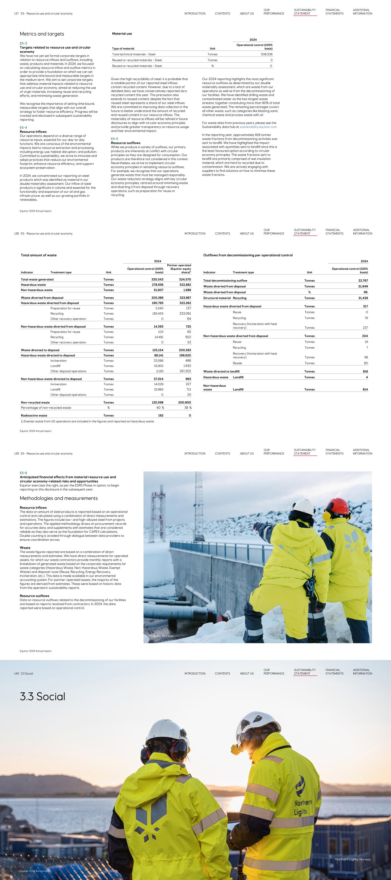 Metrics and targets E5-3 Targets related to resource use and circular economy We have not yet set formal corporate targets in relation to resource inflows and outflows, including waste, products and materials. In 2024, we focused on calculating resource inflow and outflow metrics in order to provide a foundation on which we can set appropriate time bound and measurable targets in the medium term. We aim to set corporate targets that address material impacts related to resource use and circular economy, aimed at reducing the use of virgin materials, increasing reuse and recycling efforts, and minimising waste generation. We recognise the importance of setting time bound, measurable targets that align with our overall strategy to foster resource efficiency. Progress will be tracked and disclosed in subsequent sustainability reporting. E5-4 Resource inflows Our operations depend on a diverse range of resource inputs, essential for our day-to-day functions. We are conscious of the environmental impacts tied to resource extraction and processing, including energy use, habitat disruption, and pollution. Committed to sustainability, we strive to innovate and adopt practices that reduce our environmental footprint, enhance resource efficiency, and support ecosystem preservation. In 2024, we concentrated our reporting on steel products which was identified as material in our double materiality assessment. Our inflow of steel products is significant in volume and essential for the functionality and expansion of our oil and gas infrastructure, as well as our growing portfolio in renewables. Given the high recyclability of steel, it is probable that a notable portion of our reported steel inflows contain recycled content. However, due to a lack of detailed data, we have conservatively reported zero recycled content this year. This precaution also extends to reused content; despite the fact that reused steel represents a share of our steel inflows. We are committed to improving data collection in the future to better understand the amount of recycled and reused content in our resource inflows. The materiality of resource inflows will be refined in future disclosures to align with circular economy principles and provide greater transparency on resource usage and their environmental impact. E5-5 Resource outflows While we produce a variety of outflows, our primary products are inherently at conflict with circular principles as they are designed for consumption. Our products are therefore not considered in this context. Nevertheless, we strive to implement circular economy principles in remaining resource outflows. For example, we recognise that our operations generate waste that must be managed responsibly. Our waste reduction strategy aligns with key circular economy principles, centred around minimising waste and diverting it from disposal through recovery operations, such as preparation for reuse or recycling. Our 2024 reporting highlights the most significant resource outflows as determined by our double materiality assessment, which are waste from our operations as well as from the decommissioning of our facilities. We have identified drilling waste and contaminated water as the two largest waste streams, together constituting more than 90% of total waste generated. The remaining percentages covers all other waste, such as categories like blasting sand, chemical waste and process waste with oil. For waste data from previous years, please see the Sustainability data hub at sustainability.equinor.com In the reporting year, approximately 818 tonnes waste fractions from decommissioning activities was sent to landfill. We have highlighted the impact associated with quantities sent to landfill since this is the least favoured option according to circular economy principles. The waste fractions sent to landfill are primarily comprised of wet insulation material, which are hard to recycled due to contamination. We are actively engaging with suppliers to find solutions on how to minimise these waste fractions. 137 INTRODUCTION CONTENTS ABOUT US OUR PERFORMANCE SUSTAINABILITY STATEMENT FINANCIAL STATEMENTS ADDITIONAL INFORMATION Equinor 2024 Annual report Material use 2024 Type of material Unit Operational control (100% basis) Total technical materials - Steel Tonnes 308,306 Reused or recycled materials - Steel Tonnes 0 Reused or recycled materials - Steel % 0 E5 - Resource use and circular economy 138 INTRODUCTION CONTENTS ABOUT US OUR PERFORMANCE SUSTAINABILITY STATEMENT FINANCIAL STATEMENTS ADDITIONAL INFORMATION Equinor 2024 Annual report Total amount of waste 2024 Indicator Treatment type Unit Operational control (100% basis) Partner operated (Equinor equity share)1 Total waste generated Tonnes 330,543 524,570 Hazardous waste Tonnes 278,936 522,882 Non-hazardous waste Tonnes 51,607 1,688 Waste diverted from disposal Tonnes 205,389 323,987 Hazardous waste diverted from disposal Tonnes 190,795 323,262 Preparation for reuse Tonnes 5,340 137 Recycling Tonnes 185,455 323,061 Other recovery operation Tonnes 0 64 Non-hazardous waste diverted from disposal Tonnes 14,593 725 Preparation for reuse Tonnes 103 62 Recycling Tonnes 14,491 610 Other recovery operation Tonnes 0 53 Waste directed to disposal Tonnes 125,154 200,583 Hazardous waste directed to disposal Tonnes 88,141 199,620 Incineration Tonnes 33,096 486 Landfill Tonnes 52,852 1,932 Other disposal operations Tonnes 2,193 197,202 Non-hazardous waste directed to disposal Tonnes 37,014 963 Incineration Tonnes 14,029 227 Landfill Tonnes 22,985 711 Other disposal operations Tonnes 0 25 Non-recycled waste Tonnes 130,598 200,900 Percentage of non-recycled waste % 40 % 38 % Radioactive waste Tonnes 192 0 1) Exempt waste from US operations are included in the figures and reported as hazardous waste Outflows from decommissioning per operational control 2024 Indicator Treatment type Unit Operational control (100% basis) Total decommissioning outflow Tonnes 22,767 W