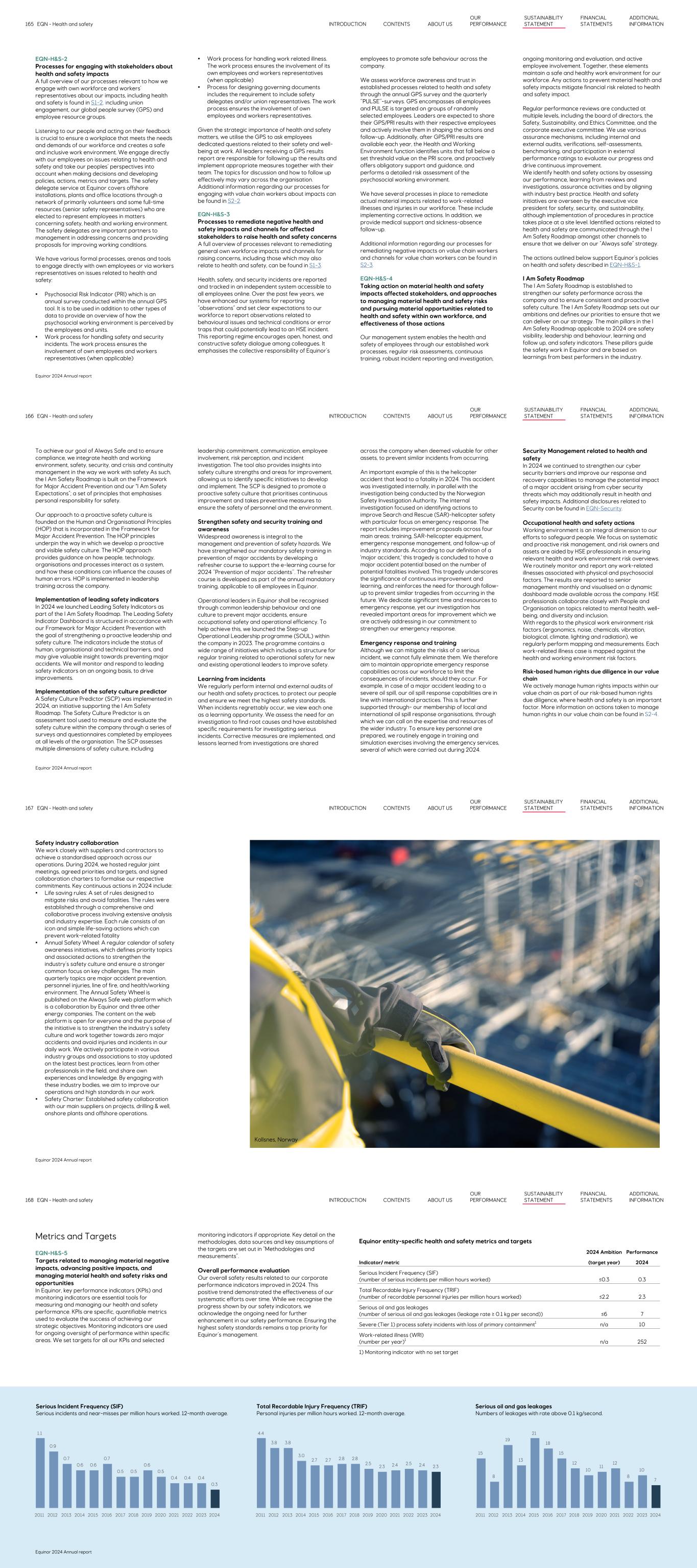EQN-H&S-2 Processes for engaging with stakeholders about health and safety impacts A full overview of our processes relevant to how we engage with own workforce and workers’ representatives about our impacts, including health and safety is found in S1-2, including union engagement, our global people survey (GPS) and employee resource groups. Listening to our people and acting on their feedback is crucial to ensure a workplace that meets the needs and demands of our workforce and creates a safe and inclusive work environment. We engage directly with our employees on issues relating to health and safety and take our peoples’ perspectives into account when making decisions and developing policies, actions, metrics and targets. The safety delegate service at Equinor covers offshore installations, plants and office locations through a network of primarily volunteers and some full-time resources (senior safety representatives) who are elected to represent employees in matters concerning safety, health and working environment. The safety delegates are important partners to management in addressing concerns and providing proposals for improving working conditions. We have various formal processes, arenas and tools to engage directly with own employees or via workers representatives on issues related to health and safety: • Psychosocial Risk Indicator (PRI) which is an annual survey conducted within the annual GPS tool. It is to be used in addition to other types of data to provide an overview of how the psychosocial working environment is perceived by the employees and units. • Work process for handling safety and security incidents. The work process ensures the involvement of own employees and workers representatives (when applicable) • Work process for handling work related illness. The work process ensures the involvement of its own employees and workers representatives (when applicable) • Process for designing governing documents includes the requirement to include safety delegates and/or union representatives. The work process ensures the involvement of own employees and workers representatives. Given the strategic importance of health and safety matters, we utilise the GPS to ask employees dedicated questions related to their safety and well- being at work. All leaders receiving a GPS results report are responsible for following up the results and implement appropriate measures together with their team. The topics for discussion and how to follow up effectively may vary across the organisation. Additional information regarding our processes for engaging with value chain workers about impacts can be found in S2-2. EQN-H&S-3 Processes to remediate negative health and safety impacts and channels for affected stakeholders to raise health and safety concerns A full overview of processes relevant to remediating general own workforce impacts and channels for raising concerns, including those which may also relate to health and safety, can be found in S1-3. Health, safety, and security incidents are reported and tracked in an independent system accessible to all employees online. Over the past few years, we have enhanced our systems for reporting “observations” and set clear expectations to our workforce to report observations related to behavioural issues and technical conditions or error traps that could potentially lead to an HSE incident. This reporting regime encourages open, honest, and constructive safety dialogue among colleagues. It emphasises the collective responsibility of Equinor’s employees to promote safe behaviour across the company. We assess workforce awareness and trust in established processes related to health and safety through the annual GPS survey and the quarterly ‘’PULSE’’-surveys. GPS encompasses all employees and PULSE is targeted on groups of randomly selected employees. Leaders are expected to share their GPS/PRI results with their respective employees and actively involve them in shaping the actions and follow-up. Additionally, after GPS/PRI results are available each year, the Health and Working Environment function identifies units that fall below a set threshold value on the PRI score, and proactively offers obligatory support and guidance, and performs a detailed risk assessment of the psychosocial working environment. We have several processes in place to remediate actual material impacts related to work-related illnesses and injuries in our workforce. These include implementing corrective actions. In addition, we provide medical support and sickness-absence follow-up. Additional information regarding our processes for remediating negative impacts on value chain workers and channels for value chain workers can be found in S2-3. EQN-H&S-4 Taking action on material health and safety impacts affected stakeholders, and approaches to managing material health and safety risks and pursuing material opportunities related to health and safety within own workforce, and effectiveness of those actions Our management system enables the health and safety of employees through our established work processes, regular risk assessments, continuous training, robust incident reporting and investigation, ongoing monitoring and evaluation, and active employee involvement. Together, these elements maintain a safe and healthy work environment for our workforce. Any actions to prevent material health and safety impacts mitigate financial risk related to health and safety impact. Regular performance reviews are conducted at multiple levels, including the board of directors, the Safety, Sustainability, and Ethics Committee, and the corporate executive committee. We use various assurance mechanisms, including internal and external audits, verifications, self-assessments, benchmarking, and participation in external performance ratings to evaluate our progress and drive continuous improvement. We identify health and safety actions by assessing our performance, learni