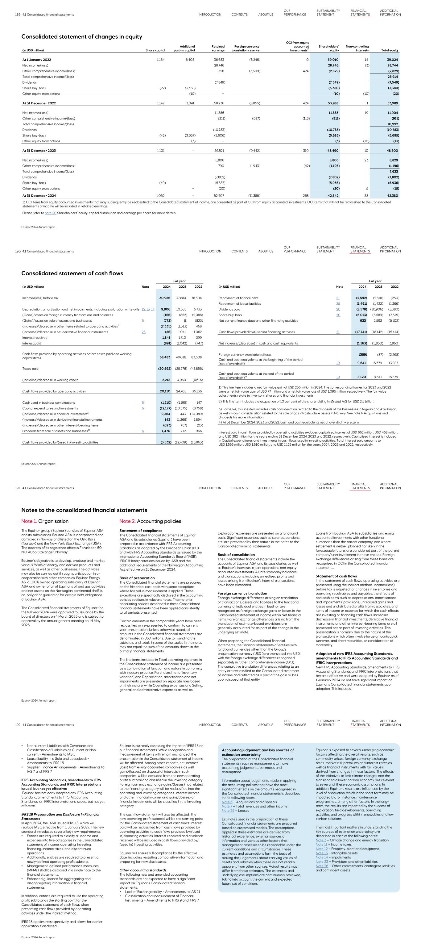 Consolidated statement of changes in equity (in USD million) Share capital Additional paid-in capital Retained earnings Foreign currency translation reserve OCI from equity accounted investments1) Shareholders' equity Non-controlling interests Total equity At 1 January 2022 1,164 6,408 36,683 (5,245) 0 39,010 14 39,024 Net income/(loss) 28,746 28,746 (3) 28,744 Other comprehensive income/(loss) 356 (3,609) 424 (2,829) (2,829) Total comprehensive income/(loss) 25,914 Dividends (7,549) (7,549) (7,549) Share buy-back (22) (3,358) — (3,380) (3,380) Other equity transactions (10) — (10) (10) (20) At 31 December 2022 1,142 3,041 58,236 (8,855) 424 53,988 1 53,989 Net income/(loss) 11,885 11,885 19 11,904 Other comprehensive income/(loss) (211) (587) (113) (911) (911) Total comprehensive income/(loss) 10,992 Dividends (10,783) (10,783) (10,783) Share buy-back (42) (3,037) (2,606) (5,685) (5,685) Other equity transactions (3) — (3) (10) (13) At 31 December 2023 1,101 — 56,521 (9,442) 310 48,490 10 48,500 Net income/(loss) 8,806 8,806 23 8,829 Other comprehensive income/(loss) 790 (1,943) (42) (1,196) (1,196) Total comprehensive income/(loss) 7,633 Dividends (7,802) (7,802) (7,802) Share buy-back (49) — (5,887) (5,936) (5,936) Other equity transactions — (20) (20) 5 (15) At 31 December 2024 1,052 — 52,407 (11,385) 268 42,342 38 42,380 1) OCI items from equity accounted investments that may subsequently be reclassified to the Consolidated statement of income, are presented as part of OCI from equity accounted investments. OCI items that will not be reclassified to the Consolidated statements of income will be included in retained earnings. Please refer to note 20 Shareholders’ equity, capital distribution and earnings per share for more details 189 INTRODUCTION CONTENTS ABOUT US OUR PERFORMANCE SUSTAINABILITY STATEMENT FINANCIAL STATEMENTS ADDITIONAL INFORMATION Equinor 2024 Annual report 4.1 Consolidated financial statements Consolidated statement of cash flows Full year (in USD million) Note 2024 2023 2022 Income/(loss) before tax 30,986 37,884 78,604 Depreciation, amortisation and net impairments, including exploration write-offs 12, 13, 14 9,906 10,581 6,733 (Gains)/losses on foreign currency transactions and balances (166) (852) (2,088) (Gains)/losses on sale of assets and businesses 6 (772) 8 (823) (Increase)/decrease in other items related to operating activities1) (2,335) (1,313) 468 (Increase)/decrease in net derivative financial instruments 28 (86) 1,041 1,062 Interest received 1,841 1,710 399 Interest paid (891) (1,042) (747) Cash flows provided by operating activities before taxes paid and working capital items 38,483 48,016 83,608 Taxes paid (20,592) (28,276) (43,856) (Increase)/decrease in working capital 2,218 4,960 (4,616) Cash flows provided by operating activities 20,110 24,701 35,136 Cash used in business combinations 6 (1,710) (1,195) 147 Capital expenditures and investments 6 (12,177) (10,575) (8,758) (Increase)/decrease in financial investments2) 9,364 443 (10,089) (Increase)/decrease in derivative financial instruments 143 (1,266) 1,894 (Increase)/decrease in other interest-bearing items (623) (87) (23) Proceeds from sale of assets and businesses3) 6 1,470 272 966 Cash flows provided by/(used in) investing activities (3,532) (12,409) (15,863) Full year (in USD million) Note 2024 2023 2022 Repayment of finance debt 21 (2,592) (2,818) (250) Repayment of lease liabilities 25 (1,491) (1,422) (1,366) Dividends paid 20 (8,578) (10,906) (5,380) Share buy-back 20 (6,013) (5,589) (3,315) Net current finance debt and other financing activities 933 2,593 (5,102) Cash flows provided by/(used in) financing activities 21 (17,741) (18,142) (15,414) Net increase/(decrease) in cash and cash equivalents (1,163) (5,850) 3,860 Foreign currency translation effects (359) (87) (2,268) Cash and cash equivalents at the beginning of the period (net of overdraft) 19 9,641 15,579 13,987 Cash and cash equivalents at the end of the period (net of overdraft)4) 19 8,120 9,641 15,579 1) This line item includes a net fair value gain of USD 256 million in 2024. The corresponding figures for 2023 and 2022 were a net fair value gain of USD 77 million and a net fair value loss of USD 1,095 million, respectively. The fair value adjustments relate to inventory, shares and financial investments. 2) This line item includes the acquisition of 10 per cent of the shareholding in Ørsted A/S for USD 2.5 billion. 3) For 2024, this line item includes cash consideration related to the disposals of the businesses in Nigeria and Azerbaijan, as well as cash consideration related to the sale of gas infrastructure assets in Norway. See note 6 Acquisitions and disposals for more information. 4) At 31 December 2024, 2023 and 2022, cash and cash equivalents net of overdraft were zero. Interest paid in cash flows provided by operating activities excludes capitalised interest of USD 662 million, USD 468 million, and USD 382 million for the years ending 31 December 2024, 2023 and 2022, respectively. Capitalised interest is included in Capital expenditures and investments in cash flows used in investing activities. Total interest paid amounts to USD 1,553 million, USD 1,510 million, and USD 1,129 million for the years 2024, 2023 and 2022, respectively. 190 INTRODUCTION CONTENTS ABOUT US OUR PERFORMANCE SUSTAINABILITY STATEMENT FINANCIAL STATEMENTS ADDITIONAL INFORMATION Equinor 2024 Annual report 4.1 Consolidated financial statements Notes to the consolidated financial statements Note 1. Organisation The Equinor group (Equinor) consists of Equinor ASA and its subsidiaries. Equinor ASA is incorporated and domiciled in Norway and listed on the Oslo Børs (Norway) and the New York Stock Exchange (USA). The address of its registered office is Forusbeen 50, NO-4035 Stavanger, Norway. Equinor’s objective is to develop, produce and market various forms of energy and derived products and services, as well as other businesses