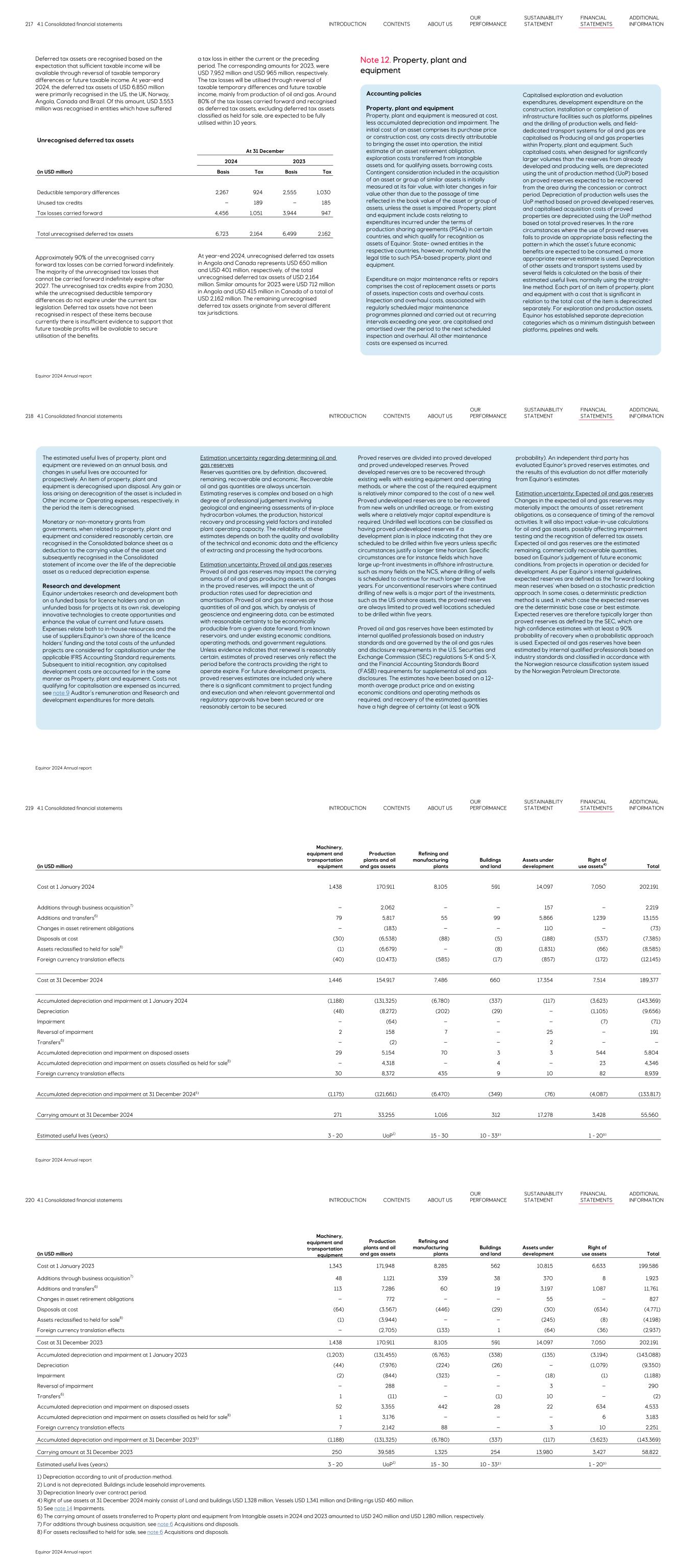 Deferred tax assets are recognised based on the expectation that sufficient taxable income will be available through reversal of taxable temporary differences or future taxable income. At year-end 2024, the deferred tax assets of USD 6,850 million were primarily recognised in the US, the UK, Norway, Angola, Canada and Brazil. Of this amount, USD 3,553 million was recognised in entities which have suffered Unrecognised deferred tax assets At 31 December 2024 2023 (in USD million) Basis Tax Basis Tax Deductible temporary differences 2,267 924 2,555 1,030 Unused tax credits — 189 — 185 Tax losses carried forward 4,456 1,051 3,944 947 Total unrecognised deferred tax assets 6,723 2,164 6,499 2,162 Approximately 90% of the unrecognised carry forward tax losses can be carried forward indefinitely. The majority of the unrecognised tax losses that cannot be carried forward indefinitely expire after 2027. The unrecognised tax credits expire from 2030, while the unrecognised deductible temporary differences do not expire under the current tax legislation. Deferred tax assets have not been recognised in respect of these items because currently there is insufficient evidence to support that future taxable profits will be available to secure utilisation of the benefits. a tax loss in either the current or the preceding period. The corresponding amounts for 2023, were USD 7,952 million and USD 965 million, respectively. The tax losses will be utilised through reversal of taxable temporary differences and future taxable income, mainly from production of oil and gas. Around 80% of the tax losses carried forward and recognised as deferred tax assets, excluding deferred tax assets classified as held for sale, are expected to be fully utilised within 10 years. At year-end 2024, unrecognised deferred tax assets in Angola and Canada represents USD 650 million and USD 401 million, respectively, of the total unrecognised deferred tax assets of USD 2,164 million. Similar amounts for 2023 were USD 712 million in Angola and USD 415 million in Canada of a total of USD 2,162 million. The remaining unrecognised deferred tax assets originate from several different tax jurisdictions. Note 12. Property, plant and equipment Accounting policies Property, plant and equipment Property, plant and equipment is measured at cost, less accumulated depreciation and impairment. The initial cost of an asset comprises its purchase price or construction cost, any costs directly attributable to bringing the asset into operation, the initial estimate of an asset retirement obligation, exploration costs transferred from intangible assets and, for qualifying assets, borrowing costs. Contingent consideration included in the acquisition of an asset or group of similar assets is initially measured at its fair value, with later changes in fair value other than due to the passage of time reflected in the book value of the asset or group of assets, unless the asset is impaired. Property, plant and equipment include costs relating to expenditures incurred under the terms of production sharing agreements (PSAs) in certain countries, and which qualify for recognition as assets of Equinor. State- owned entities in the respective countries, however, normally hold the legal title to such PSA-based property, plant and equipment. Expenditure on major maintenance refits or repairs comprises the cost of replacement assets or parts of assets, inspection costs and overhaul costs. Inspection and overhaul costs, associated with regularly scheduled major maintenance programmes planned and carried out at recurring intervals exceeding one year, are capitalised and amortised over the period to the next scheduled inspection and overhaul. All other maintenance costs are expensed as incurred. Capitalised exploration and evaluation expenditures, development expenditure on the construction, installation or completion of infrastructure facilities such as platforms, pipelines and the drilling of production wells, and field- dedicated transport systems for oil and gas are capitalised as Producing oil and gas properties within Property, plant and equipment. Such capitalised costs, when designed for significantly larger volumes than the reserves from already developed and producing wells, are depreciated using the unit of production method (UoP) based on proved reserves expected to be recovered from the area during the concession or contract period. Depreciation of production wells uses the UoP method based on proved developed reserves, and capitalised acquisition costs of proved properties are depreciated using the UoP method based on total proved reserves. In the rare circumstances where the use of proved reserves fails to provide an appropriate basis reflecting the pattern in which the asset’s future economic benefits are expected to be consumed, a more appropriate reserve estimate is used. Depreciation of other assets and transport systems used by several fields is calculated on the basis of their estimated useful lives, normally using the straight- line method. Each part of an item of property, plant and equipment with a cost that is significant in relation to the total cost of the item is depreciated separately. For exploration and production assets, Equinor has established separate depreciation categories which as a minimum distinguish between platforms, pipelines and wells. 217 INTRODUCTION CONTENTS ABOUT US OUR PERFORMANCE SUSTAINABILITY STATEMENT FINANCIAL STATEMENTS ADDITIONAL INFORMATION Equinor 2024 Annual report 4.1 Consolidated financial statements The estimated useful lives of property, plant and equipment are reviewed on an annual basis, and changes in useful lives are accounted for prospectively. An item of property, plant and equipment is derecognised upon disposal. Any gain or loss arising on derecognition of the asset is included in Other income or Operating expenses, respectively, in the period the item is derecognised. Monetary or non-monetar