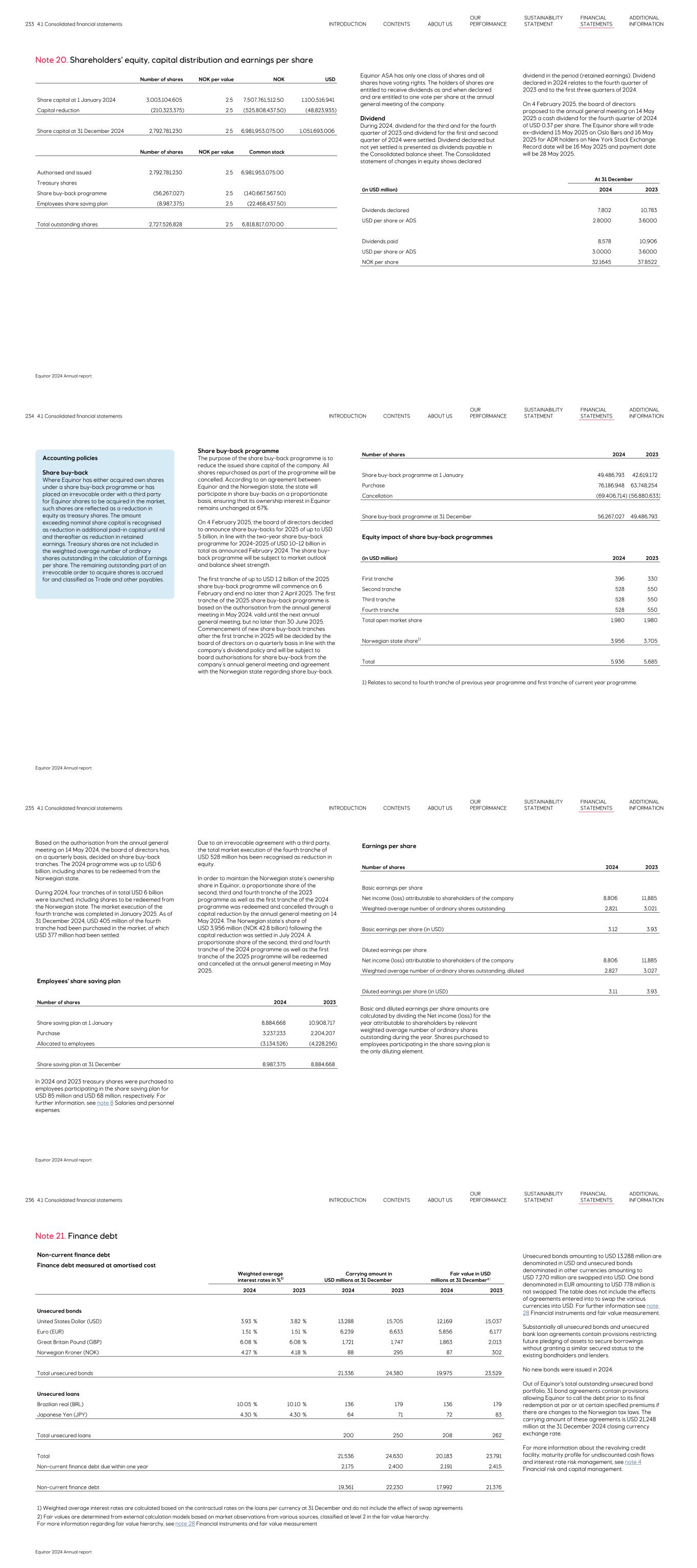 Note 20. Shareholders' equity, capital distribution and earnings per share Number of shares NOK per value NOK USD Share capital at 1 January 2024 3,003,104,605 2.5 7,507,761,512.50 1,100,516,941 Capital reduction (210,323,375) 2.5 (525,808,437.50) (48,823,935) Share capital at 31 December 2024 2,792,781,230 2.5 6,981,953,075.00 1,051,693,006 Number of shares NOK per value Common stock Authorised and issued 2,792,781,230 2.5 6,981,953,075.00 Treasury shares Share buy-back programme (56,267,027) 2.5 (140,667,567.50) Employees share saving plan (8,987,375) 2.5 (22,468,437.50) Total outstanding shares 2,727,526,828 2.5 6,818,817,070.00 Equinor ASA has only one class of shares and all shares have voting rights. The holders of shares are entitled to receive dividends as and when declared and are entitled to one vote per share at the annual general meeting of the company. Dividend During 2024, dividend for the third and for the fourth quarter of 2023 and dividend for the first and second quarter of 2024 were settled. Dividend declared but not yet settled is presented as dividends payable in the Consolidated balance sheet. The Consolidated statement of changes in equity shows declared At 31 December (in USD million) 2024 2023 Dividends declared 7,802 10,783 USD per share or ADS 2.8000 3.6000 Dividends paid 8,578 10,906 USD per share or ADS 3.0000 3.6000 NOK per share 32.1645 37.8522 dividend in the period (retained earnings). Dividend declared in 2024 relates to the fourth quarter of 2023 and to the first three quarters of 2024. On 4 February 2025, the board of directors proposed to the annual general meeting on 14 May 2025 a cash dividend for the fourth quarter of 2024 of USD 0.37 per share. The Equinor share will trade ex-dividend 15 May 2025 on Oslo Børs and 16 May 2025 for ADR holders on New York Stock Exchange. Record date will be 16 May 2025 and payment date will be 28 May 2025. 233 INTRODUCTION CONTENTS ABOUT US OUR PERFORMANCE SUSTAINABILITY STATEMENT FINANCIAL STATEMENTS ADDITIONAL INFORMATION Equinor 2024 Annual report 4.1 Consolidated financial statements Accounting policies Share buy-back Where Equinor has either acquired own shares under a share buy-back programme or has placed an irrevocable order with a third party for Equinor shares to be acquired in the market, such shares are reflected as a reduction in equity as treasury shares. The amount exceeding nominal share capital is recognised as reduction in additional paid-in capital until nil and thereafter as reduction in retained earnings. Treasury shares are not included in the weighted average number of ordinary shares outstanding in the calculation of Earnings per share. The remaining outstanding part of an irrevocable order to acquire shares is accrued for and classified as Trade and other payables. Share buy-back programme The purpose of the share buy-back programme is to reduce the issued share capital of the company. All shares repurchased as part of the programme will be cancelled. According to an agreement between Equinor and the Norwegian state, the state will participate in share buy-backs on a proportionate basis, ensuring that its ownership interest in Equinor remains unchanged at 67%. On 4 February 2025, the board of directors decided to announce share buy-backs for 2025 of up to USD 5 billion, in line with the two-year share buy-back programme for 2024-2025 of USD 10-12 billion in total as announced February 2024. The share buy- back programme will be subject to market outlook and balance sheet strength. The first tranche of up to USD 1.2 billion of the 2025 share buy-back programme will commence on 6 February and end no later than 2 April 2025. The first tranche of the 2025 share buy-back programme is based on the authorisation from the annual general meeting in May 2024, valid until the next annual general meeting, but no later than 30 June 2025. Commencement of new share buy-back tranches after the first tranche in 2025 will be decided by the board of directors on a quarterly basis in line with the company’s dividend policy and will be subject to board authorisations for share buy-back from the company’s annual general meeting and agreement with the Norwegian state regarding share buy-back. Number of shares 2024 2023 Share buy-back programme at 1 January 49,486,793 42,619,172 Purchase 76,186,948 63,748,254 Cancellation (69,406,714) (56,880,633) Share buy-back programme at 31 December 56,267,027 49,486,793 Equity impact of share buy-back programmes (in USD million) 2024 2023 First tranche 396 330 Second tranche 528 550 Third tranche 528 550 Fourth tranche 528 550 Total open market share 1,980 1,980 Norwegian state share1) 3,956 3,705 Total 5,936 5,685 1) Relates to second to fourth tranche of previous year programme and first tranche of current year programme. 234 INTRODUCTION CONTENTS ABOUT US OUR PERFORMANCE SUSTAINABILITY STATEMENT FINANCIAL STATEMENTS ADDITIONAL INFORMATION Equinor 2024 Annual report 4.1 Consolidated financial statements Based on the authorisation from the annual general meeting on 14 May 2024, the board of directors has, on a quarterly basis, decided on share buy-back tranches. The 2024 programme was up to USD 6 billion, including shares to be redeemed from the Norwegian state. During 2024, four tranches of in total USD 6 billion were launched, including shares to be redeemed from the Norwegian state. The market execution of the fourth tranche was completed in January 2025. As of 31 December 2024, USD 405 million of the fourth tranche had been purchased in the market, of which USD 377 million had been settled. Employees' share saving plan Number of shares 2024 2023 Share saving plan at 1 January 8,884,668 10,908,717 Purchase 3,237,233 2,204,207 Allocated to employees (3,134,526) (4,228,256) Share saving plan at 31 December 8,987,375 8,884,668 In 2024 and 2023 treasury shares were purchased to employees participating in the share saving plan for USD 85 million and USD 68 million, respecti