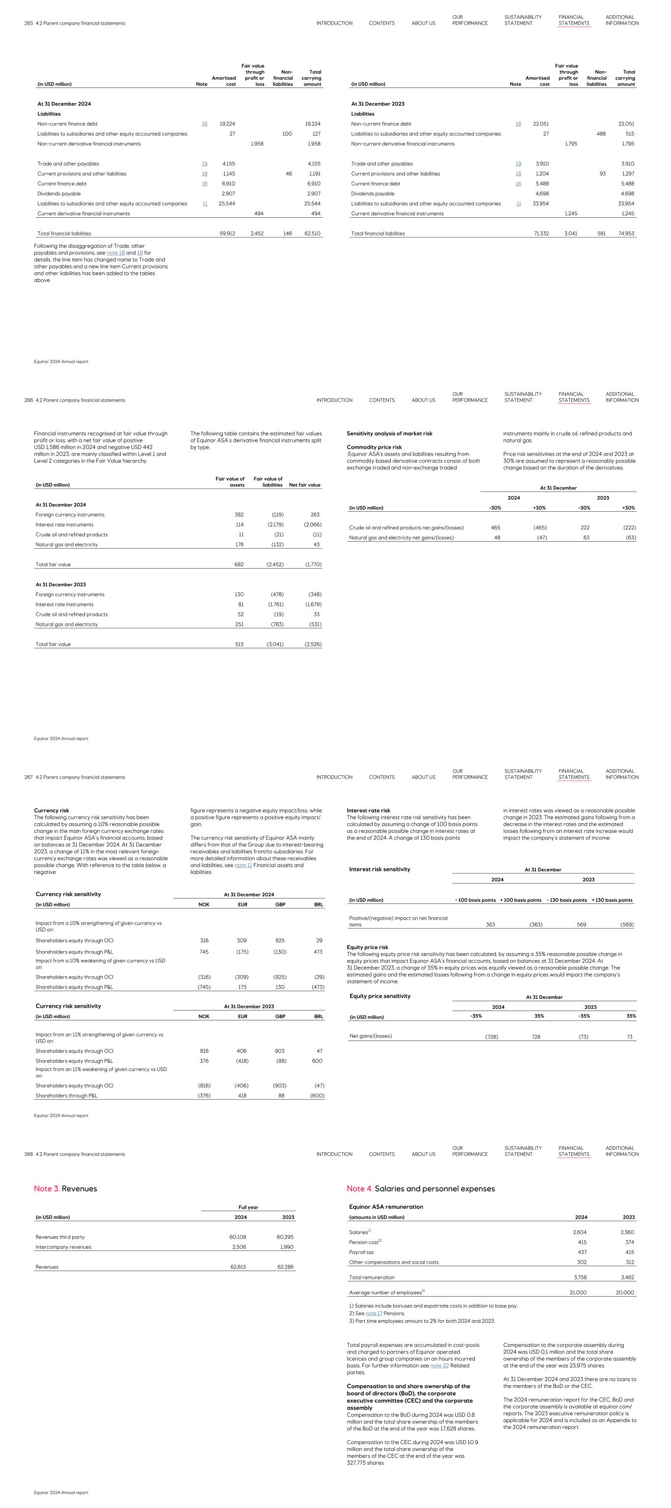 Following the disaggregation of Trade, other payables and provisions, see note 18 and 19 for details, the line item has changed name to Trade and other payables and a new line item Current provisions and other liabilities has been added to the tables above. 265 INTRODUCTION CONTENTS ABOUT US OUR PERFORMANCE SUSTAINABILITY STATEMENT FINANCIAL STATEMENTS ADDITIONAL INFORMATION Equinor 2024 Annual report (in USD million) Note Amortised cost Fair value through profit or loss Non- financial liabilities Total carrying amount At 31 December 2024 Liabilities Non-current finance debt 16 19,224 19,224 Liabilities to subsidiaries and other equity accounted companies 27 100 127 Non-current derivative financial instruments 1,958 1,958 Trade and other payables 19 4,155 4,155 Current provisions and other liabilities 18 1,145 46 1,191 Current finance debt 16 6,910 6,910 Dividends payable 2,907 2,907 Liabilities to subsidiaries and other equity accounted companies 11 25,544 25,544 Current derivative financial instruments 494 494 Total financial liabilities 59,912 2,452 146 62,510 (in USD million) Note Amortised cost Fair value through profit or loss Non- financial liabilities Total carrying amount At 31 December 2023 Liabilities Non-current finance debt 16 22,051 22,051 Liabilities to subsidiaries and other equity accounted companies 27 488 515 Non-current derivative financial instruments 1,795 1,795 Trade and other payables 19 3,910 3,910 Current provisions and other liabilities 18 1,204 93 1,297 Current finance debt 16 5,488 5,488 Dividends payable 4,698 4,698 Liabilities to subsidiaries and other equity accounted companies 11 33,954 33,954 Current derivative financial instruments 1,245 1,245 Total financial liabilities 71,332 3,041 581 74,953 4.2 Parent company financial statements Financial instruments recognised at fair value through profit or loss, with a net fair value of positive USD 1,586 million in 2024 and negative USD 442 million in 2023, are mainly classified within Level 1 and Level 2 categories in the Fair Value hierarchy. The following table contains the estimated fair values of Equinor ASA’s derivative financial instruments split by type. Sensitivity analysis of market risk Commodity price risk Equinor ASA's assets and liabilities resulting from commodity based derivative contracts consist of both exchange traded and non-exchange traded instruments mainly in crude oil, refined products and natural gas. Price risk sensitivities at the end of 2024 and 2023 at 30% are assumed to represent a reasonably possible change based on the duration of the derivatives. 266 INTRODUCTION CONTENTS ABOUT US OUR PERFORMANCE SUSTAINABILITY STATEMENT FINANCIAL STATEMENTS ADDITIONAL INFORMATION Equinor 2024 Annual report (in USD million) Fair value of assets Fair value of liabilities Net fair value At 31 December 2024 Foreign currency instruments 382 (119) 263 Interest rate instruments 114 (2,179) (2,066) Crude oil and refined products 11 (21) (11) Natural gas and electricity 176 (132) 43 Total fair value 682 (2,452) (1,770) At 31 December 2023 Foreign currency instruments 130 (478) (348) Interest rate instruments 81 (1,761) (1,679) Crude oil and refined products 52 (19) 33 Natural gas and electricity 251 (783) (531) Total fair value 515 (3,041) (2,526) At 31 December 2024 2023 (in USD million) -30% +30% -30% +30% Crude oil and refined products net gains/(losses) 465 (465) 222 (222) Natural gas and electricity net gains/(losses) 48 (47) 63 (63) 4.2 Parent company financial statements Currency risk The following currency risk sensitivity has been calculated by assuming a 10% reasonable possible change in the main foreign currency exchange rates that impact Equinor ASA’s financial accounts, based on balances at 31 December 2024. At 31 December 2023, a change of 11% in the most relevant foreign currency exchange rates was viewed as a reasonable possible change. With reference to the table below, a negative figure represents a negative equity impact/loss, while a positive figure represents a positive equity impact/ gain. The currency risk sensitivity of Equinor ASA mainly differs from that of the Group due to interest-bearing receivables and liabilities from/to subsidiaries. For more detailed information about these receivables and liabilities, see note 11 Financial assets and liabilities. Interest rate risk The following interest rate risk sensitivity has been calculated by assuming a change of 100 basis points as a reasonable possible change in interest rates at the end of 2024. A change of 130 basis points in interest rates was viewed as a reasonable possible change in 2023. The estimated gains following from a decrease in the interest rates and the estimated losses following from an interest rate increase would impact the company’s statement of income. Equity price risk The following equity price risk sensitivity has been calculated, by assuming a 35% reasonable possible change in equity prices that impact Equinor ASA’s financial accounts, based on balances at 31 December 2024. At 31 December 2023, a change of 35% in equity prices was equally viewed as a reasonable possible change. The estimated gains and the estimated losses following from a change in equity prices would impact the company’s statement of income. 267 INTRODUCTION CONTENTS ABOUT US OUR PERFORMANCE SUSTAINABILITY STATEMENT FINANCIAL STATEMENTS ADDITIONAL INFORMATION Equinor 2024 Annual report Currency risk sensitivity At 31 December 2024 (in USD million) NOK EUR GBP BRL Impact from a 10% strengthening of given currency vs USD on: Shareholders equity through OCI 316 309 925 29 Shareholders equity through P&L 745 (175) (130) 473 Impact from a 10% weakening of given currency vs USD on: Shareholders equity through OCI (316) (309) (925) (29) Shareholders equity through P&L (745) 175 130 (473) Currency risk sensitivity At 31 December 2023 (in USD million) NOK EUR GBP BRL Impact from an 11% strengthening of given currency vs USD on: Sharehol