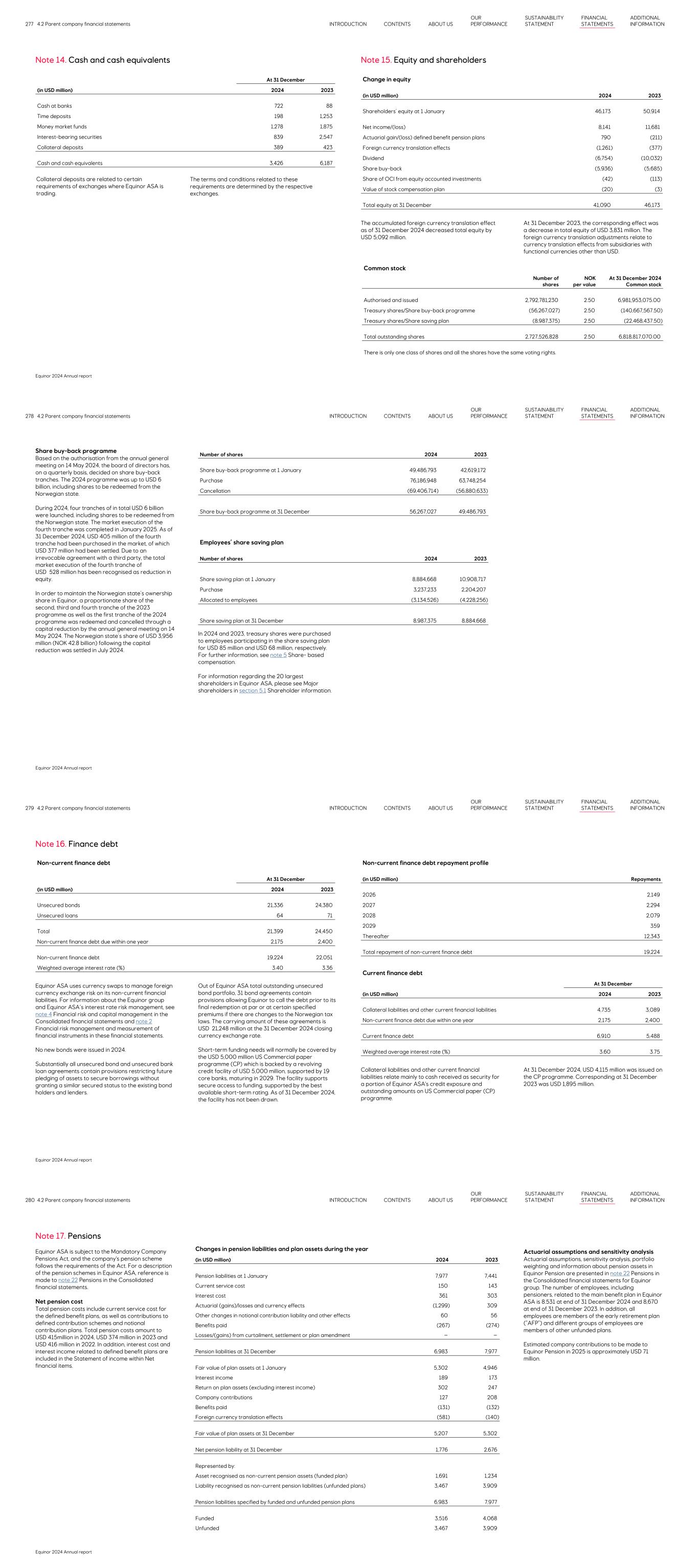 Note 14. Cash and cash equivalents Note 15. Equity and shareholders The accumulated foreign currency translation effect as of 31 December 2024 decreased total equity by USD 5,092 million. At 31 December 2023, the corresponding effect was a decrease in total equity of USD 3,831 million. The foreign currency translation adjustments relate to currency translation effects from subsidiaries with functional currencies other than USD. 277 INTRODUCTION CONTENTS ABOUT US OUR PERFORMANCE SUSTAINABILITY STATEMENT FINANCIAL STATEMENTS ADDITIONAL INFORMATION Equinor 2024 Annual report 4.2 Parent company financial statements At 31 December (in USD million) 2024 2023 Cash at banks 722 88 Time deposits 198 1,253 Money market funds 1,278 1,875 Interest-bearing securities 839 2,547 Collateral deposits 389 423 Cash and cash equivalents 3,426 6,187 Collateral deposits are related to certain requirements of exchanges where Equinor ASA is trading. Change in equity (in USD million) 2024 2023 Shareholders’ equity at 1 January 46,173 50,914 Net income/(loss) 8,141 11,681 Actuarial gain/(loss) defined benefit pension plans 790 (211) Foreign currency translation effects (1,261) (377) Dividend (6,754) (10,032) Share buy-back (5,936) (5,685) Share of OCI from equity accounted investments (42) (113) Value of stock compensation plan (20) (3) Total equity at 31 December 41,090 46,173 The terms and conditions related to these requirements are determined by the respective exchanges. Common stock Number of shares NOK per value At 31 December 2024 Common stock Authorised and issued 2,792,781,230 2.50 6,981,953,075.00 Treasury shares/Share buy-back programme (56,267,027) 2.50 (140,667,567.50) Treasury shares/Share saving plan (8,987,375) 2.50 (22,468,437.50) Total outstanding shares 2,727,526,828 2.50 6,818,817,070.00 There is only one class of shares and all the shares have the same voting rights. Share buy-back programme Based on the authorisation from the annual general meeting on 14 May 2024, the board of directors has, on a quarterly basis, decided on share buy-back tranches. The 2024 programme was up to USD 6 billion, including shares to be redeemed from the Norwegian state. During 2024, four tranches of in total USD 6 billion were launched, including shares to be redeemed from the Norwegian state. The market execution of the fourth tranche was completed in January 2025. As of 31 December 2024, USD 405 million of the fourth tranche had been purchased in the market, of which USD 377 million had been settled. Due to an irrevocable agreement with a third party, the total market execution of the fourth tranche of USD 528 million has been recognised as reduction in equity. In order to maintain the Norwegian state’s ownership share in Equinor, a proportionate share of the second, third and fourth tranche of the 2023 programme as well as the first tranche of the 2024 programme was redeemed and cancelled through a capital reduction by the annual general meeting on 14 May 2024. The Norwegian state’s share of USD 3,956 million (NOK 42.8 billion) following the capital reduction was settled in July 2024. In 2024 and 2023, treasury shares were purchased to employees participating in the share saving plan for USD 85 million and USD 68 million, respectively. For further information, see note 5 Share- based compensation. For information regarding the 20 largest shareholders in Equinor ASA, please see Major shareholders in section 5.1 Shareholder information. 278 INTRODUCTION CONTENTS ABOUT US OUR PERFORMANCE SUSTAINABILITY STATEMENT FINANCIAL STATEMENTS ADDITIONAL INFORMATION Equinor 2024 Annual report Number of shares 2024 2023 Share buy-back programme at 1 January 49,486,793 42,619,172 Purchase 76,186,948 63,748,254 Cancellation (69,406,714) (56,880,633) Share buy-back programme at 31 December 56,267,027 49,486,793 Employees’ share saving plan Number of shares 2024 2023 Share saving plan at 1 January 8,884,668 10,908,717 Purchase 3,237,233 2,204,207 Allocated to employees (3,134,526) (4,228,256) Share saving plan at 31 December 8,987,375 8,884,668 4.2 Parent company financial statements Note 16. Finance debt Equinor ASA uses currency swaps to manage foreign currency exchange risk on its non-current financial liabilities. For information about the Equinor group and Equinor ASA´s interest rate risk management, see note 4 Financial risk and capital management in the Consolidated financial statements and note 2 Financial risk management and measurement of financial instruments in these financial statements. No new bonds were issued in 2024. Substantially all unsecured bond and unsecured bank loan agreements contain provisions restricting future pledging of assets to secure borrowings without granting a similar secured status to the existing bond holders and lenders. Out of Equinor ASA total outstanding unsecured bond portfolio, 31 bond agreements contain provisions allowing Equinor to call the debt prior to its final redemption at par or at certain specified premiums if there are changes to the Norwegian tax laws. The carrying amount of these agreements is USD 21,248 million at the 31 December 2024 closing currency exchange rate. Short-term funding needs will normally be covered by the USD 5,000 million US Commercial paper programme (CP) which is backed by a revolving credit facility of USD 5,000 million, supported by 19 core banks, maturing in 2029. The facility supports secure access to funding, supported by the best available short-term rating. As of 31 December 2024, the facility has not been drawn. Collateral liabilities and other current financial liabilities relate mainly to cash received as security for a portion of Equinor ASA's credit exposure and outstanding amounts on US Commercial paper (CP) programme. At 31 December 2024, USD 4,115 million was issued on the CP programme. Corresponding at 31 December 2023 was USD 1,895 million. 279 INTRODUCTION CONTENTS ABOUT US OUR PERFORMANCE SUSTAINABILITY STATEMENT FINANCIAL S