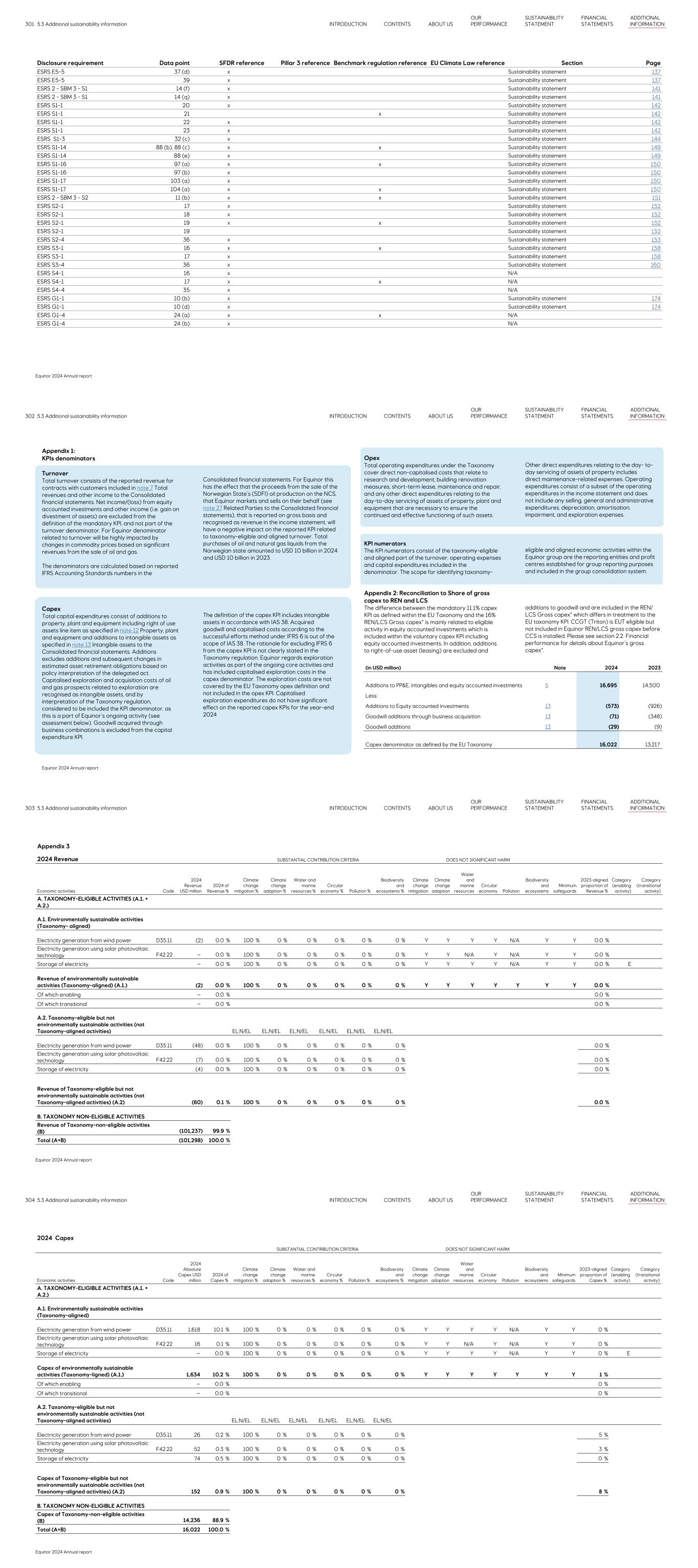 Disclosure requirement Data point SFDR reference Pillar 3 reference Benchmark regulation reference EU Climate Law reference Section Page ESRS E5-5 37 (d) x Sustainability statement 137 ESRS E5-5 39 x Sustainability statement 137 ESRS 2 - SBM 3 - S1 14 (f) x Sustainability statement 141 ESRS 2 - SBM 3 - S1 14 (q) x Sustainability statement 141 ESRS S1-1 20 x Sustainability statement 142 ESRS S1-1 21 x Sustainability statement 142 ESRS S1-1 22 x Sustainability statement 142 ESRS S1-1 23 x Sustainability statement 142 ESRS S1-3 32 (c) x Sustainability statement 144 ESRS S1-14 88 (b), 88 (c) x x Sustainability statement 149 ESRS S1-14 88 (e) x Sustainability statement 149 ESRS S1-16 97 (a) x x Sustainability statement 150 ESRS S1-16 97 (b) x Sustainability statement 150 ESRS S1-17 103 (a) x Sustainability statement 150 ESRS S1-17 104 (a) x x Sustainability statement 150 ESRS 2 - SBM 3 - S2 11 (b) x x Sustainability statement 151 ESRS S2-1 17 x Sustainability statement 152 ESRS S2-1 18 x Sustainability statement 152 ESRS S2-1 19 x x Sustainability statement 152 ESRS S2-1 19 Sustainability statement 152 ESRS S2-4 36 x Sustainability statement 153 ESRS S3-1 16 x x Sustainability statement 158 ESRS S3-1 17 x Sustainability statement 158 ESRS S3-4 36 x Sustainability statement 160 ESRS S4-1 16 x N/A ESRS S4-1 17 x x N/A ESRS S4-4 35 x N/A ESRS G1-1 10 (b) x Sustainability statement 174 ESRS G1-1 10 (d) x Sustainability statement 174 ESRS G1-4 24 (a) x x N/A ESRS G1-4 24 (b) x N/A 301 INTRODUCTION CONTENTS ABOUT US OUR PERFORMANCE SUSTAINABILITY STATEMENT FINANCIAL STATEMENTS ADDITIONAL INFORMATION Equinor 2024 Annual report 5.3 Additional sustainability information Appendix 1: KPIs denominators Turnover Total turnover consists of the reported revenue for contracts with customers included in note 7 Total revenues and other income to the Consolidated financial statements. Net income/(loss) from equity accounted investments and other income (i.e. gain on divestment of assets) are excluded from the definition of the mandatory KPI, and not part of the turnover denominator. For Equinor denominator related to turnover will be highly impacted by changes in commodity prices based on significant revenues from the sale of oil and gas. The denominators are calculated based on reported IFRS Accounting Standards numbers in the Capex Total capital expenditures consist of additions to property, plant and equipment including right of use assets line item as specified in note 12 Property, plant and equipment and additions to intangible assets as specified in note 13 Intangible assets to the Consolidated financial statements. Additions excludes additions and subsequent changes in estimated asset retirement obligations based on policy interpretation of the delegated act. Capitalised exploration and acquisition costs of oil and gas prospects related to exploration are recognised as intangible assets, and by interpretation of the Taxonomy regulation, considered to be included the KPI denominator, as this is a part of Equinor’s ongoing activity (see assessment below). Goodwill acquired through business combinations is excluded from the capital expenditure KPI. Consolidated financial statements. For Equinor this has the effect that the proceeds from the sale of the Norwegian State’s (SDFI) oil production on the NCS, that Equinor markets and sells on their behalf (see note 27 Related Parties to the Consolidated financial statements), that is reported on gross basis and recognised as revenue in the income statement, will have a negative impact on the reported KPI related to taxonomy-eligible and aligned turnover. Total purchases of oil and natural gas liquids from the Norwegian state amounted to USD 10 billion in 2024 and USD 10 billion in 2023. The definition of the capex KPI includes intangible assets in accordance with IAS 38. Acquired goodwill and capitalised costs according to the successful efforts method under IFRS 6 is out of the scope of IAS 38. The rationale for excluding IFRS 6 from the capex KPI is not clearly stated in the Taxonomy regulation. Equinor regards exploration activities as part of the ongoing core activities and has included capitalised exploration costs in the capex denominator. The exploration costs are not covered by the EU Taxonomy opex definition and not included in the opex KPI. Capitalised exploration expenditures do not have significant effect on the reported capex KPIs for the year-end 2024 Opex Total operating expenditures under the Taxonomy cover direct non-capitalised costs that relate to research and development, building renovation measures, short-term lease, maintenance and repair, and any other direct expenditures relating to the day-to-day servicing of assets of property, plant and equipment that are necessary to ensure the continued and effective functioning of such assets. KPI numerators The KPI numerators consist of the taxonomy-eligible and aligned part of the turnover, operating expenses and capital expenditures included in the denominator. The scope for identifying taxonomy- Appendix 2: Reconciliation to Share of gross capex to REN and LCS The difference between the mandatory 11.1% capex KPI as defined within the EU Taxonomy and the 16% REN/LCS Gross capex* is mainly related to eligible activity in equity accounted investments which is included within the voluntary capex KPI including equity accounted investments. In addition, additions to right-of-use asset (leasing) are excluded and Other direct expenditures relating to the day- to- day servicing of assets of property includes direct maintenance-related expenses. Operating expenditures consist of a subset of the operating expenditures in the income statement and does not include any selling, general and administrative expenditures, depreciation, amortisation, impairment, and exploration expenses. eligible and aligned economic activities within the Equinor group are the reporting entities and profit centres established 