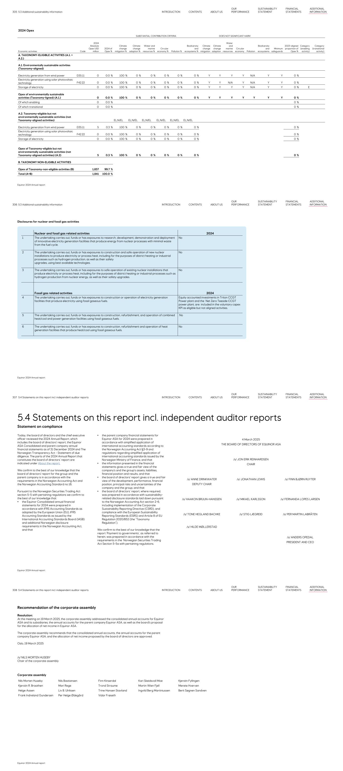 305 INTRODUCTION CONTENTS ABOUT US OUR PERFORMANCE SUSTAINABILITY STATEMENT FINANCIAL STATEMENTS ADDITIONAL INFORMATION Equinor 2024 Annual report 2024 Opex SUBSTANTIAL CONTRIBUTION CRITERIA DOES NOT SIGNIFICANT HARM Economic activities Code 2024 Absolute Opex USD million 2024 of Opex % Climate change mitigation % Climate change adaption % Water and marine resources % Circular economy % Pollution % Biodiversity and ecosystems % Climate change mitigation Climate change adaption Water and marine resources Circular economy Pollution Biodiversity and ecosystems Minimum safeguards 2023-aligned proportion of Opex % Category (enabling activity) Category (transitional activity) A. TAXONOMY-ELIGIBLE ACTIVITIES (A.1. + A.2.) A.1. Environmentally sustainable activities (Taxonomy-aligned) Electricity generation from wind power D35.11 0 0.0 % 100 % 0 % 0 % 0 % 0 % 0 % Y Y Y Y N/A Y Y 0 % Electricity generation using solar photovoltaic technology F42.22 0 0.0 % 100 % 0 % 0 % 0 % 0 % 0 % Y Y N/A Y N/A Y Y 0 % Storage of electricity 0 0.0 % 100 % 0 % 0 % 0 % 0 % 0 % Y Y Y Y N/A Y Y 0 % E Opex of environmentally sustainable activities (Taxonomy-ligned) (A.1.) 0 0.0 % 100 % 0 % 0 % 0 % 0 % 0 % Y Y Y Y Y Y Y 0 % Of which enabling 0 0.0 % 0 % Of which transitional 0 0.0 % 0 % A.2. Taxonomy-eligible but not environmentally sustainable activities (not Taxonomy-aligned activities) EL;N/EL EL;N/EL EL;N/EL EL;N/EL EL;N/EL EL;N/EL Electricity generation from wind power D35.11 5 0.3 % 100 % 0 % 0 % 0 % 0 % 0 % 0 % Electricity generation using solar photovoltaic technology F42.22 0 0.0 % 100 % 0 % 0 % 0 % 0 % 0 % 0 % Storage of electricity 0 0.0 % 100 % 0 % 0 % 0 % 0 % 0 % 0 % Opex of Taxonomy-eligible but not environmentally sustainable activities (not Taxonomy-aligned activities) (A.2) 5 0.3 % 100 % 0 % 0 % 0 % 0 % 0 % 0 % B. TAXONOMY NON-ELIGIBLE ACTIVITIES Opex of Taxonomy-non-eligible activities (B) 1,837 99.7 % Total (A+B) 1,841 100.0 % 5.3 Additional sustainability information Disclosures for nuclear and fossil gas activities 306 INTRODUCTION CONTENTS ABOUT US OUR PERFORMANCE SUSTAINABILITY STATEMENT FINANCIAL STATEMENTS ADDITIONAL INFORMATION Equinor 2024 Annual report Nuclear and fossil gas related activities 2024 1 The undertaking carries out, funds or has exposures to research, development, demonstration and deployment of innovative electricity generation facilities that produce energy from nuclear processes with minimal waste from the fuel cycle. No 2 The undertaking carries out, funds or has exposures to construction and safe operation of new nuclear installations to produce electricity or process heat, including for the purposes of district heating or industrial processes such as hydrogen production, as well as their safety upgrades, using best available technologies. No 3 The undertaking carries out, funds or has exposures to safe operation of existing nuclear installations that produce electricity or process heat, including for the purposes of district heating or industrial processes such as hydrogen production from nuclear energy, as well as their safety upgrades. No Fossil gas related activities 2024 4 The undertaking carries out, funds or has exposures to construction or operation of electricity generation facilities that produce electricity using fossil gaseous fuels. Equity accounted investments in Triton CCGT Power plant and the Net Zero Teeside CCGT power plant, are included in the voluntary capex KPI as eligible but not aligned activities. 5 The undertaking carries out, funds or has exposures to construction, refurbishment, and operation of combined heat/cool and power generation facilities using fossil gaseous fuels. No 6 The undertaking carries out, funds or has exposures to construction, refurbishment and operation of heat generation facilities that produce heat/cool using fossil gaseous fuels. No 5.3 Additional sustainability information 5.4 Statements on this report incl. independent auditor reports Statement on compliance Today, the board of directors and the chief executive officer reviewed the 2024 Annual Report, which includes the board of directors' report, the Equinor ASA Consolidated and parent company annual financial statements as of 31 December 2024 and The Norwegian Transparency Act - Statement of due diligence. The parts of the 2024 Annual Report that constitutes the board of directors’ report are indicated under About the report. We confirm to the best of our knowledge that the board of directors' report for the group and the parent company is in accordance with the requirements in the Norwegian Accounting Act and the Norwegian Accounting Standard no 16. Pursuant to the Norwegian Securities Trading Act section 5-5 with pertaining regulations we confirm to the best of our knowledge that: • the Equinor Consolidated annual financial statements for 2024 were prepared in accordance with IFRS Accounting Standards as adopted by the European Union (EU), IFRS Accounting Standards as issued by the International Accounting Standards Board (IASB) and additional Norwegian disclosure requirements in the Norwegian Accounting Act, and that • the parent company financial statements for Equinor ASA for 2024 were prepared in accordance with simplified application of international accounting standards according to the Norwegian Accounting Act §3-9 and regulations regarding simplified application of international accounting standards issued by the Norwegian Ministry of Finance, and that • the information presented in the financial statements gives a true and fair view of the company's and the group's assets, liabilities, financial position and results, and that • the board of directors' report gives a true and fair view of the development, performance, financial position, principal risks and uncertainties of the company and the group, and that • the board of directors’ report, where required, was prepared in accordance with sustainability- related disclosure standards laid down p