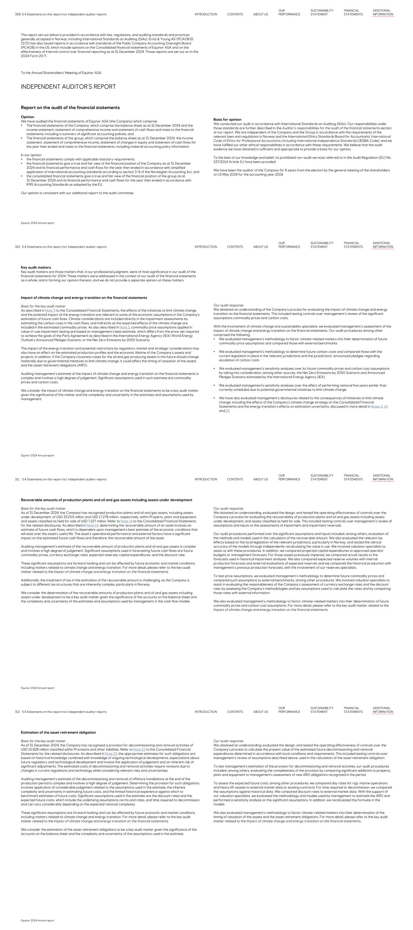 The report set out below is provided in accordance with law, regulations, and auditing standards and practices generally accepted in Norway, including International Standards on Auditing (ISAs). Ernst & Young AS (PCAOB ID: 1572) has also issued reports in accordance with standards of the Public Company Accounting Oversight Board (PCAOB) in the US, which include opinions on the Consolidated financial statements of Equinor ASA and on the effectiveness of internal control over financial reporting as at 31 December 2024. Those reports are set out on in the 2024 Form 20-F. To the Annual Shareholders' Meeting of Equinor ASA INDEPENDENT AUDITOR’S REPORT Report on the audit of the financial statements Opinion We have audited the financial statements of Equinor ASA (the Company) which comprise: • The financial statements of the Company, which comprise the balance sheet as at 31 December 2024 and the income statement, statement of comprehensive income and statement of cash flows and notes to the financial statements, including a summary of significant accounting policies, and • The financial statements of the group, which comprise the balance sheet as at 31 December 2024, the income statement, statement of comprehensive income, statement of changes in equity and statement of cash flows for the year then ended and notes to the financial statements, including material accounting policy information. In our opinion • the financial statements comply with applicable statutory requirements, • the financial statements give a true and fair view of the financial position of the Company as at 31 December 2024 and its financial performance and cash flows for the year then ended in accordance with simplified application of international accounting standards according to section 3-9 of the Norwegian Accounting Act, and • the consolidated financial statements give a true and fair view of the financial position of the group as at 31 December 2024 and its financial performance and cash flows for the year then ended in accordance with IFRS Accounting Standards as adopted by the EU. Our opinion is consistent with our additional report to the audit committee. Basis for opinion We conducted our audit in accordance with International Standards on Auditing (ISAs). Our responsibilities under those standards are further described in the Auditor’s responsibilities for the audit of the financial statements section of our report. We are independent of the Company and the Group in accordance with the requirements of the relevant laws and regulations in Norway and the International Ethics Standards Board for Accountants’ International Code of Ethics for Professional Accountants (including International Independence Standards) (IESBA Code), and we have fulfilled our other ethical responsibilities in accordance with these requirements. We believe that the audit evidence we have obtained is sufficient and appropriate to provide a basis for our opinion. To the best of our knowledge and belief, no prohibited non-audit services referred to in the Audit Regulation (EU) No 537/2014 Article 5.1 have been provided. We have been the auditor of the Company for 6 years from the election by the general meeting of the shareholders on 15 May 2019 for the accounting year 2019. 309 INTRODUCTION CONTENTS ABOUT US OUR PERFORMANCE SUSTAINABILITY STATEMENT FINANCIAL STATEMENTS ADDITIONAL INFORMATION Equinor 2024 Annual report 5.4 Statements on this report incl. independent auditor reports Key audit matters Key audit matters are those matters that, in our professional judgment, were of most significance in our audit of the financial statements for 2024. These matters were addressed in the context of our audit of the financial statements as a whole, and in forming our opinion thereon, and we do not provide a separate opinion on these matters. Impact of climate change and energy transition on the financial statements Basis for the key audit matter As described in Note 3 to the Consolidated Financial Statements, the effects of the initiatives to limit climate change and the potential impact of the energy transition are relevant to some of the economic assumptions in the Company’s estimation of future cash flows. Climate considerations are included directly in the impairment assessments by estimating the carbon costs in the cash flows, and indirectly as the expected effects of the climate change are included in the estimated commodity prices. As also described in Note 3, commodity price assumptions applied in value-in-use impairment testing are based on management’s best estimate, which differs from the price-set required to achieve the goals of the Paris Agreement as described in the International Energy Agency (IEA) World Energy Outlook’s Announced Pledges Scenario, or the Net Zero Emissions by 2050 Scenario. The impact of the energy transition and potential restrictions by regulators, market and strategic considerations may also have an effect on the estimated production profiles and the economic lifetime of the Company’s assets and projects. In addition, if the Company’s business cases for the oil and gas producing assets in the future should change materially due to governmental initiatives to limit climate change, it could affect the timing of cessation of the assets and the asset retirement obligations (ARO). Auditing management’s estimate of the impact of climate change and energy transition on the financial statements is complex and involves a high degree of judgement. Significant assumptions used in such estimate are commodity prices and carbon costs. We consider the impact of climate change and energy transition on the financial statements to be a key audit matter given the significance of this matter and the complexity and uncertainty in the estimates and assumptions used by management. Our audit response We obtained an understanding of the Company’s process for evaluating the impact of climate change and energy
