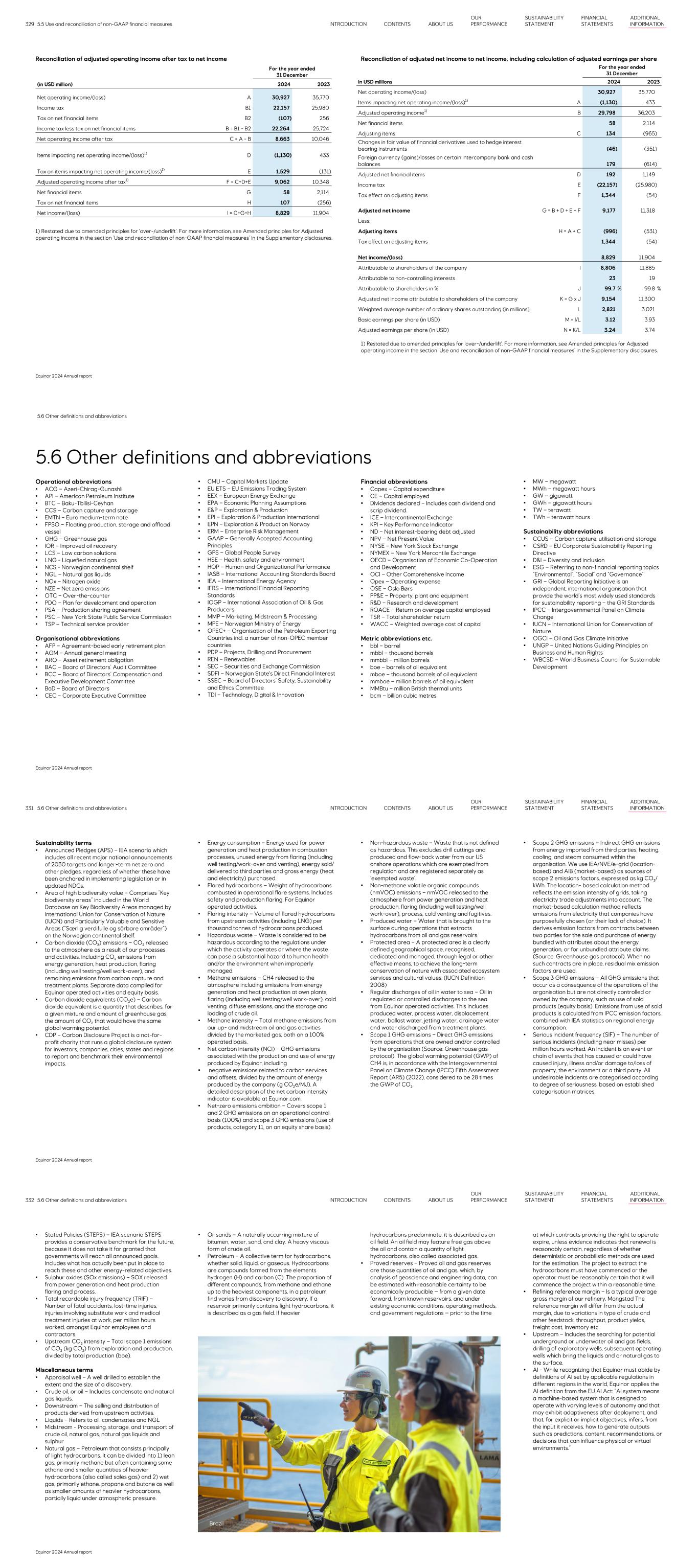 Reconciliation of adjusted operating income after tax to net income 1) Restated due to amended principles for 'over-/underlift'. For more information, see Amended principles for Adjusted operating income in the section ‘Use and reconciliation of non-GAAP financial measures’ in the Supplementary disclosures. Reconciliation of adjusted net income to net income, including calculation of adjusted earnings per share 1) Restated due to amended principles for 'over-/underlift'. For more information, see Amended principles for Adjusted operating income in the section ‘Use and reconciliation of non-GAAP financial measures’ in the Supplementary disclosures. 329 INTRODUCTION CONTENTS ABOUT US OUR PERFORMANCE SUSTAINABILITY STATEMENT FINANCIAL STATEMENTS ADDITIONAL INFORMATION Equinor 2024 Annual report For the year ended 31 December (in USD million) 2024 2023 Net operating income/(loss) A 30,927 35,770 Income tax B1 22,157 25,980 Tax on net financial items B2 (107) 256 Income tax less tax on net financial items B = B1 - B2 22,264 25,724 Net operating income after tax C = A - B 8,663 10,046 Items impacting net operating income/(loss)1) D (1,130) 433 Tax on items impacting net operating income/(loss)1) E 1,529 (131) Adjusted operating income after tax1) F = C+D+E 9,062 10,348 Net financial items G 58 2,114 Tax on net financial items H 107 (256) Net income/(loss) I = C+G+H 8,829 11,904 For the year ended 31 December in USD millions 2024 2023 Net operating income/(loss) 30,927 35,770 Items impacting net operating income/(loss)1) A (1,130) 433 Adjusted operating income1) B 29,798 36,203 Net financial items 58 2,114 Adjusting items C 134 (965) Changes in fair value of financial derivatives used to hedge interest bearing instruments (46) (351) Foreign currency (gains)/losses on certain intercompany bank and cash balances 179 (614) Adjusted net financial items D 192 1,149 Income tax E (22,157) (25,980) Tax effect on adjusting items F 1,344 (54) Adjusted net income G = B + D + E + F 9,177 11,318 Less: Adjusting items H = A + C (996) (531) Tax effect on adjusting items 1,344 (54) Net income/(loss) 8,829 11,904 Attributable to shareholders of the company I 8,806 11,885 Attributable to non-controlling interests 23 19 Attributable to shareholders in % J 99.7 % 99.8 % Adjusted net income attributable to shareholders of the company K = G x J 9,154 11,300 Weighted average number of ordinary shares outstanding (in millions) L 2,821 3,021 Basic earnings per share (in USD) M = I/L 3.12 3.93 Adjusted earnings per share (in USD) N = K/L 3.24 3.74 5.5 Use and reconciliation of non-GAAP financial measures 5.6 Other definitions and abbreviations Operational abbreviations • ACG – Azeri-Chirag-Gunashli • API – American Petroleum Institute • BTC – Baku-Tbilisi-Ceyhan • CCS – Carbon capture and storage • EMTN – Euro medium-term note • FPSO – Floating production, storage and offload vessel • GHG – Greenhouse gas • IOR – Improved oil recovery • LCS – Low carbon solutions • LNG - Liquefied natural gas • NCS - Norwegian continental shelf • NGL – Natural gas liquids • NOx – Nitrogen oxide • NZE – Net zero emissions • OTC – Over-the-counter • PDO – Plan for development and operation • PSA – Production sharing agreement • PSC – New York State Public Service Commission • TSP – Technical service provider Organisational abbreviations • AFP – Agreement-based early retirement plan • AGM – Annual general meeting • ARO – Asset retirement obligation • BAC – Board of Directors’ Audit Committee • BCC – Board of Directors’ Compensation and Executive Development Committee • BoD – Board of Directors • CEC – Corporate Executive Committee • CMU – Capital Markets Update • EU ETS – EU Emissions Trading System • EEX – European Energy Exchange • EPA – Economic Planning Assumptions • E&P – Exploration & Production • EPI – Exploration & Production International • EPN – Exploration & Production Norway • ERM – Enterprise Risk Management • GAAP – Generally Accepted Accounting Principles • GPS – Global People Survey • HSE – Health, safety and environment • HOP – Human and Organizational Performance • IASB – International Accounting Standards Board • IEA – International Energy Agency • IFRS – International Financial Reporting Standards • IOGP – International Association of Oil & Gas Producers • MMP – Marketing, Midstream & Processing • MPE – Norwegian Ministry of Energy • OPEC+ – Organisation of the Petroleum Exporting Countries incl. a number of non-OPEC member countries • PDP – Projects, Drilling and Procurement • REN – Renewables • SEC – Securities and Exchange Commission • SDFI – Norwegian State's Direct Financial Interest • SSEC – Board of Directors’ Safety, Sustainability and Ethics Committee • TDI – Technology, Digital & Innovation Financial abbreviations • Capex – Capital expenditure • CE – Capital employed • Dividends declared – Includes cash dividend and scrip dividend. • ICE – Intercontinental Exchange • KPI – Key Performance Indicator • ND – Net interest-bearing debt adjusted • NPV – Net Present Value • NYSE – New York Stock Exchange • NYMEX – New York Mercantile Exchange • OECD – Organisation of Economic Co-Operation and Development • OCI – Other Comprehensive Income • Opex – Operating expense • OSE – Oslo Børs • PP&E – Property, plant and equipment • R&D – Research and development • ROACE – Return on average capital employed • TSR – Total shareholder return • WACC – Weighted average cost of capital Metric abbreviations etc. • bbl – barrel • mbbl – thousand barrels • mmbbl – million barrels • boe – barrels of oil equivalent • mboe – thousand barrels of oil equivalent • mmboe – million barrels of oil equivalent • MMBtu – million British 