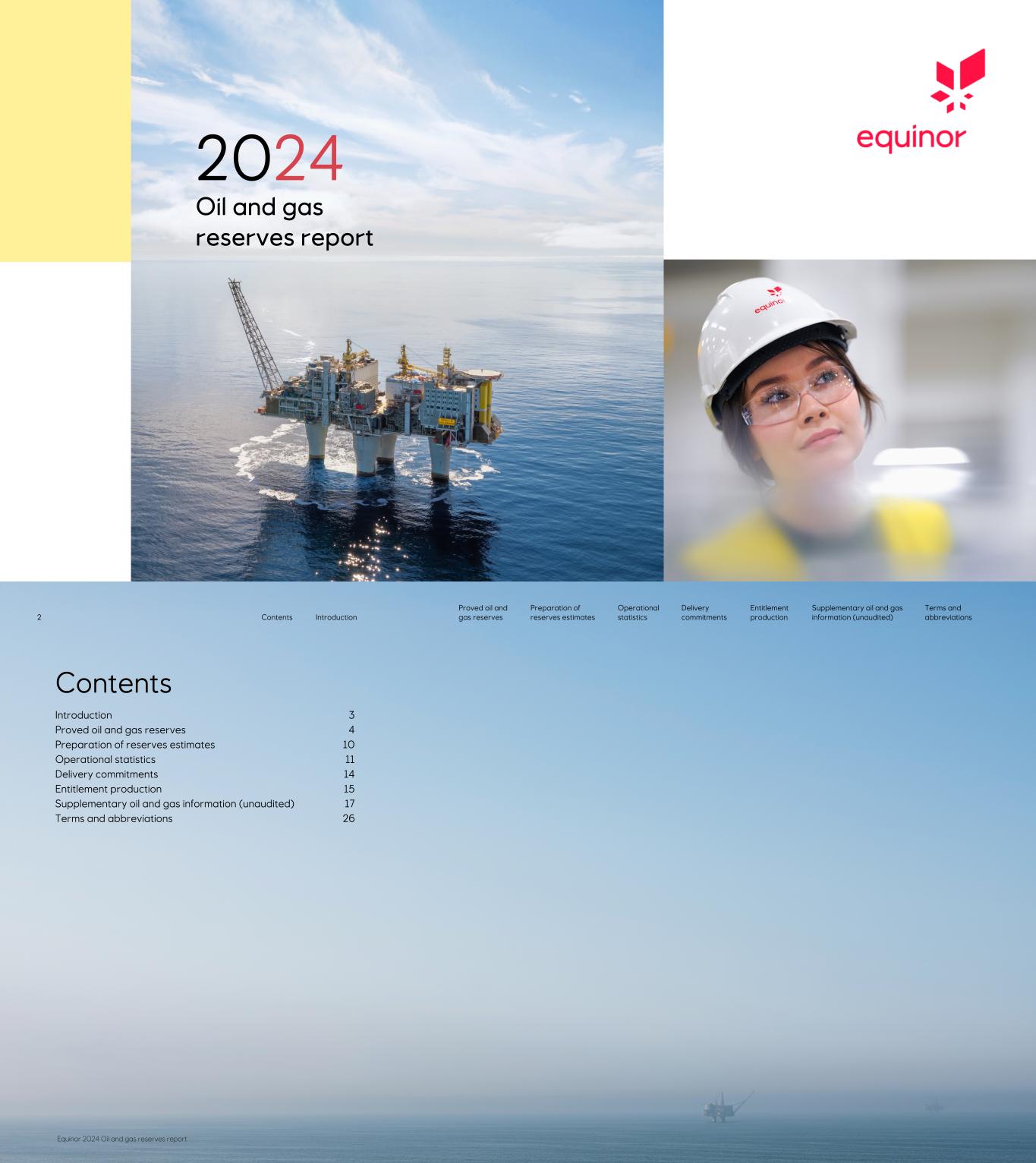 2024 Oil and gas reserves report Contents Introduction 3 Proved oil and gas reserves 4 Preparation of reserves estimates 10 Operational statistics 11 Delivery commitments 14 Entitlement production 15 Supplementary oil and gas information (unaudited) 17 Terms and abbreviations 26 2 Contents Introduction Proved oil and gas reserves Preparation of reserves estimates Operational statistics Delivery commitments Entitlement production Supplementary oil and gas information (unaudited) Terms and abbreviations Equinor 2024 Oil and gas reserves report