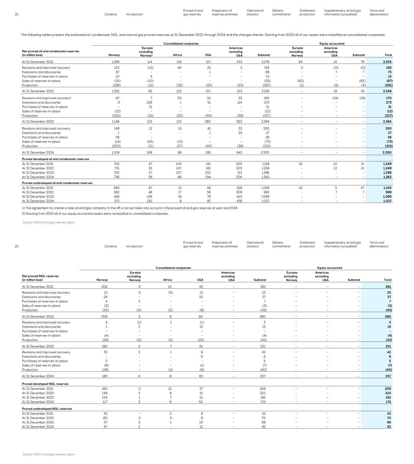 The following tables present the estimated oil, condensate, NGL and natural gas proved reserves at 31 December 2021 through 2024 and the changes therein. Starting from 2023 all of our assets were classified as consolidated companies. 19 Contents Introduction Proved oil and gas reserves Preparation of reserves estimates Operational statistics Delivery commitments Entitlement production Supplementary oil and gas information (unaudited) Terms and abbreviations Equinor 2024 Oil and gas reserves report Consolidated companies Equity accounted Net proved oil and condensate reserves (in million boe) Norway Eurasia excluding Norway¹ Africa USA Americas excluding USA Subtotal Eurasia excluding Norway Americas excluding USA Subtotal Total At 31 December 2021 1,296 114 116 217 533 2,276 64 15 79 2,355 Revisions and improved recovery 133 (15) 40 32 3 192 0 (0) (0) 192 Extensions and discoveries 67 - - 1 - 68 - 7 7 75 Purchases of reserves-in-place 10 5 - - - 15 - - - 15 Sales of reserves-in-place (25) (10) - - - (35) (62) - (62) (97) Production (188) (11) (32) (33) (23) (287) (1) (3) (4) (291) At 31 December 2022 1,292 83 123 217 513 2,228 - 19 19 2,248 Revisions and improved recovery² 67 7 30 52 33 190 - (19) (19) 170 Extensions and discoveries 0 106 1 51 114 273 - - - 273 Purchases of reserves-in-place - 31 - - - 31 - - - 31 Sales of reserves-in-place (12) - - - - (12) - - - (12) Production (202) (15) (32) (40) (39) (327) - - - (327) At 31 December 2023 1,146 213 123 280 622 2,384 - - - 2,384 Revisions and improved recovery 149 12 15 41 33 250 - - - 250 Extensions and discoveries 1 - - 1 25 27 - - - 27 Purchases of reserves-in-place 26 - - - - 26 - - - 26 Sales of reserves-in-place (14) (45) (13) - - (73) - - - (73) Production (200) (11) (27) (40) (38) (315) - - - (315) At 31 December 2024 1,109 169 98 281 643 2,300 - - - 2,300 Proved developed oil and condensate reserves At 31 December 2021 702 47 104 161 205 1,218 22 10 31 1,249 At 31 December 2022 731 35 107 161 203 1,236 - 12 12 1,249 At 31 December 2023 720 57 107 201 211 1,296 - - - 1,296 At 31 December 2024 736 39 89 194 204 1,262 - - - 1,262 Proved undeveloped oil and condensate reserves At 31 December 2021 594 67 13 56 328 1,058 42 5 47 1,105 At 31 December 2022 562 48 17 56 309 992 - 7 7 999 At 31 December 2023 426 156 16 79 410 1,089 - - - 1,089 At 31 December 2024 373 130 9 87 438 1,037 - - - 1,037 1) The agreement to create a new oil and gas company in the UK is not yet taken into account in the proved oil and gas reserves at year end 2024. 2) Starting from 2023 all of our equity accounted assets were reclassified to consolidated companies. Consolidated companies Equity accounted Net proved NGL reserves (in million boe) Norway Eurasia excluding Norway Africa USA Americas excluding USA Subtotal Eurasia excluding Norway Americas excluding USA Subtotal Total At 31 December 2021 202 0 14 45 - 261 - - - 261 Revisions and improved recovery 13 0 (3) 13 - 23 - - - 23 Extensions and discoveries 26 - - 10 - 37 - - - 37 Purchases of reserves-in-place 4 3 - - - 7 - - - 7 Sales of reserves-in-place (3) - - - - (3) - - - (3) Production (34) (0) (2) (8) - (45) - - - (45) At 31 December 2022 209 3 8 60 - 280 - - - 280 Revisions and improved recovery 4 (1) 1 (1) - 3 - - - 3 Extensions and discoveries 1 2 - 12 - 15 - - - 15 Purchases of reserves-in-place - - - - - - - - - - Sales of reserves-in-place (4) - - - - (4) - - - (4) Production (29) (0) (2) (10) - (42) - - - (42) At 31 December 2023 180 3 7 61 - 251 - - - 251 Revisions and improved recovery 33 2 1 6 - 42 - - - 42 Extensions and discoveries - - - 6 - 6 - - - 6 Purchases of reserves-in-place 5 - - - - 5 - - - 5 Sales of reserves-in-place (6) - - (1) - (7) - - - (7) Production (28) - (2) (9) - (40) - - - (40) At 31 December 2024 185 4 6 62 - 257 - - - 257 Proved developed NGL reserves At 31 December 2021 160 0 12 37 - 209 - - - 209 At 31 December 2022 149 3 8 51 - 210 - - - 210 At 31 December 2023 124 1 7 51 - 182 - - - 182 At 31 December 2024 117 2 6 50 - 175 - - - 175 Proved undeveloped NGL reserves At 31 December 2021 42 - 2 8 - 52 - - - 52 At 31 December 2022 60 0 0 9 - 70 - - - 70 At 31 December 2023 57 2 1 10 - 69 - - - 69 At 31 December 2024 67 2 - 12 - 82 - - - 82 20 Contents Introduction Proved oil and gas reserves Preparation of reserves estimates Operational statistics Delivery commitments Entitlement production Supplementary oil and gas information (unaudited) Terms and abbreviations Equinor 2024 Oil and gas reserves report