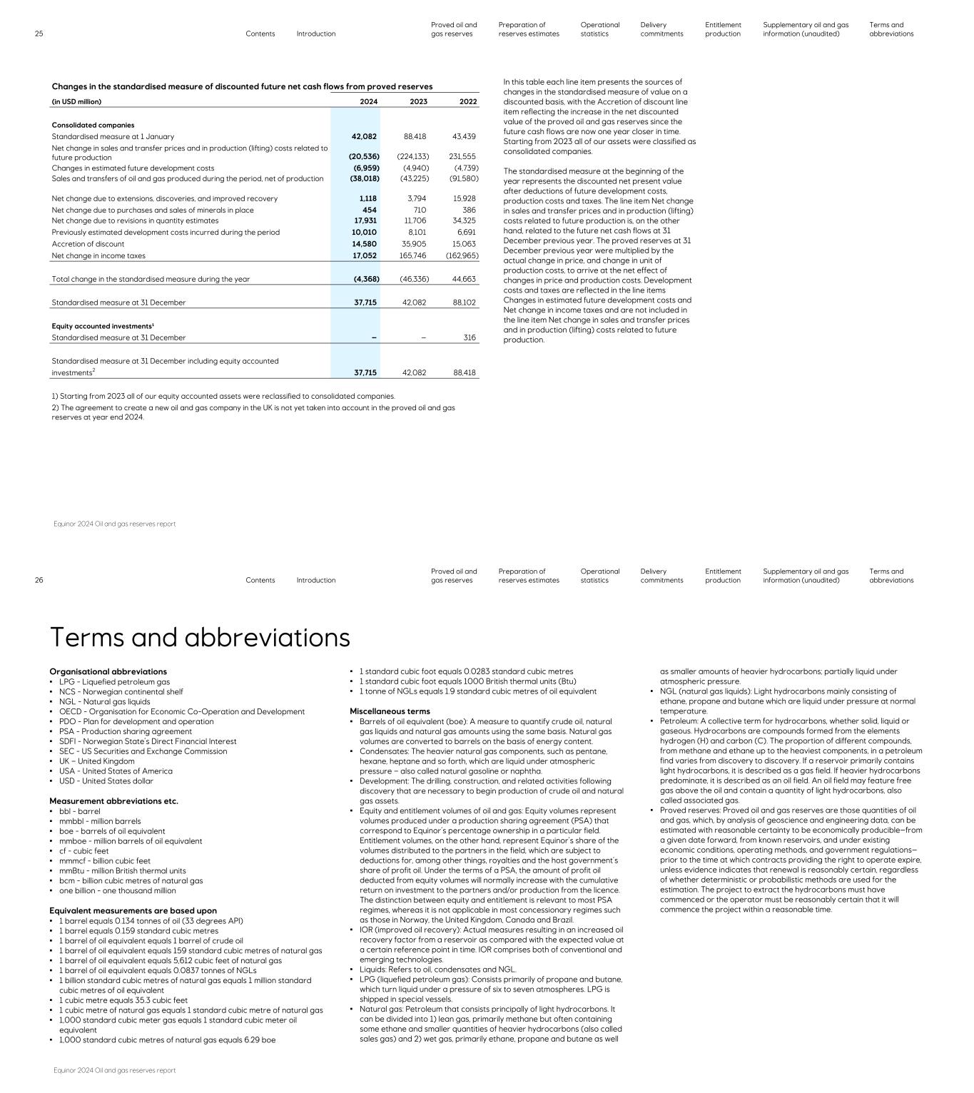Changes in the standardised measure of discounted future net cash flows from proved reserves (in USD million) 2024 2023 2022 Consolidated companies Standardised measure at 1 January 42,082 88,418 43,439 Net change in sales and transfer prices and in production (lifting) costs related to future production (20,536) (224,133) 231,555 Changes in estimated future development costs (6,959) (4,940) (4,739) Sales and transfers of oil and gas produced during the period, net of production (38,018) (43,225) (91,580) Net change due to extensions, discoveries, and improved recovery 1,118 3,794 15,928 Net change due to purchases and sales of minerals in place 454 710 386 Net change due to revisions in quantity estimates 17,931 11,706 34,325 Previously estimated development costs incurred during the period 10,010 8,101 6,691 Accretion of discount 14,580 35,905 15,063 Net change in income taxes 17,052 165,746 (162,965) Total change in the standardised measure during the year (4,368) (46,336) 44,663 Standardised measure at 31 December 37,715 42,082 88,102 Equity accounted investments¹ Standardised measure at 31 December — — 316 Standardised measure at 31 December including equity accounted investments2 37,715 42,082 88,418 1) Starting from 2023 all of our equity accounted assets were reclassified to consolidated companies. 2) The agreement to create a new oil and gas company in the UK is not yet taken into account in the proved oil and gas reserves at year end 2024. In this table each line item presents the sources of changes in the standardised measure of value on a discounted basis, with the Accretion of discount line item reflecting the increase in the net discounted value of the proved oil and gas reserves since the future cash flows are now one year closer in time. Starting from 2023 all of our assets were classified as consolidated companies. The standardised measure at the beginning of the year represents the discounted net present value after deductions of future development costs, production costs and taxes. The line item Net change in sales and transfer prices and in production (lifting) costs related to future production is, on the other hand, related to the future net cash flows at 31 December previous year. The proved reserves at 31 December previous year were multiplied by the actual change in price, and change in unit of production costs, to arrive at the net effect of changes in price and production costs. Development costs and taxes are reflected in the line items Changes in estimated future development costs and Net change in income taxes and are not included in the line item Net change in sales and transfer prices and in production (lifting) costs related to future production. 25 Contents Introduction Proved oil and gas reserves Preparation of reserves estimates Operational statistics Delivery commitments Entitlement production Supplementary oil and gas information (unaudited) Terms and abbreviations Equinor 2024 Oil and gas reserves report Terms and abbreviations Organisational abbreviations • LPG - Liquefied petroleum gas • NCS - Norwegian continental shelf • NGL - Natural gas liquids • OECD - Organisation for Economic Co-Operation and Development • PDO - Plan for development and operation • PSA - Production sharing agreement • SDFI - Norwegian State’s Direct Financial Interest • SEC - US Securities and Exchange Commission • UK – United Kingdom • USA - United States of America • USD - United States dollar Measurement abbreviations etc. • bbl - barrel • mmbbl - million barrels • boe - barrels of oil equivalent • mmboe - million barrels of oil equivalent • cf - cubic feet • mmmcf - billion cubic feet • mmBtu - million British thermal units • bcm - billion cubic metres of natural gas • one billion - one thousand million Equivalent measurements are based upon • 1 barrel equals 0.134 tonnes of oil (33 degrees API) • 1 barrel equals 0.159 standard cubic metres • 1 barrel of oil equivalent equals 1 barrel of crude oil • 1 barrel of oil equivalent equals 159 standard cubic metres of natural gas • 1 barrel of oil equivalent equals 5,612 cubic feet of natural gas • 1 barrel of oil equivalent equals 0.0837 tonnes of NGLs • 1 billion standard cubic metres of natural gas equals 1 million standard cubic metres of oil equivalent • 1 cubic metre equals 35.3 cubic feet • 1 cubic metre of natural gas equals 1 standard cubic metre of natural gas • 1,000 standard cubic meter gas equals 1 standard cubic meter oil equivalent • 1,000 standard cubic metres of natural gas equals 6.29 boe • 1 standard cubic foot equals 0.0283 standard cubic metres • 1 standard cubic foot equals 1000 British thermal units (Btu) • 1 tonne of NGLs equals 1.9 standard cubic metres of oil equivalent Miscellaneous terms • Barrels of oil equivalent (boe): A measure to quantify crude oil, natural gas liquids and natural gas amounts using the same basis. Natural gas volumes are converted to barrels on the basis of energy content. • Condensates: The heavier natural gas components, such as pentane, hexane, heptane and so forth, which are liquid under atmospheric pressure – also called natural gasoline or naphtha. • Development: The drilling, construction, and related activities following discovery that are necessary to begin production of crude oil and natural gas assets. • Equity and entitlement volumes of oil and gas: Equity volumes represent volumes produced under a production sharing agreement (PSA) that correspond to Equinor’s percentage ownership in a particular field. Entitlement volumes, on the other hand, represent Equinor’s share of the volumes distributed to the partners in the field, which are subject to deductions for, among other things, royalties and the host government’s share of profit oil. Under the terms of a PSA, the amount of profit oil deducted from equity volumes will normally increase with the cumulative return on investm