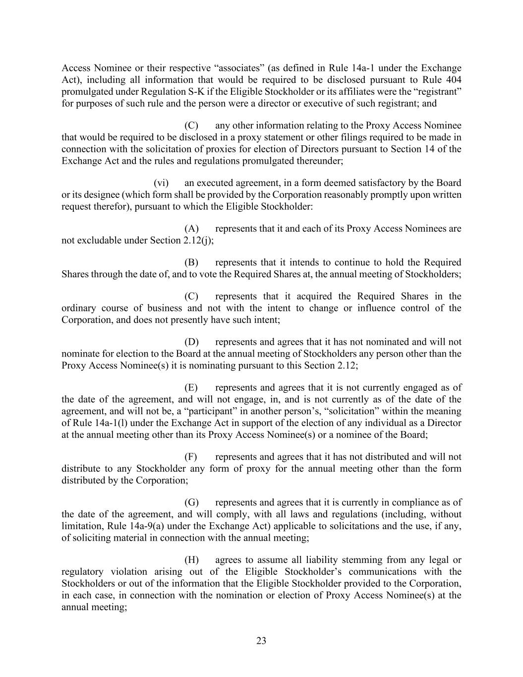23 Access Nominee or their respective “associates” (as defined in Rule 14a-1 under the Exchange Act), including all information that would be required to be disclosed pursuant to Rule 404 promulgated under Regulation S-K if the Eligible Stockholder or its affiliates were the “registrant” for purposes of such rule and the person were a director or executive of such registrant; and (C) any other information relating to the Proxy Access Nominee that would be required to be disclosed in a proxy statement or other filings required to be made in connection with the solicitation of proxies for election of Directors pursuant to Section 14 of the Exchange Act and the rules and regulations promulgated thereunder; (vi) an executed agreement, in a form deemed satisfactory by the Board or its designee (which form shall be provided by the Corporation reasonably promptly upon written request therefor), pursuant to which the Eligible Stockholder: (A) represents that it and each of its Proxy Access Nominees are not excludable under Section 2.12(j); (B) represents that it intends to continue to hold the Required Shares through the date of, and to vote the Required Shares at, the annual meeting of Stockholders; (C) represents that it acquired the Required Shares in the ordinary course of business and not with the intent to change or influence control of the Corporation, and does not presently have such intent; (D) represents and agrees that it has not nominated and will not nominate for election to the Board at the annual meeting of Stockholders any person other than the Proxy Access Nominee(s) it is nominating pursuant to this Section 2.12; (E) represents and agrees that it is not currently engaged as of the date of the agreement, and will not engage, in, and is not currently as of the date of the agreement, and will not be, a “participant” in another person’s, “solicitation” within the meaning of Rule 14a-1(l) under the Exchange Act in support of the election of any individual as a Director at the annual meeting other than its Proxy Access Nominee(s) or a nominee of the Board; (F) represents and agrees that it has not distributed and will not distribute to any Stockholder any form of proxy for the annual meeting other than the form distributed by the Corporation; (G) represents and agrees that it is currently in compliance as of the date of the agreement, and will comply, with all laws and regulations (including, without limitation, Rule 14a-9(a) under the Exchange Act) applicable to solicitations and the use, if any, of soliciting material in connection with the annual meeting; (H) agrees to assume all liability stemming from any legal or regulatory violation arising out of the Eligible Stockholder’s communications with the Stockholders or out of the information that the Eligible Stockholder provided to the Corporation, in each case, in connection with the nomination or election of Proxy Access Nominee(s) at the annual meeting;