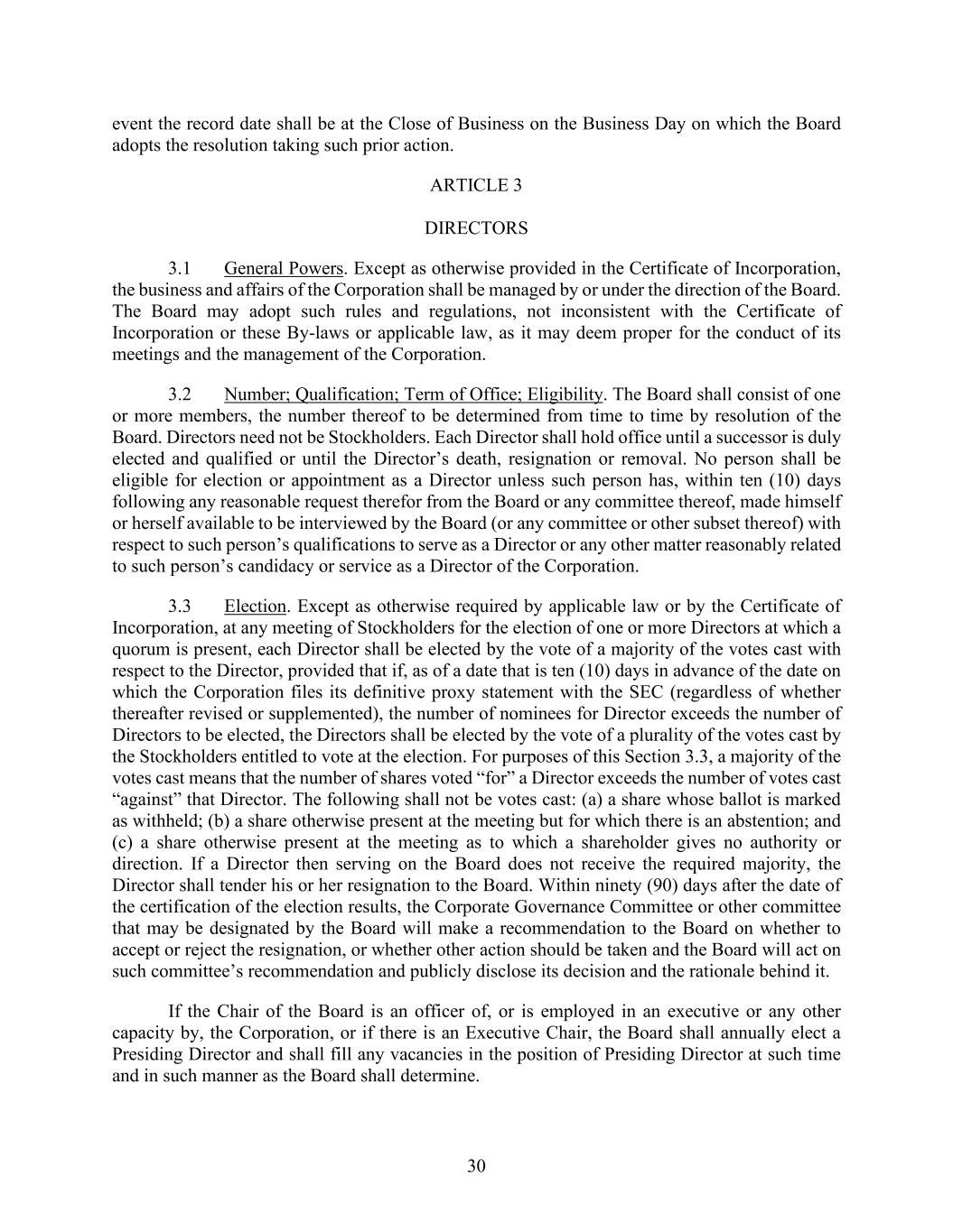 30 event the record date shall be at the Close of Business on the Business Day on which the Board adopts the resolution taking such prior action. ARTICLE 3 DIRECTORS 3.1 General Powers. Except as otherwise provided in the Certificate of Incorporation, the business and affairs of the Corporation shall be managed by or under the direction of the Board. The Board may adopt such rules and regulations, not inconsistent with the Certificate of Incorporation or these By-laws or applicable law, as it may deem proper for the conduct of its meetings and the management of the Corporation. 3.2 Number; Qualification; Term of Office; Eligibility. The Board shall consist of one or more members, the number thereof to be determined from time to time by resolution of the Board. Directors need not be Stockholders. Each Director shall hold office until a successor is duly elected and qualified or until the Director’s death, resignation or removal. No person shall be eligible for election or appointment as a Director unless such person has, within ten (10) days following any reasonable request therefor from the Board or any committee thereof, made himself or herself available to be interviewed by the Board (or any committee or other subset thereof) with respect to such person’s qualifications to serve as a Director or any other matter reasonably related to such person’s candidacy or service as a Director of the Corporation. 3.3 Election. Except as otherwise required by applicable law or by the Certificate of Incorporation, at any meeting of Stockholders for the election of one or more Directors at which a quorum is present, each Director shall be elected by the vote of a majority of the votes cast with respect to the Director, provided that if, as of a date that is ten (10) days in advance of the date on which the Corporation files its definitive proxy statement with the SEC (regardless of whether thereafter revised or supplemented), the number of nominees for Director exceeds the number of Directors to be elected, the Directors shall be elected by the vote of a plurality of the votes cast by the Stockholders entitled to vote at the election. For purposes of this Section 3.3, a majority of the votes cast means that the number of shares voted “for” a Director exceeds the number of votes cast “against” that Director. The following shall not be votes cast: (a) a share whose ballot is marked as withheld; (b) a share otherwise present at the meeting but for which there is an abstention; and (c) a share otherwise present at the meeting as to which a shareholder gives no authority or direction. If a Director then serving on the Board does not receive the required majority, the Director shall tender his or her resignation to the Board. Within ninety (90) days after the date of the certification of the election results, the Corporate Governance Committee or other committee that may be designated by the Board will make a recommendation to the Board on whether to accept or reject the resignation, or whether other action should be taken and the Board will act on such committee’s recommendation and publicly disclose its decision and the rationale behind it. If the Chair of the Board is an officer of, or is employed in an executive or any other capacity by, the Corporation, or if there is an Executive Chair, the Board shall annually elect a Presiding Director and shall fill any vacancies in the position of Presiding Director at such time and in such manner as the Board shall determine.