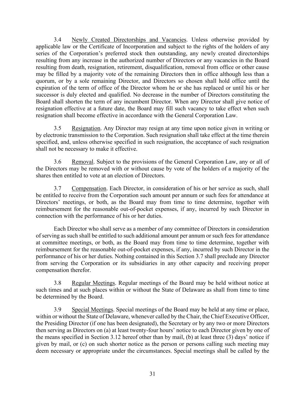31 3.4 Newly Created Directorships and Vacancies. Unless otherwise provided by applicable law or the Certificate of Incorporation and subject to the rights of the holders of any series of the Corporation’s preferred stock then outstanding, any newly created directorships resulting from any increase in the authorized number of Directors or any vacancies in the Board resulting from death, resignation, retirement, disqualification, removal from office or other cause may be filled by a majority vote of the remaining Directors then in office although less than a quorum, or by a sole remaining Director, and Directors so chosen shall hold office until the expiration of the term of office of the Director whom he or she has replaced or until his or her successor is duly elected and qualified. No decrease in the number of Directors constituting the Board shall shorten the term of any incumbent Director. When any Director shall give notice of resignation effective at a future date, the Board may fill such vacancy to take effect when such resignation shall become effective in accordance with the General Corporation Law. 3.5 Resignation. Any Director may resign at any time upon notice given in writing or by electronic transmission to the Corporation. Such resignation shall take effect at the time therein specified, and, unless otherwise specified in such resignation, the acceptance of such resignation shall not be necessary to make it effective. 3.6 Removal. Subject to the provisions of the General Corporation Law, any or all of the Directors may be removed with or without cause by vote of the holders of a majority of the shares then entitled to vote at an election of Directors. 3.7 Compensation. Each Director, in consideration of his or her service as such, shall be entitled to receive from the Corporation such amount per annum or such fees for attendance at Directors’ meetings, or both, as the Board may from time to time determine, together with reimbursement for the reasonable out-of-pocket expenses, if any, incurred by such Director in connection with the performance of his or her duties. Each Director who shall serve as a member of any committee of Directors in consideration of serving as such shall be entitled to such additional amount per annum or such fees for attendance at committee meetings, or both, as the Board may from time to time determine, together with reimbursement for the reasonable out-of-pocket expenses, if any, incurred by such Director in the performance of his or her duties. Nothing contained in this Section 3.7 shall preclude any Director from serving the Corporation or its subsidiaries in any other capacity and receiving proper compensation therefor. 3.8 Regular Meetings. Regular meetings of the Board may be held without notice at such times and at such places within or without the State of Delaware as shall from time to time be determined by the Board. 3.9 Special Meetings. Special meetings of the Board may be held at any time or place, within or without the State of Delaware, whenever called by the Chair, the Chief Executive Officer, the Presiding Director (if one has been designated), the Secretary or by any two or more Directors then serving as Directors on (a) at least twenty-four hours’ notice to each Director given by one of the means specified in Section 3.12 hereof other than by mail, (b) at least three (3) days’ notice if given by mail, or (c) on such shorter notice as the person or persons calling such meeting may deem necessary or appropriate under the circumstances. Special meetings shall be called by the