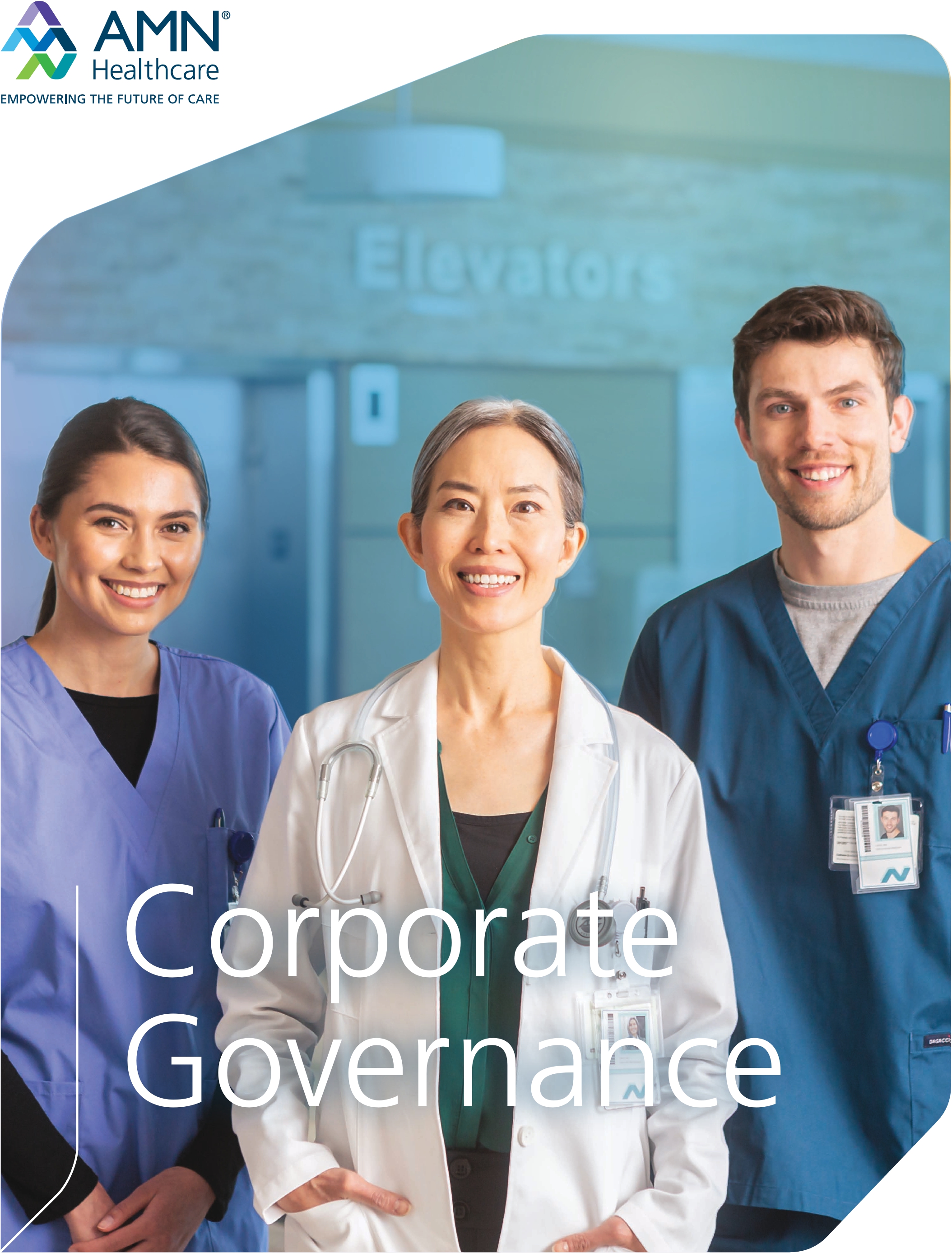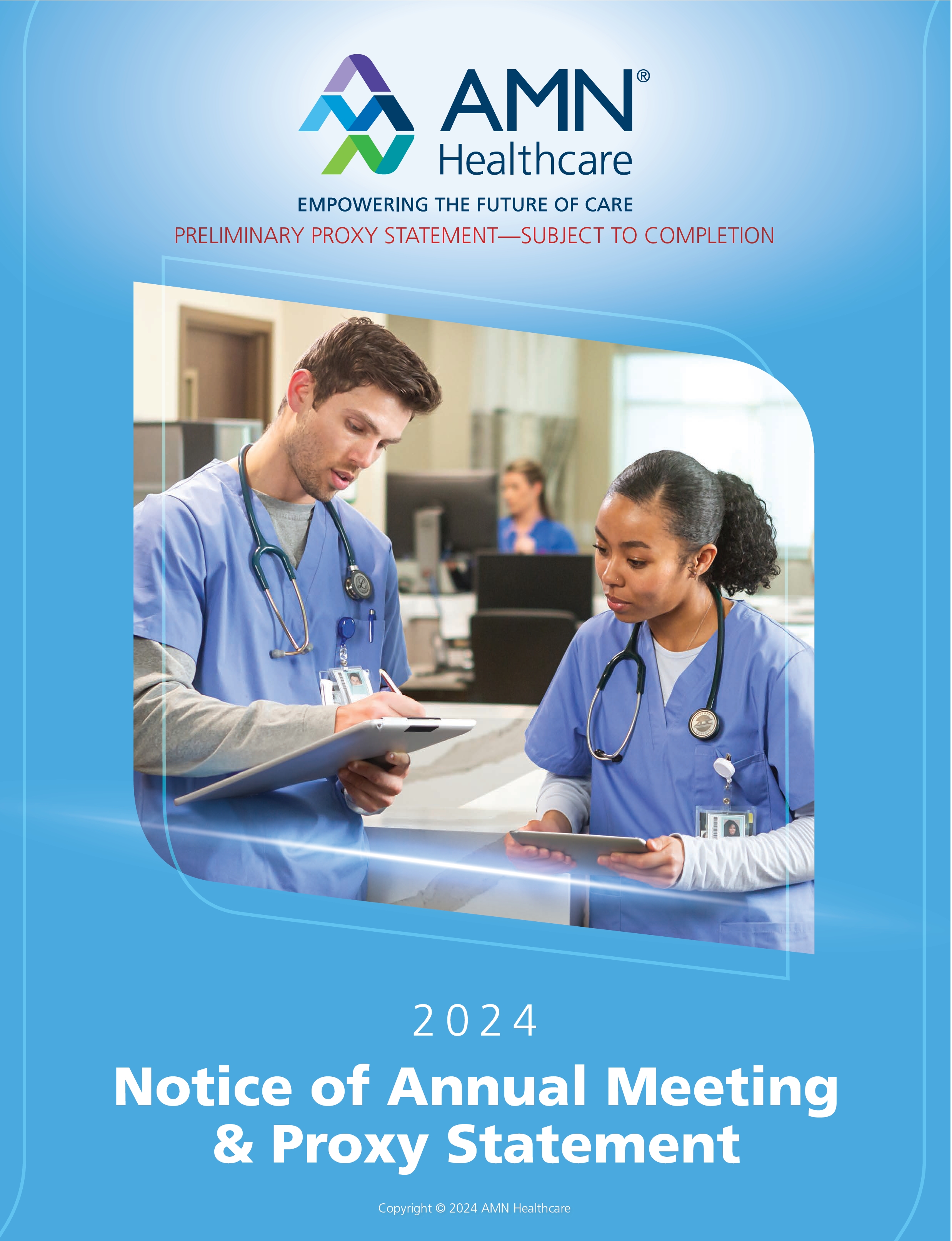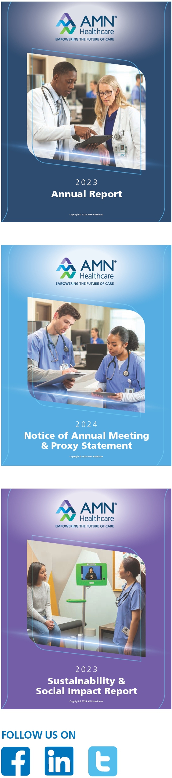 AMN Healthcare is the leader and innovator in total talent solutions for healthcare organizations across the nation. The Company provides access to the most comprehensive network of quality healthcare professionals through its innovative recruitment strategies and breadth of career opportunities. With insights and expertise, AMN Healthcare helps providers optimize their workforce to successfully reduce complexity, increase efficiency and improve patient outcomes. AMN total talent solutions include managed services programs, clinical and interim healthcare leaders, temporary staffing, executive search solutions, vendor management systems, recruitment process outsourcing, predictive modeling, language interpretation services, revenue cycle solutions, credentialing and other services. Clients include acute-care hospitals, community health centers and clinics, physician practice groups, retail and urgent care centers, home health facilities, schools and many other healthcare settings. AMN Healthcare is committed to fostering and maintaining a diverse team that reflects the communities we serve. Our commitment to the inclusion of many different backgrounds, experiences and perspectives enables our innovation and leadership in the healthcare services industry. For more information about AMN Healthcare, visit www.amnhealthcare.com. FORWARD-LOOKING STATEMENTS This Proxy includes estimates, projections, statements related to our business plans, objectives, initiatives, strategies, practices, and expected operating Statement results that may constitute “forward-looking statements” within the meaning of Section 27A of the Securities Act of 1933, as amended, and Section 21E of the Securities Exchange Act of 1934, as amended. Such statements include, among others, the supply-demand imbalance for healthcare professionals and increasing need for our technology and workforce services, the ability to gain market share across a continuum of outsourced and insourced workforce models, the momentum and results from our strategic investments and process improvements, the ability to grow our technology-enabled solutions and digital capabilities and the anticipated demand for such services, the needs of healthcare organizations and our ability meet those needs, the ability of our branding initiatives to drive greater recognition of our presence in the marketplace for workforce solutions, our ability to innovate and improve patient outcomes, and performance for our company and our clients, our ability to accomplish our ESG commitments, our ability to attract and retain quality healthcare professionals and corporate team members, anticipated growth, acquisition and divestitures and their results on future operations, future economic conditions and performance, plans, objectives and strategies for future operations and growth, performance goals, actions related to our 2024 compensation, and other characterizations of future events or circumstances. The Company based these forward-looking statements on its current expectations, estimates, and projections about future events and the industry in which it operates using information currently available to it. Actual results could differ materially from those discussed in, or implied by, these forward-looking statements. Forward-looking statements are identified by words such as “believe,” “anticipate,” “expect,” “intend,” “plan,” “will,” “may,” “estimates,” variations of such words and other similar expressions. In addition, any statements that refer to expectations, projections or other characterizations of future events or circumstances are forward-looking statements. Factors that could cause actual results to differ from those implied by the forward-looking statements contained in the shareholder letter are set forth in the Company’s Annual Report on Form 10-K for the year ended December 31, 2023 and its other periodic reports as well as the Company’s current and other reports filed from time to time with the Securities and Exchange Commission. Be advised that developments subsequent to the shareholder letter are likely to cause these statements to become outdated with the passage of time. The Company makes available additional information regarding the non-GAAP financial measures on the Company’s website at https://ir.amnhealthcare.com/static-files/01cf6097-256e-4fd7-9f29-2e723d635968. This Proxy Statement includes several website addresses and references to additional materials found on those websites. These websites and materials are not incorporated by reference herein. |