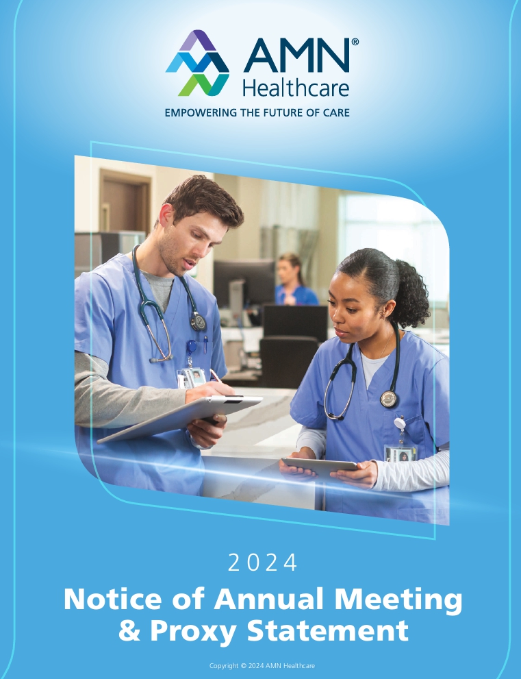 AMN Healthcare is the leader and innovator in total talent solutions for healthcare organizations across the nation. The Company provides access to the most comprehensive network of quality healthcare professionals through its innovative recruitment strategies and breadth of career opportunities. With insights and expertise, AMN Healthcare helps providers optimize their workforce to successfully reduce complexity, increase efficiency and improve patient outcomes. AMN total talent solutions include managed services programs, clinical and interim healthcare leaders, temporary staffing, executive search solutions, vendor management systems, recruitment process outsourcing, predictive modeling, language interpretation services, revenue cycle solutions, credentialing and other services. Clients include acute-care hospitals, community health centers and clinics, physician practice groups, retail and urgent care centers, home health facilities, schools and many other healthcare settings. AMN Healthcare is committed to fostering and maintaining a diverse team that reflects the communities we serve. Our commitment to the inclusion of many different backgrounds, experiences and perspectives enables our innovation and leadership in the healthcare services industry. For more information about AMN Healthcare, visit www.amnhealthcare.com. FORWARD-LOOKING STATEMENTS This Proxy includes estimates, projections, statements related to our business plans, objectives, initiatives, strategies, practices, and expected operating Statement results that may constitute “forward-looking statements” within the meaning of Section 27A of the Securities Act of 1933, as amended, and Section 21E of the Securities Exchange Act of 1934, as amended. Such statements include, among others, the supply-demand imbalance for healthcare professionals and increasing need for our technology and workforce services, the ability to gain market share across a continuum of outsourced and insourced workforce models, the momentum and results from our strategic investments and process improvements, the ability to grow our technology-enabled solutions and digital capabilities and the anticipated demand for such services, the needs of healthcare organizations and our ability meet those needs, the ability of our branding initiatives to drive greater recognition of our presence in the marketplace for workforce solutions, our ability to innovate and improve patient outcomes, and performance for our company and our clients, our ability to accomplish our ESG commitments, our ability to attract and retain quality healthcare professionals and corporate team members, anticipated growth, acquisition and divestitures and their results on future operations, future economic conditions and performance, plans, objectives and strategies for future operations and growth, performance goals, actions related to our 2024 compensation, and other characterizations of future events or circumstances. The Company based these forward-looking statements on its current expectations, estimates, and projections about future events and the industry in which it operates using information currently available to it. Actual results could differ materially from those discussed in, or implied by, these forward-looking statements. Forward-looking statements are identified by words such as “believe,” “anticipate,” “expect,” “intend,” “plan,” “will,” “may,” “estimates,” variations of such words and other similar expressions. In addition, any statements that refer to expectations, projections or other characterizations of future events or circumstances are forward-looking statements. Factors that could cause actual results to differ from those implied by the forward-looking statements contained in the shareholder letter are set forth in the Company’s Annual Report on Form 10-K for the year ended December 31, 2023 and its other periodic reports as well as the Company’s current and other reports filed from time to time with the Securities and Exchange Commission. Be advised that developments subsequent to the shareholder letter are likely to cause these statements to become outdated with the passage of time. The Company makes available additional information regarding the non-GAAP financial measures on the Company’s website at https://ir.amnhealthcare.com/static-files/01cf6097-256e-4fd7-9f29-2e723d635968. This Proxy Statement includes several website addresses and references to additional materials found on those websites. These websites and materials are not incorporated by reference herein. |