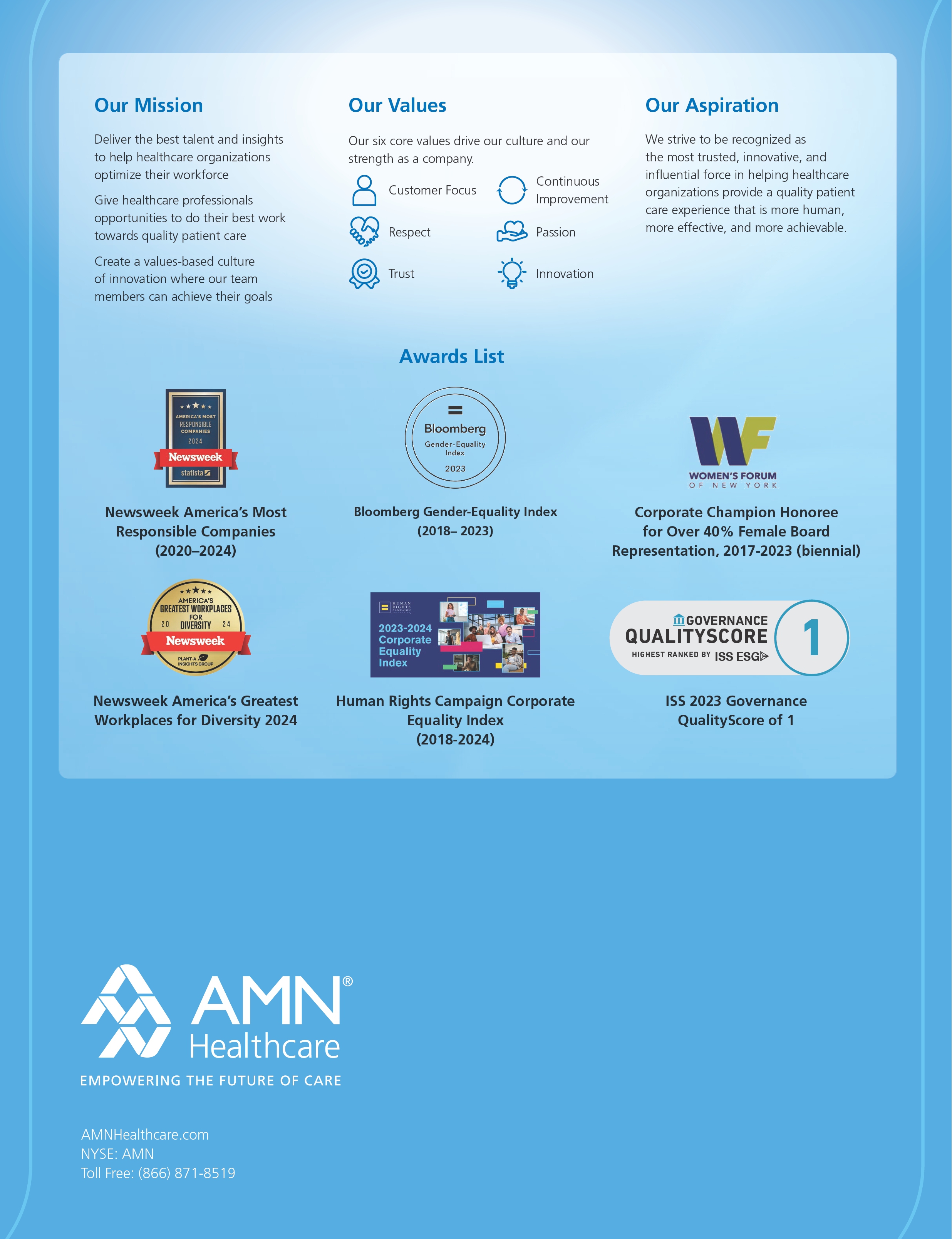 | ● | Delivering on our Unique Value Proposition as OneAMN. You will increasingly see the company communicate as OneAMN. More than a slogan, our OneAMN initiative that began in 2023 unifies our different company identities and solutions under the powerful, market-leading AMN Healthcare brand experience. It also crystallizes our total talent management approach, underscoring the extensive menu of integrated solutions we bring to clients to meet their permanent, flexible and contingent talent needs. |