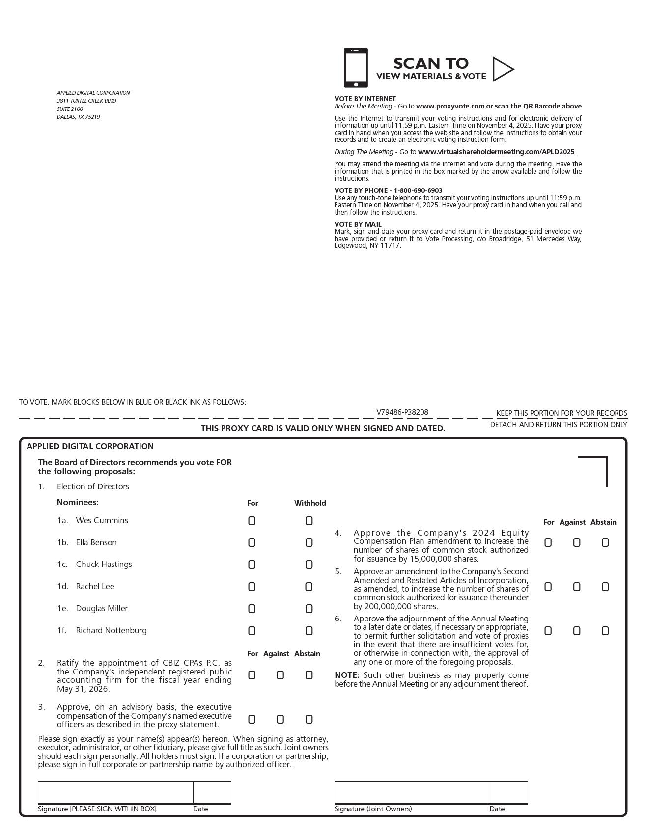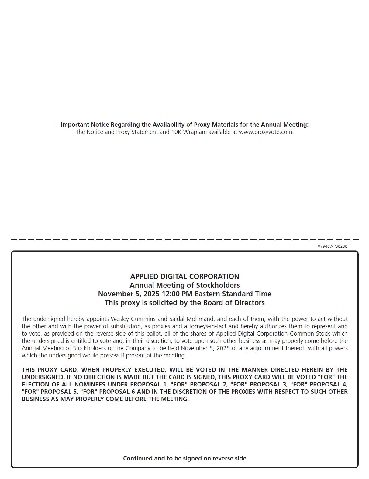 You are cordially invited to attend the Annual Meeting of Stockholders (the “Annual Meeting”) of Applied Digital Corporation (the “Company”) to be held on November 5, 2025, at 12:00 p.m., Eastern Time. The Annual Meeting will be held virtually via the Internet at www.virtualshareholdermeeting.com/APLD2025. You will not be able to attend the Annual Meeting at a physical location. At the Annual Meeting, stockholders will act on the following matters: