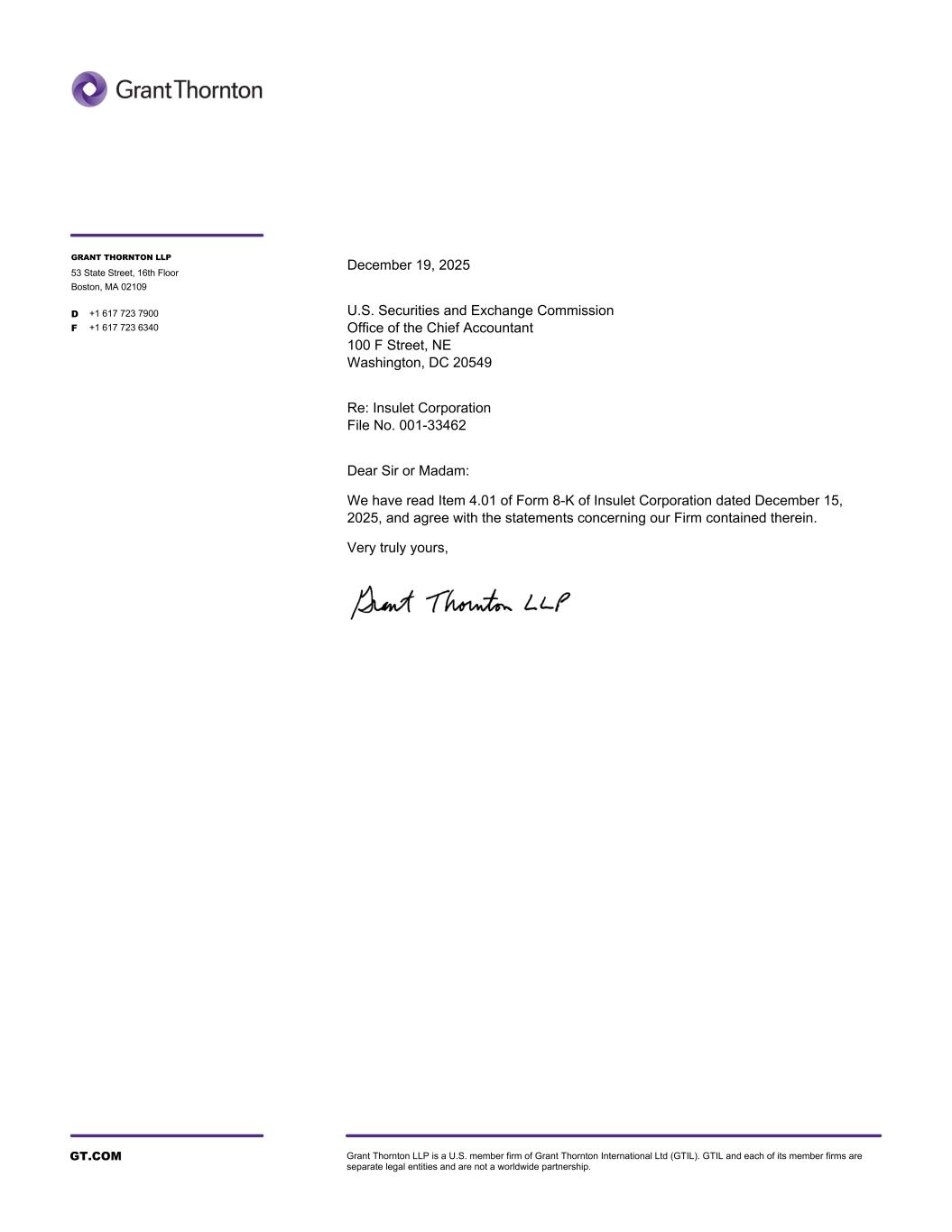 GT.COM Grant Thornton LLP is a U.S. member firm of Grant Thornton International Ltd (GTIL). GTIL and each of its member firms are separate legal entities and are not a worldwide partnership. December 19, 2025 U.S. Securities and Exchange Commission Office of the Chief Accountant 100 F Street, NE Washington, DC 20549 Re: Insulet Corporation File No. 001-33462 Dear Sir or Madam: We have read Item 4.01 of Form 8-K of Insulet Corporation dated December 15, 2025, and agree with the statements concerning our Firm contained therein. Very truly yours, GRANT THORNTON LLP 53 State Street, 16th Floor Boston, MA 02109 D +1 617 723 7900 F +1 617 723 6340
