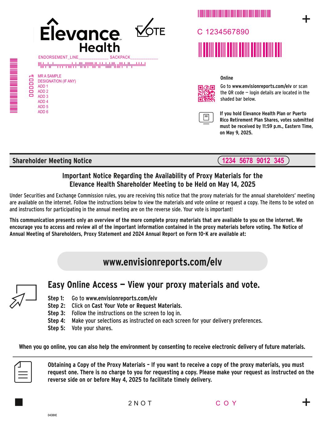 Step 1: Go to www.envisionreports.com/elv Step 2: Click on Cast Your Vote or Request Materials. Step 3: Follow the instructions on the screen to log in. www.envisionreports.com/elv Online Go to www.envisionreports.com/elv or scan the QR code — login details are located in the shaded bar below. Shareholder Meeting Notice 0438HE Important Notice Regarding the Availability of Proxy Materials for the Elevance Health Shareholder Meeting to be Held on May 14, 2025 Under Securities and Exchange Commission rules, you are receiving this notice that the proxy materials for the annual shareholders’ meeting are available on the internet. Follow the instructions below to view the materials and vote online or request a copy. The items to be voted on and instructions for participating in the annual meeting are on the reverse side. Your vote is important! This communication presents only an overview of the more complete proxy materials that are available to you on the internet. We encourage you to access and review all of the important information contained in the proxy materials before voting. The Notice of Annual Meeting of Shareholders, Proxy Statement and 2024 Annual Report on Form 10-K are available at: Obtaining a Copy of the Proxy Materials – If you want to receive a copy of the proxy materials, you must request one. There is no charge to you for requesting a copy. Please make your request as instructed on the reverse side on or before May 4, 2025 to facilitate timely delivery. 2 N O T Easy Online Access — View your proxy materials and vote. When you go online, you can also help the environment by consenting to receive electronic delivery of future materials. The Sample Company Step 4: Make your selections as instructed on each screen for your delivery preferences. Step 5: Vote your shares. If you hold Elevance Health Plan or Puerto Rico Retirement Plan Shares, votes submitted must be received by 11:59 p.m., Eastern Time, on May 9, 2025. MMMMMMMMMMMM M M M M M M M M M 0 0 0 0 0 1 MR A SAMPLE DESIGNATION (IF ANY) ADD 1 ADD 2 ADD 3 ADD 4 ADD 5 ADD 6 ENDORSEMENT_LINE______________ SACKPACK_____________ 1234 5678 9012 345 C 1234567890 C O Y MMMMMMM