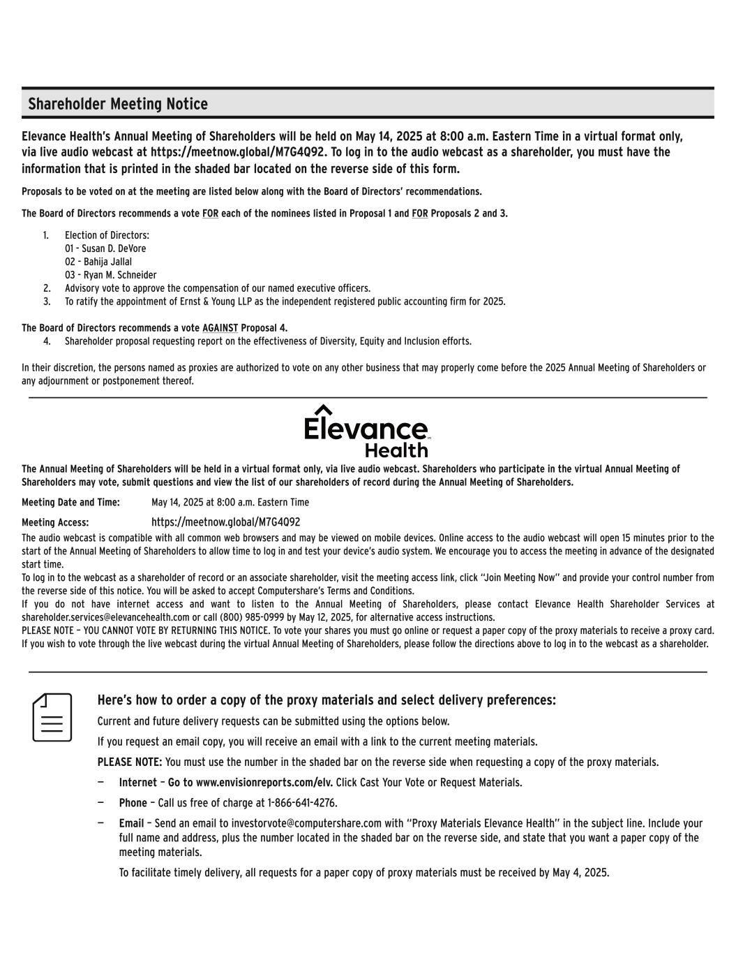 Here’s how to order a copy of the proxy materials and select delivery preferences: Current and future delivery requests can be submitted using the options below. If you request an email copy, you will receive an email with a link to the current meeting materials. PLEASE NOTE: You must use the number in the shaded bar on the reverse side when requesting a copy of the proxy materials. — Internet – Go to www.envisionreports.com/elv. Click Cast Your Vote or Request Materials. — Phone – Call us free of charge at 1-866-641-4276. — Email – Send an email to investorvote@computershare.com with “Proxy Materials Elevance Health” in the subject line. Include your full name and address, plus the number located in the shaded bar on the reverse side, and state that you want a paper copy of the meeting materials. To facilitate timely delivery, all requests for a paper copy of proxy materials must be received by May 4, 2025. Elevance Health’s Annual Meeting of Shareholders will be held on May 14, 2025 at 8:00 a.m. Eastern Time in a virtual format only, via live audio webcast at https://meetnow.global/M7G4Q92. To log in to the audio webcast as a shareholder, you must have the information that is printed in the shaded bar located on the reverse side of this form. Proposals to be voted on at the meeting are listed below along with the Board of Directors’ recommendations. The Board of Directors recommends a vote FOR each of the nominees listed in Proposal 1 and FOR Proposals 2 and 3. 1. Election of Directors: 01 - Susan D. DeVore 02 - Bahija Jallal 03 - Ryan M. Schneider 2. Advisory vote to approve the compensation of our named executive officers. 3. To ratify the appointment of Ernst & Young LLP as the independent registered public accounting firm for 2025. The Board of Directors recommends a vote AGAINST Proposal 4. 4. Shareholder proposal requesting report on the effectiveness of Diversity, Equity and Inclusion efforts. In their discretion, the persons named as proxies are authorized to vote on any other business that may properly come before the 2025 Annual Meeting of Shareholders or any adjournment or postponement thereof. Shareholder Meeting Notice The Annual Meeting of Shareholders will be held in a virtual format only, via live audio webcast. Shareholders who participate in the virtual Annual Meeting of Shareholders may vote, submit questions and view the list of our shareholders of record during the Annual Meeting of Shareholders. Meeting Date and Time: May 14, 2025 at 8:00 a.m. Eastern Time Meeting Access: https://meetnow.global/M7G4Q92 The audio webcast is compatible with all common web browsers and may be viewed on mobile devices. Online access to the audio webcast will open 15 minutes prior to the start of the Annual Meeting of Shareholders to allow time to log in and test your device’s audio system. We encourage you to access the meeting in advance of the designated start time. To log in to the webcast as a shareholder of record or an associate shareholder, visit the meeting access link, click “Join Meeting Now” and provide your control number from the reverse side of this notice. You will be asked to accept Computershare’s Terms and Conditions. If you do not have internet access and want to listen to the Annual Meeting of Shareholders, please contact Elevance Health Shareholder Services at shareholder.services@elevancehealth.com or call (800) 985-0999 by May 12, 2025, for alternative access instructions. PLEASE NOTE – YOU CANNOT VOTE BY RETURNING THIS NOTICE. To vote your shares you must go online or request a paper copy of the proxy materials to receive a proxy card. If you wish to vote through the live webcast during the virtual Annual Meeting of Shareholders, please follow the directions above to log in to the webcast as a shareholder.