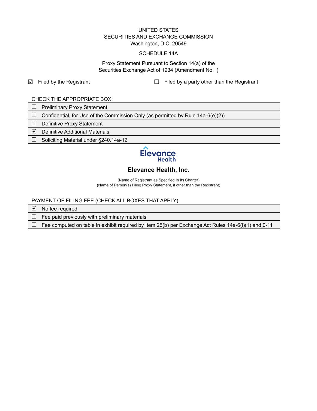 UNITED STATES SECURITIES AND EXCHANGE COMMISSION Washington, D.C. 20549 SCHEDULE 14A Proxy Statement Pursuant to Section 14(a) of the Securities Exchange Act of 1934 (Amendment No. ) ☑ Filed by the Registrant ☐ Filed by a party other than the Registrant CHECK THE APPROPRIATE BOX: ☐ Preliminary Proxy Statement ☐ Confidential, for Use of the Commission Only (as permitted by Rule 14a-6(e)(2)) ☐ Definitive Proxy Statement ☑ Definitive Additional Materials ☐ Soliciting Material under §240.14a-12 Elevance Health, Inc. (Name of Registrant as Specified In Its Charter) (Name of Person(s) Filing Proxy Statement, if other than the Registrant) PAYMENT OF FILING FEE (CHECK ALL BOXES THAT APPLY): ☑ No fee required ☐ Fee paid previously with preliminary materials ☐ Fee computed on table in exhibit required by Item 25(b) per Exchange Act Rules 14a-6(i)(1) and 0-11