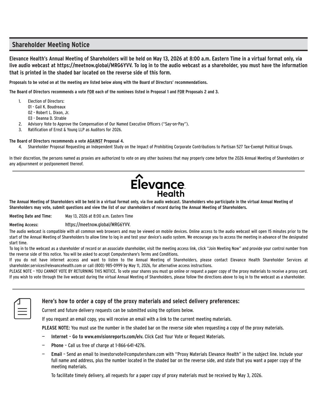 Here’s how to order a copy of the proxy materials and select delivery preferences: Current and future delivery requests can be submitted using the options below. If you request an email copy, you will receive an email with a link to the current meeting materials. PLEASE NOTE: You must use the number in the shaded bar on the reverse side when requesting a copy of the proxy materials. — Internet – Go to www.envisionreports.com/elv. Click Cast Your Vote or Request Materials. — Phone – Call us free of charge at 1-866-641-4276. — Email – Send an email to investorvote@computershare.com with “Proxy Materials Elevance Health” in the subject line. Include your full name and address, plus the number located in the shaded bar on the reverse side, and state that you want a paper copy of the meeting materials. To facilitate timely delivery, all requests for a paper copy of proxy materials must be received by May 3, 2026. Elevance Health’s Annual Meeting of Shareholders will be held on May 13, 2026 at 8:00 a.m. Eastern Time in a virtual format only, via live audio webcast at https://meetnow.global/MRG6YVV. To log in to the audio webcast as a shareholder, you must have the information that is printed in the shaded bar located on the reverse side of this form. Proposals to be voted on at the meeting are listed below along with the Board of Directors’ recommendations. The Board of Directors recommends a vote FOR each of the nominees listed in Proposal 1 and FOR Proposals 2 and 3. 1. Election of Directors: 01 - Gail K. Boudreaux 02 - Robert L. Dixon, Jr. 03 - Deanna D. Strable 2. Advisory Vote to Approve the Compensation of Our Named Executive Officers (“Say-on-Pay”). 3. Ratification of Ernst & Young LLP as Auditors for 2026. The Board of Directors recommends a vote AGAINST Proposal 4. 4. Shareholder Proposal Requesting an Independent Study on the Impact of Prohibiting Corporate Contributions to Partisan 527 Tax-Exempt Political Groups. In their discretion, the persons named as proxies are authorized to vote on any other business that may properly come before the 2026 Annual Meeting of Shareholders or any adjournment or postponement thereof. Shareholder Meeting Notice The Annual Meeting of Shareholders will be held in a virtual format only, via live audio webcast. Shareholders who participate in the virtual Annual Meeting of Shareholders may vote, submit questions and view the list of our shareholders of record during the Annual Meeting of Shareholders. Meeting Date and Time: May 13, 2026 at 8:00 a.m. Eastern Time Meeting Access: https://meetnow.global/MRG6YVV. The audio webcast is compatible with all common web browsers and may be viewed on mobile devices. Online access to the audio webcast will open 15 minutes prior to the start of the Annual Meeting of Shareholders to allow time to log in and test your device’s audio system. We encourage you to access the meeting in advance of the designated start time. To log in to the webcast as a shareholder of record or an associate shareholder, visit the meeting access link, click “Join Meeting Now” and provide your control number from the reverse side of this notice. You will be asked to accept Computershare’s Terms and Conditions. If you do not have internet access and want to listen to the Annual Meeting of Shareholders, please contact Elevance Health Shareholder Services at shareholder.services@elevancehealth.com or call (800) 985-0999 by May 11, 2026, for alternative access instructions. PLEASE NOTE – YOU CANNOT VOTE BY RETURNING THIS NOTICE. To vote your shares you must go online or request a paper copy of the proxy materials to receive a proxy card. If you wish to vote through the live webcast during the virtual Annual Meeting of Shareholders, please follow the directions above to log in to the webcast as a shareholder.
